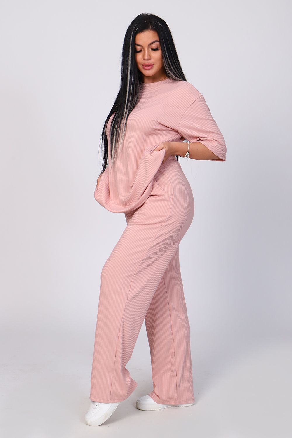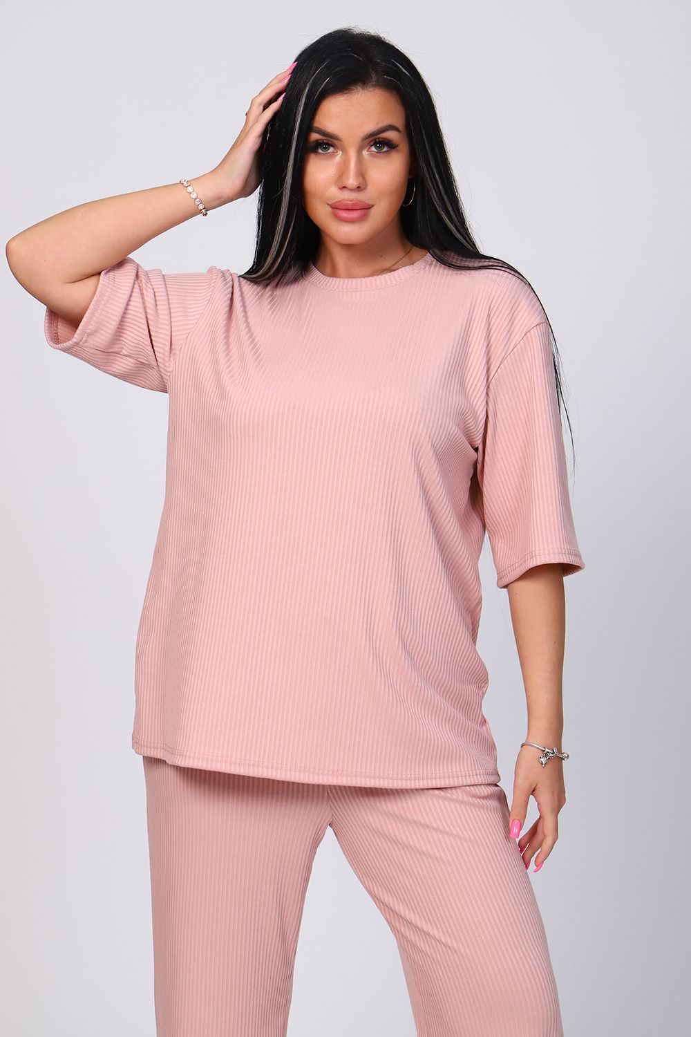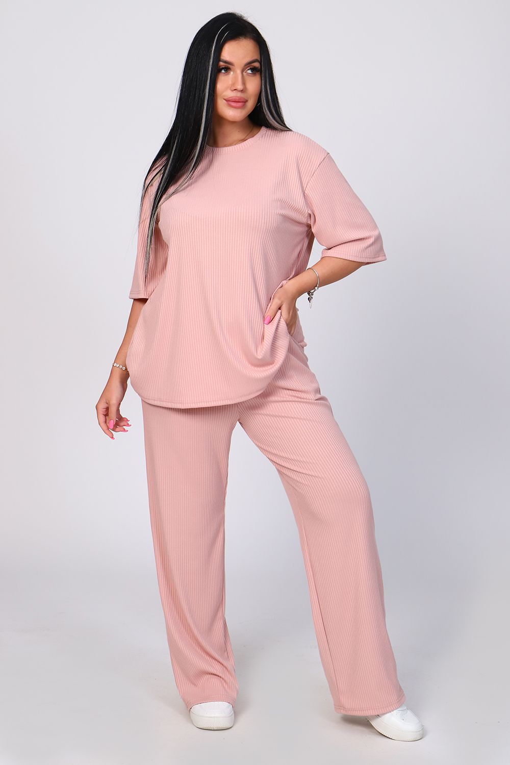 Костюм женский с широкими брюками. Кофта оверсайз удлинённая, рукав до локтя, горловина обработана обтачкой. Брюки длинные, широкие с карманами. Большой размерный ряд. На модели 48 размер.