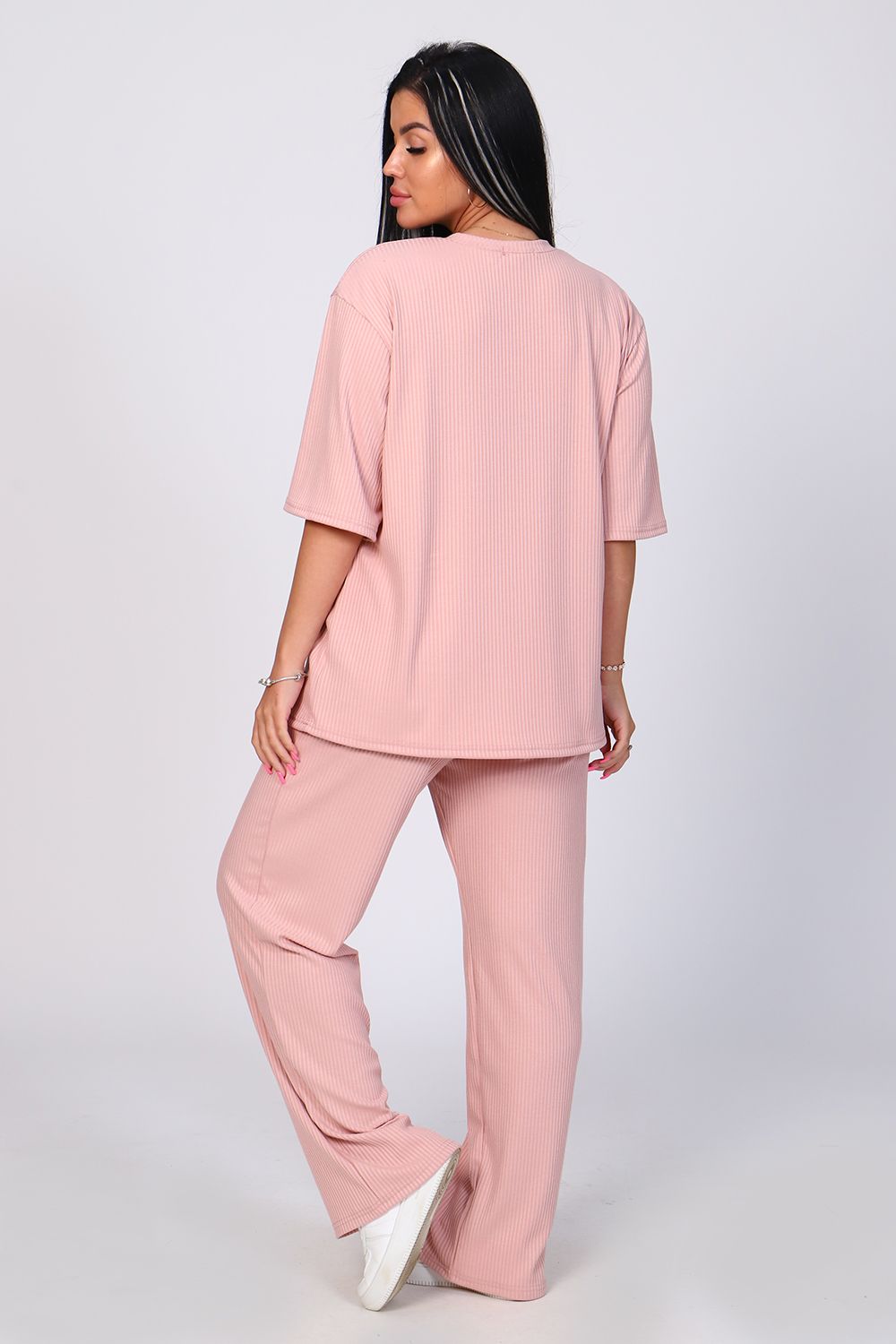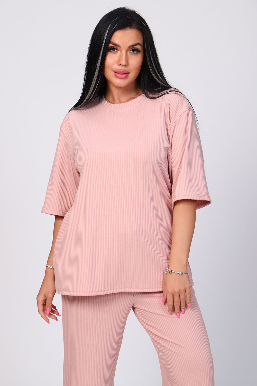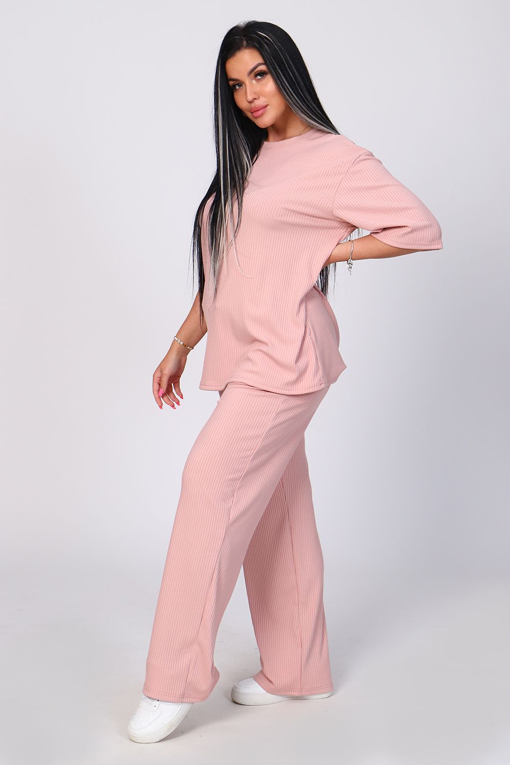 Костюм женский с широкими брюками. Кофта оверсайз удлинённая, рукав до локтя, горловина обработана обтачкой. Брюки длинные, широкие с карманами. Большой размерный ряд. На модели 48 размер.