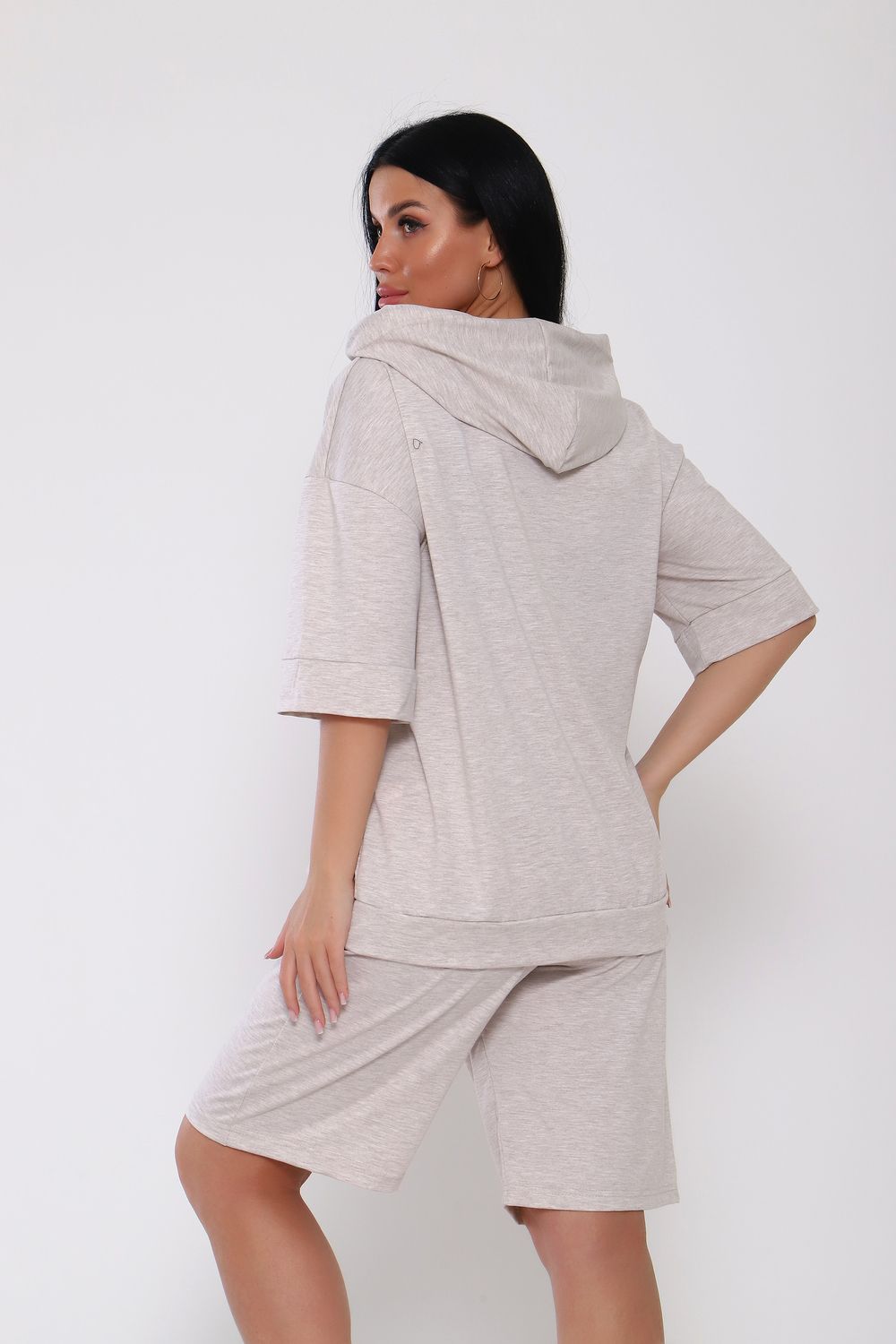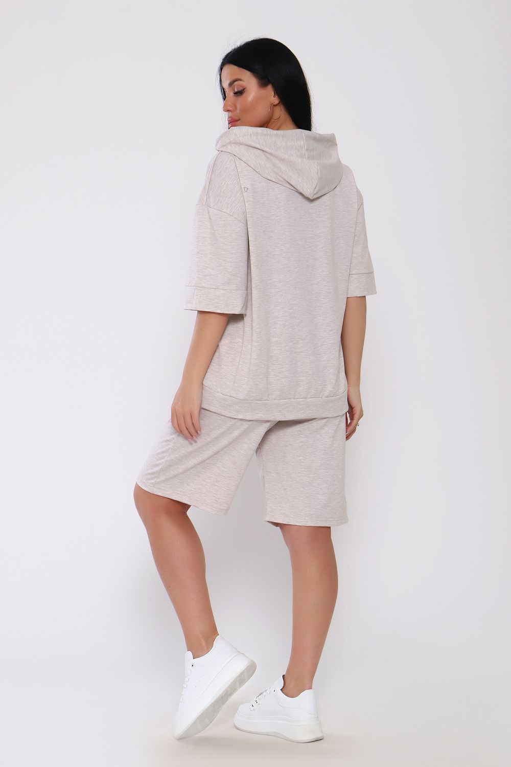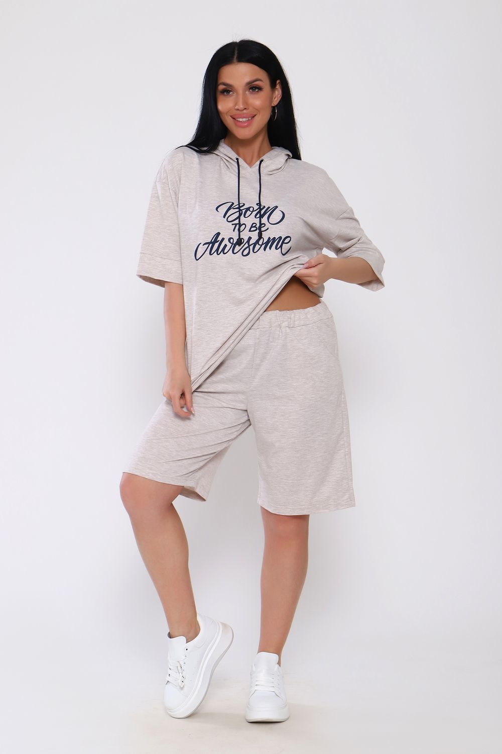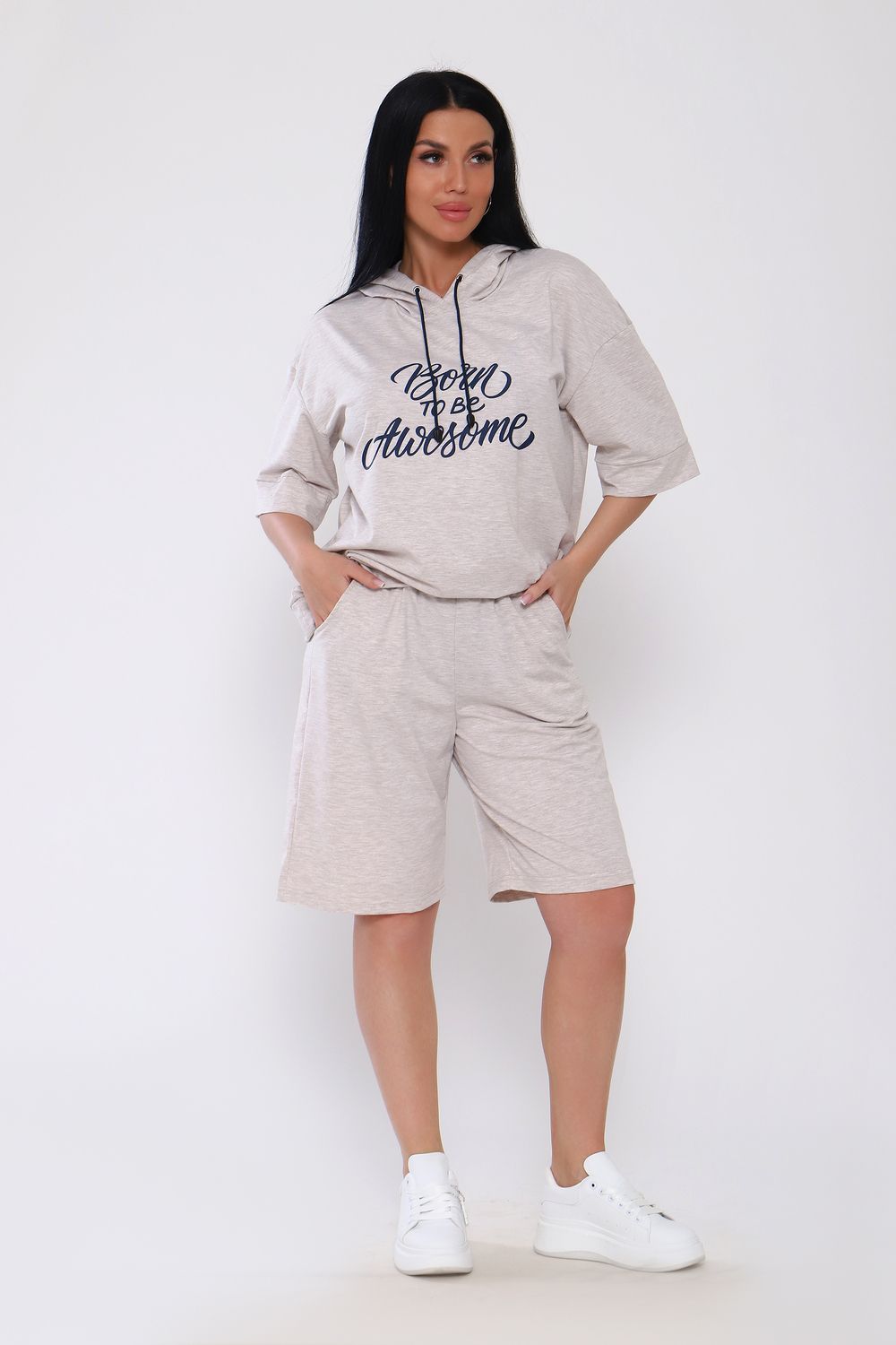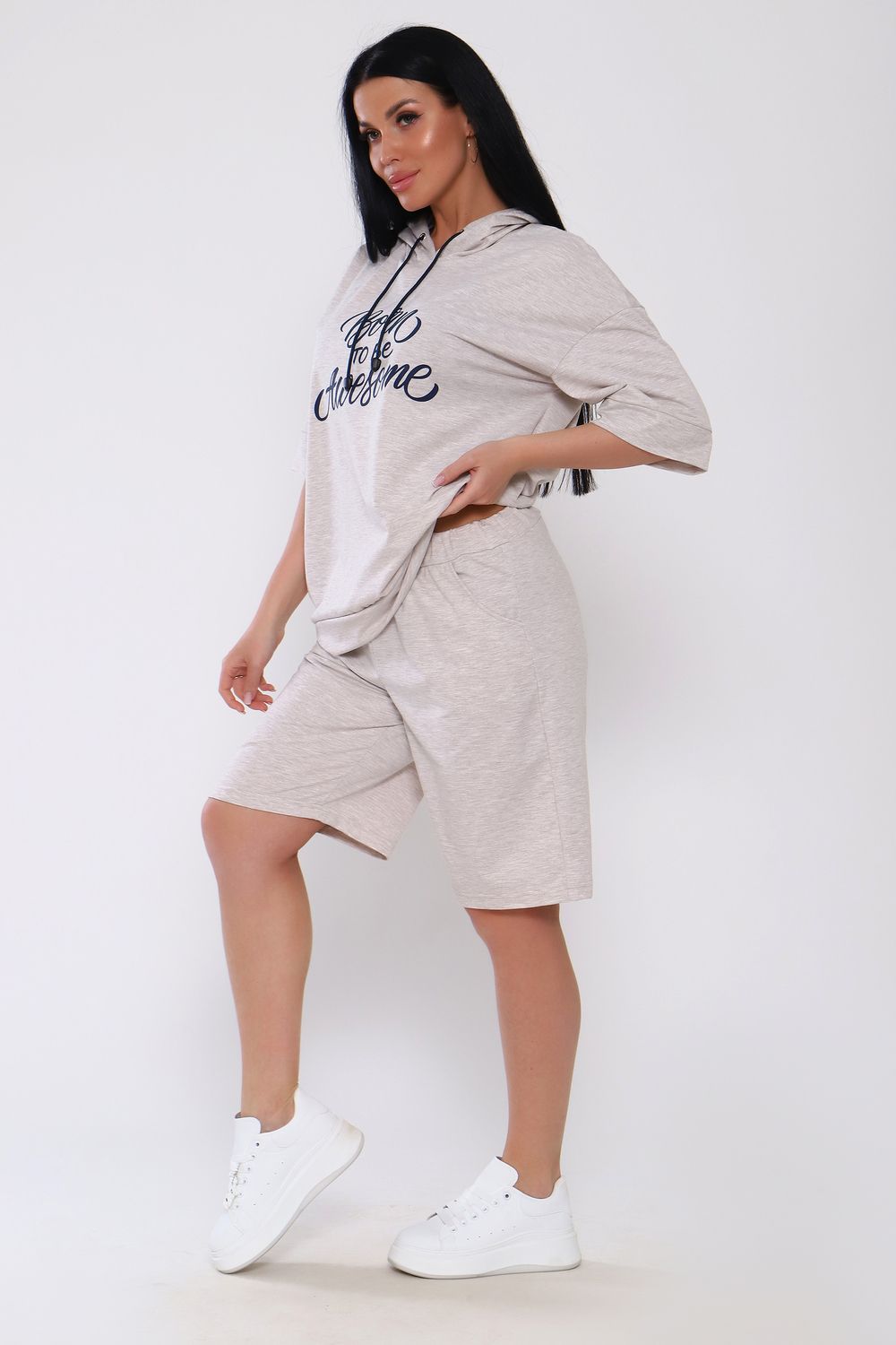 Костюм с шортами из кулирки с лайкрой. Кофта свободная с капюшоном с люверсами и шнурком. По переду принт ,рукав короткий на манжете, длинна до бедра .Шорты свободного покроя с карманами, длина до колена. На модели размер 48-50.Шнурки от партии могут отличаться. Размеры сдвоены.
