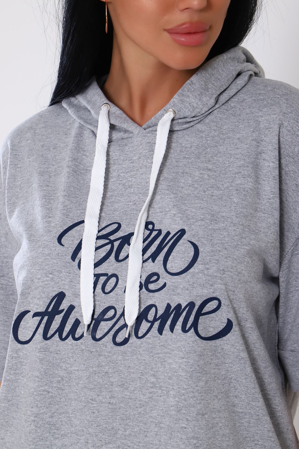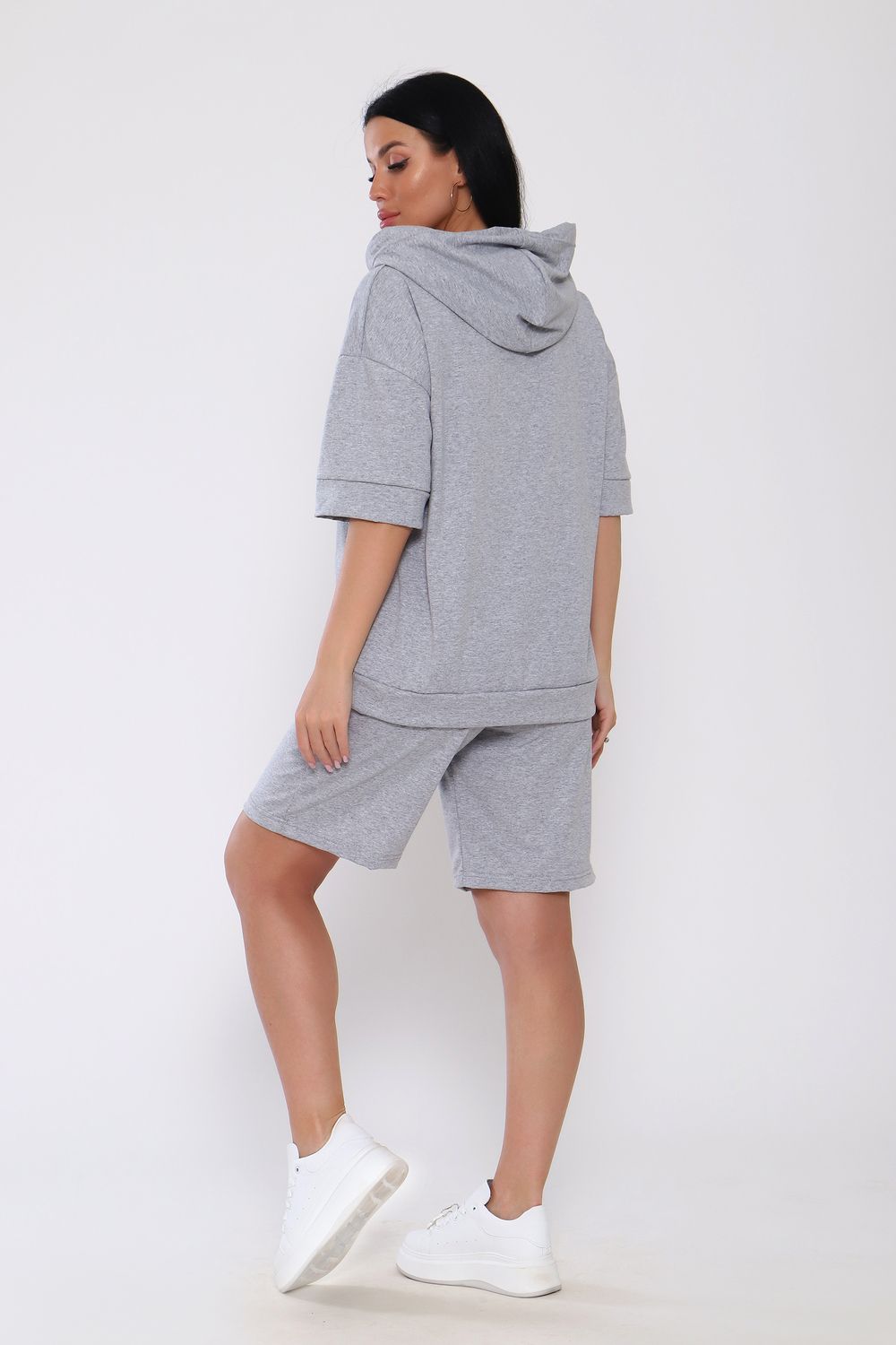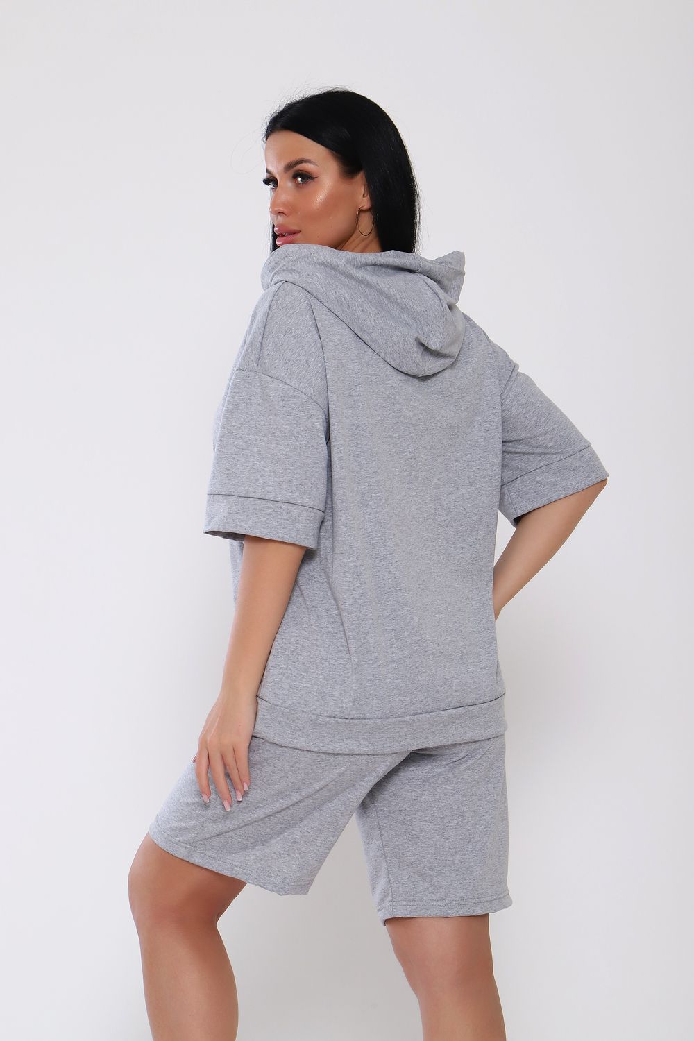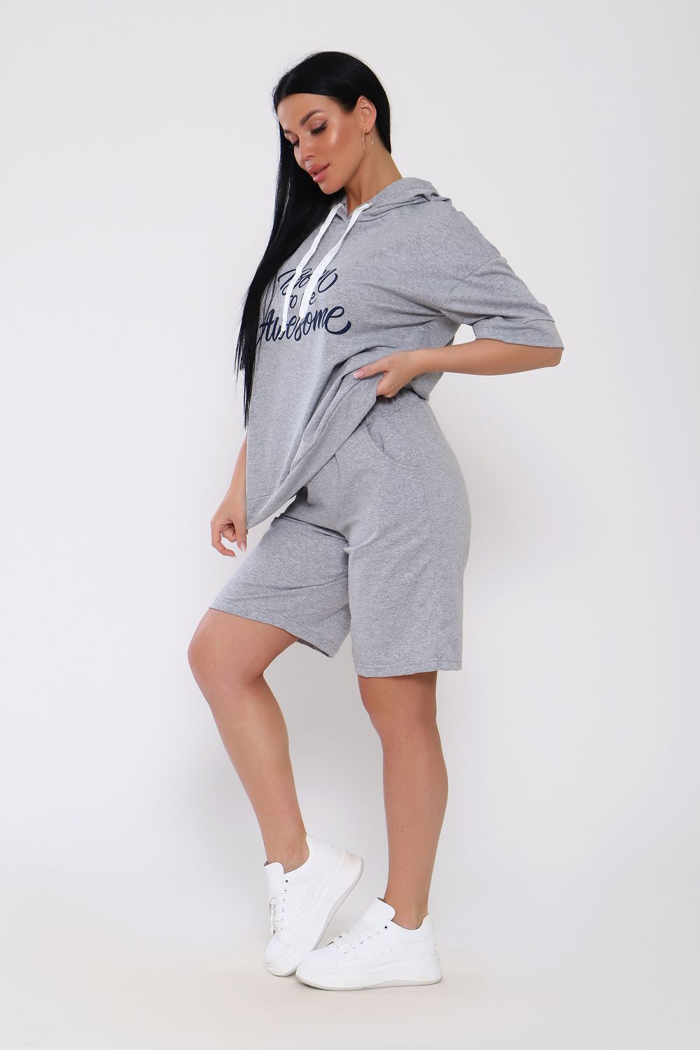 Костюм с шортами из кулирки с лайкрой. Кофта свободная с капюшоном с люверсами и шнурком. По переду принт ,рукав короткий на манжете, длинна до бедра .Шорты свободного покроя с карманами, длина до колена. На модели размер 48-50.Шнурки от партии могут отличаться. Размеры сдвоены.
