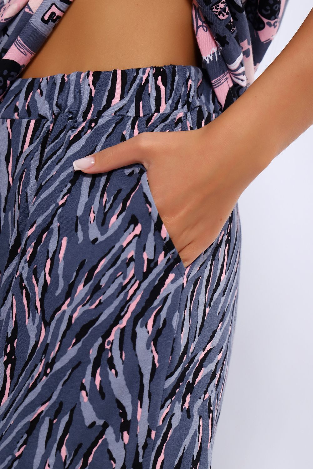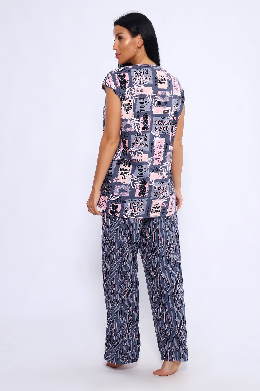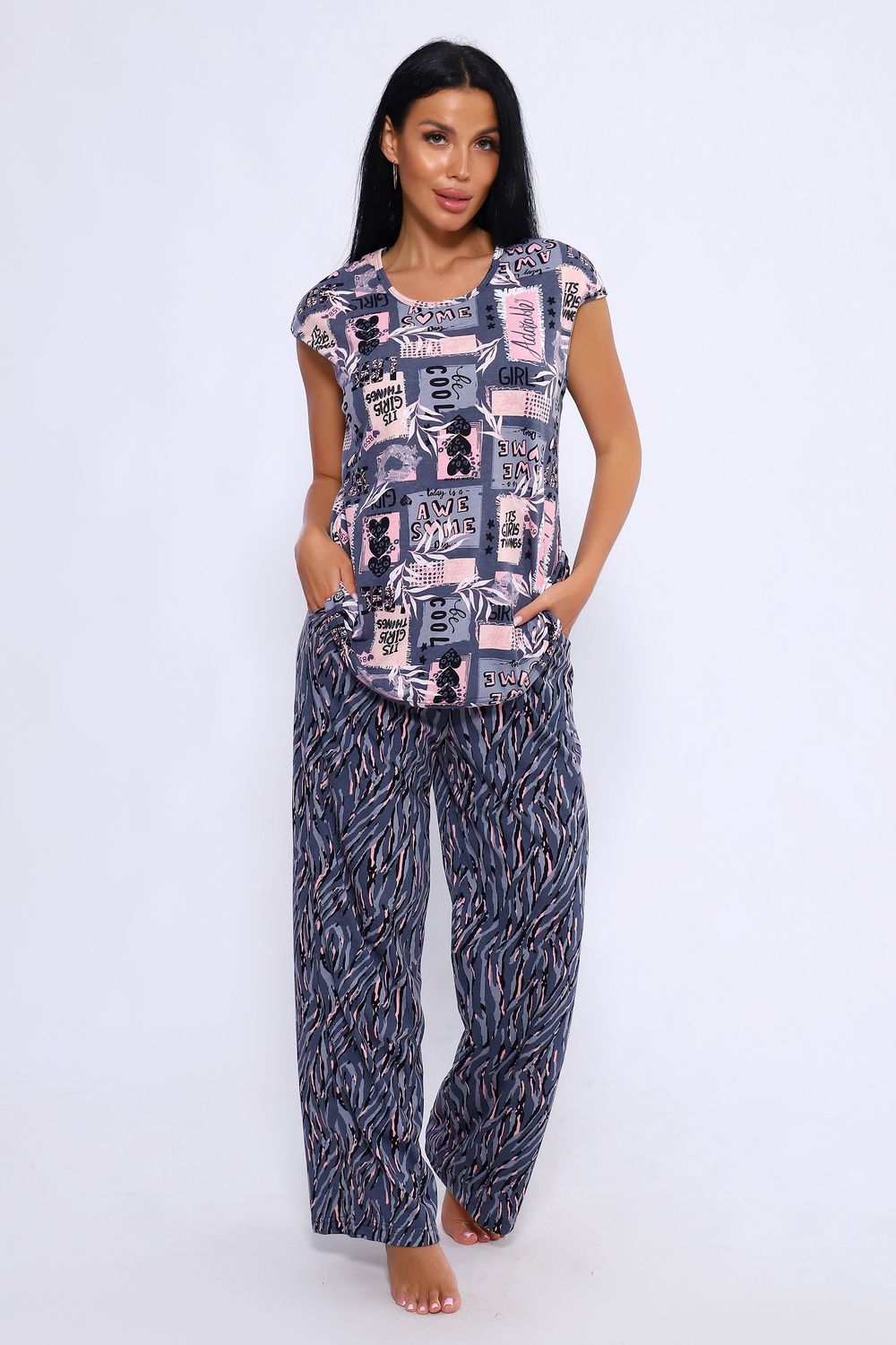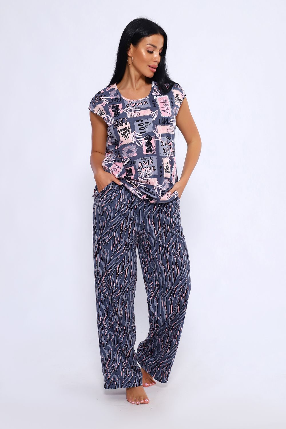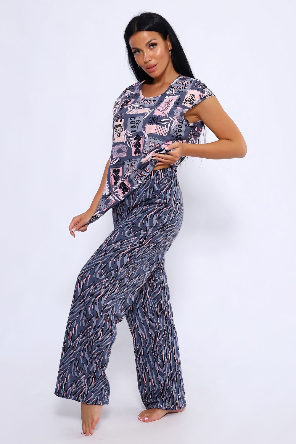 Женский костюм из 100% хлопка, длинные широкие брюки на эластичной резинке по талии шириной 3 см., с карманами в боковых швах и футболкой со спущенным плечом. Брюки в двух расцветках. Интересное и актуальное цветовое сочетание серых и розовых оттенков отличный вариант. Брюки и футболку можно сочетать и с другими предметами вашего гардероба. Ткань не просвечивает и имеет эластичность, обеспечит комфортное времяпрепровождение вашего досуга как дома так и на отдыхе. На фото модель представлена в 48 размере.