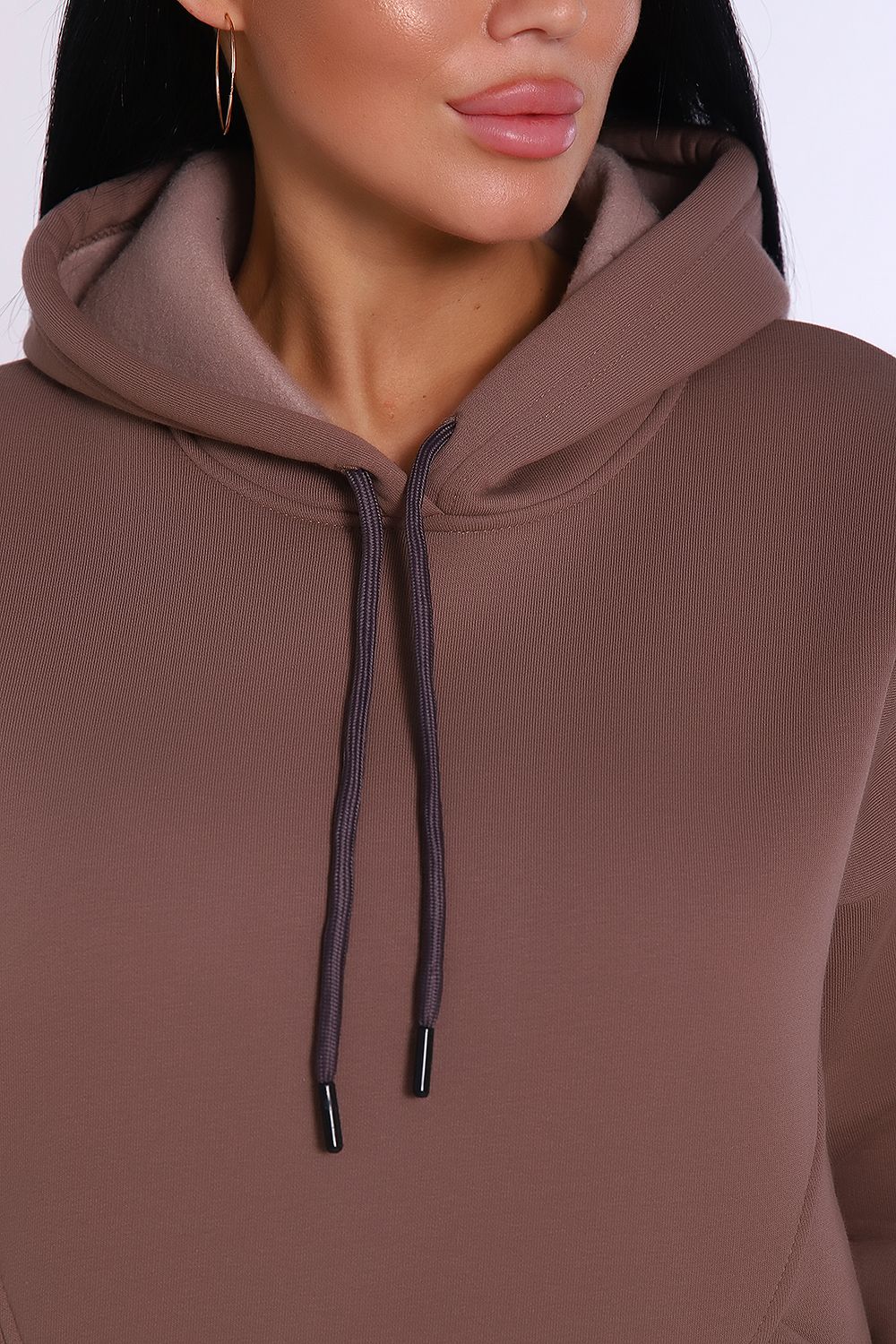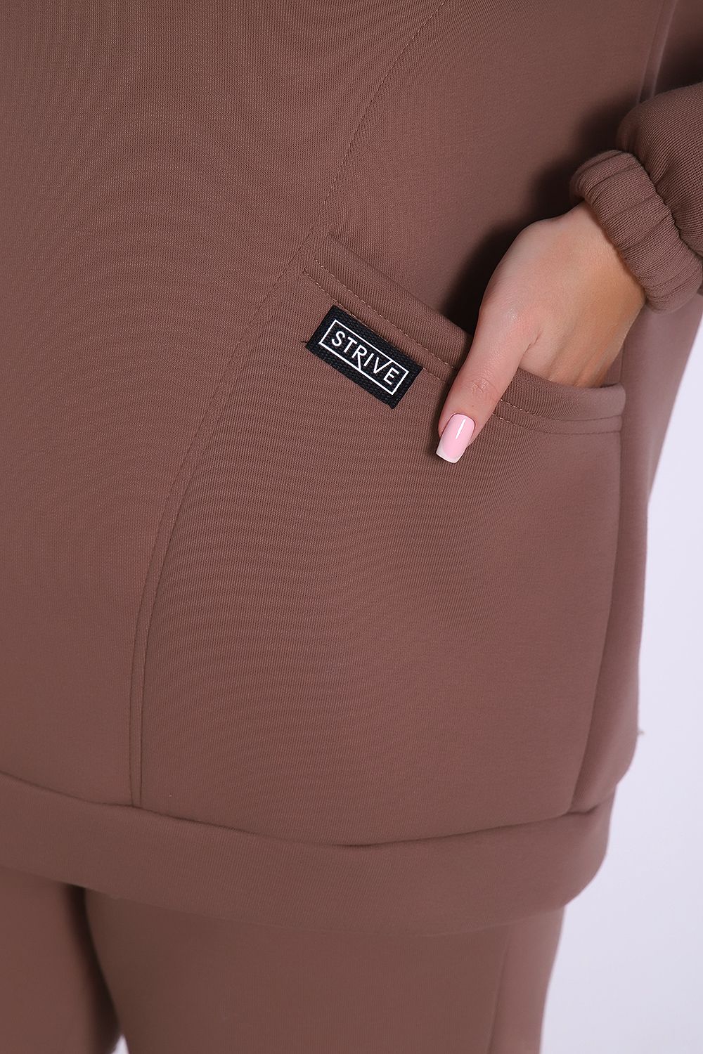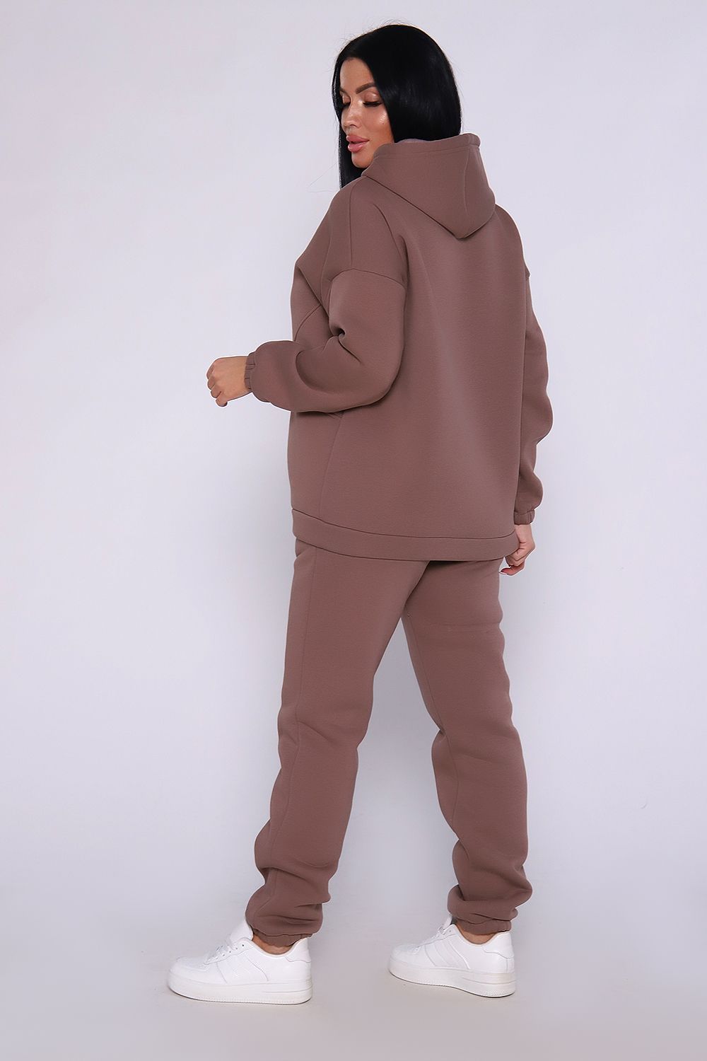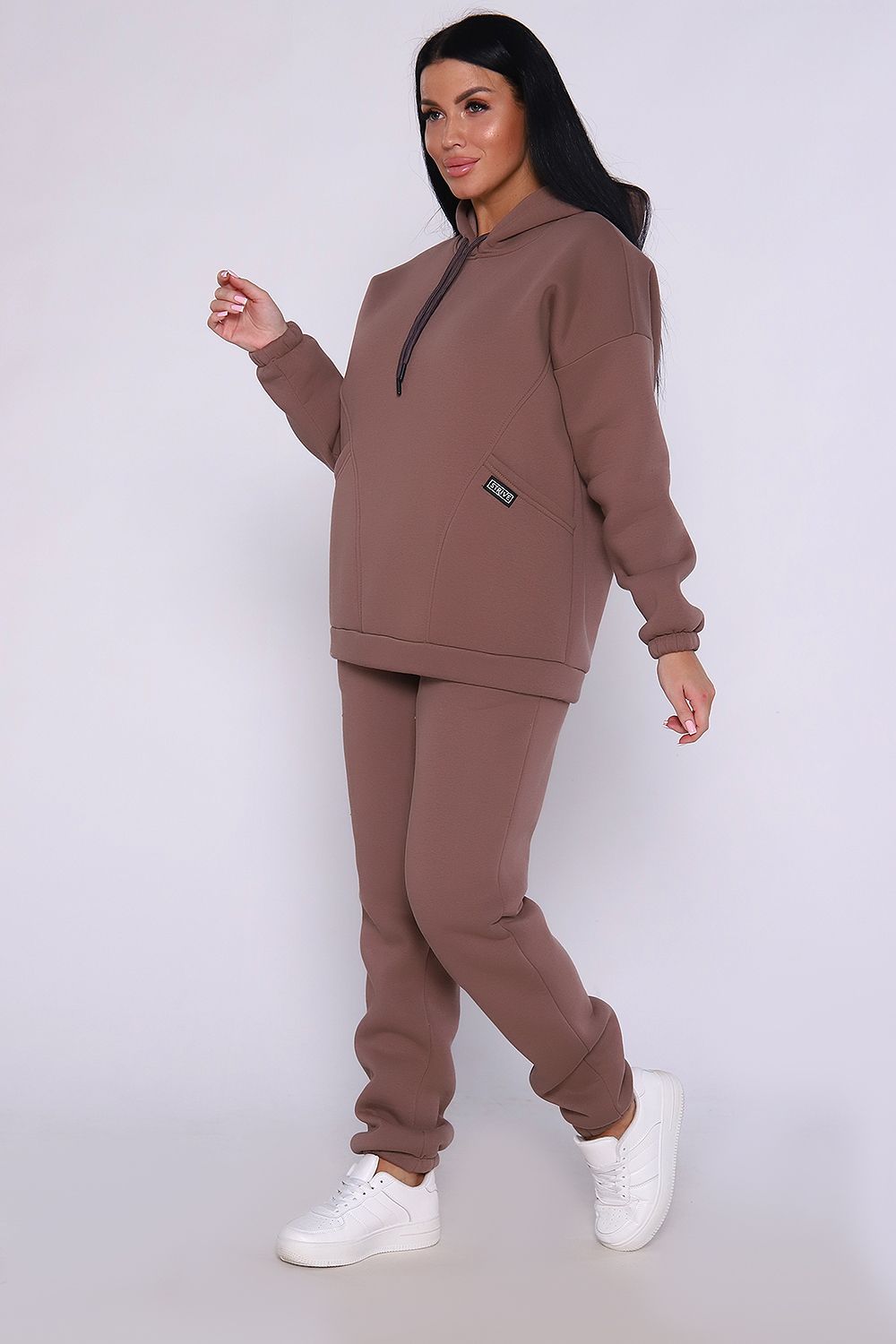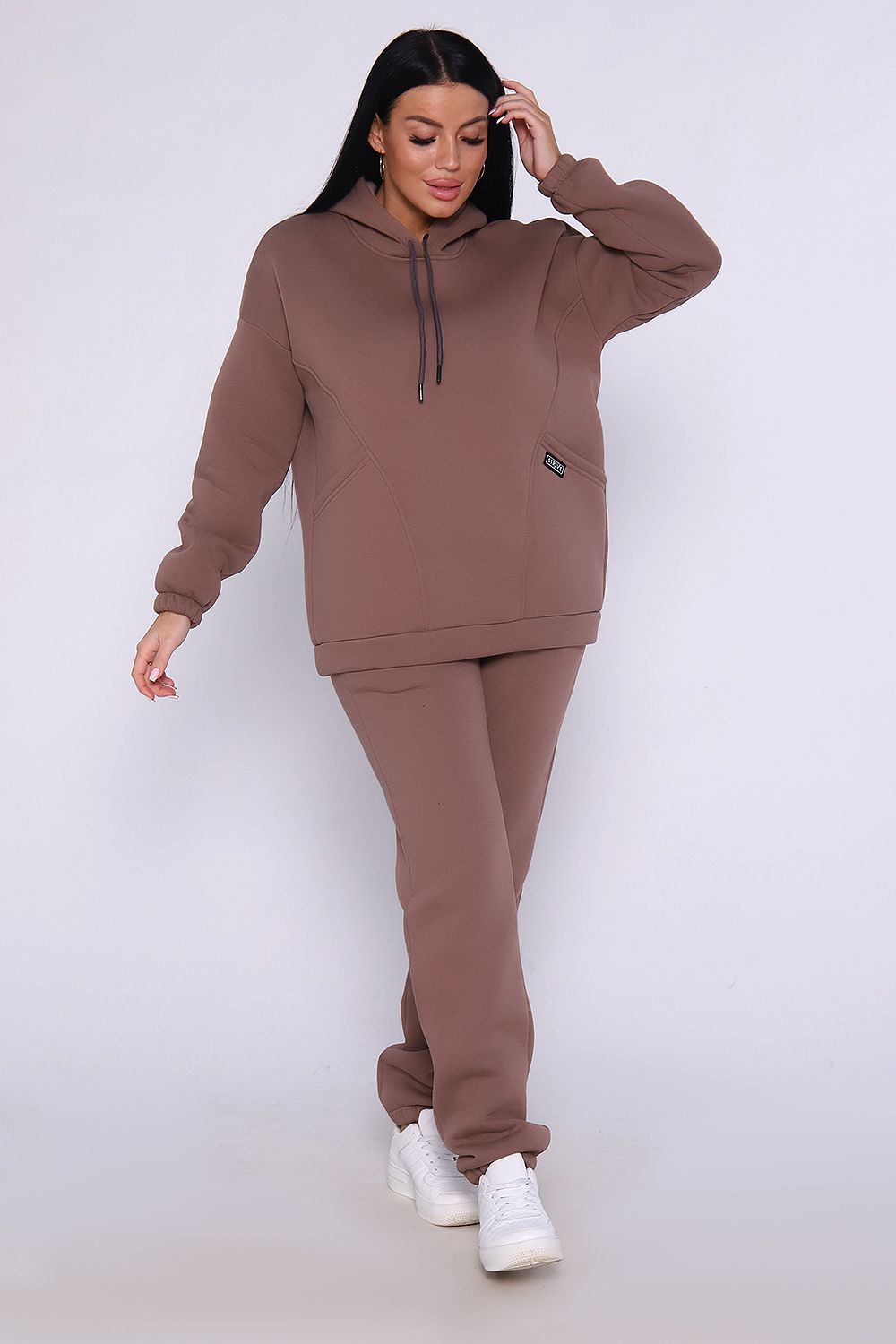 Теплый костюм выполнен из футера 3-х нитки с начесом с содержанием хлопка премиум качества. Костюм состоит из объёмной толстовки в стиле "оверсайз" с накладными карманами и джогеров. Низ брюк и рукавов на толстовке обработан резинкой. Пояс брюк на резинке, для удобства по бокам расположены прорезные карманы. Перед использованием желательно постирать костюм при 30 градусах, тогда излишний ворс примнется.