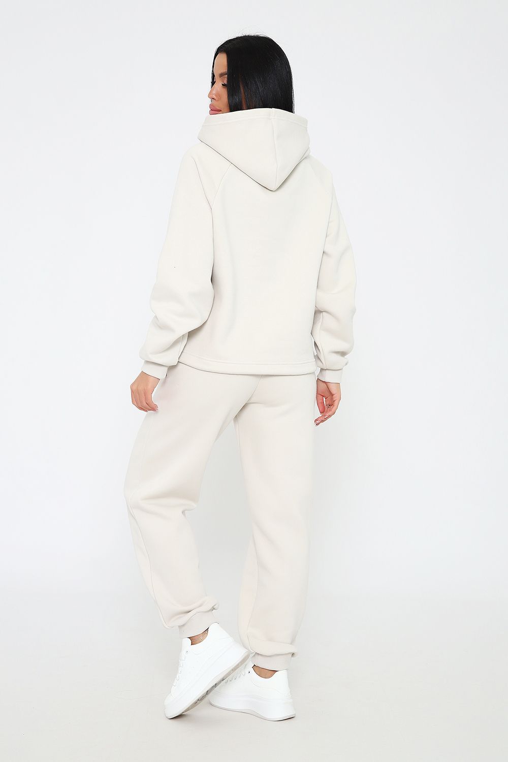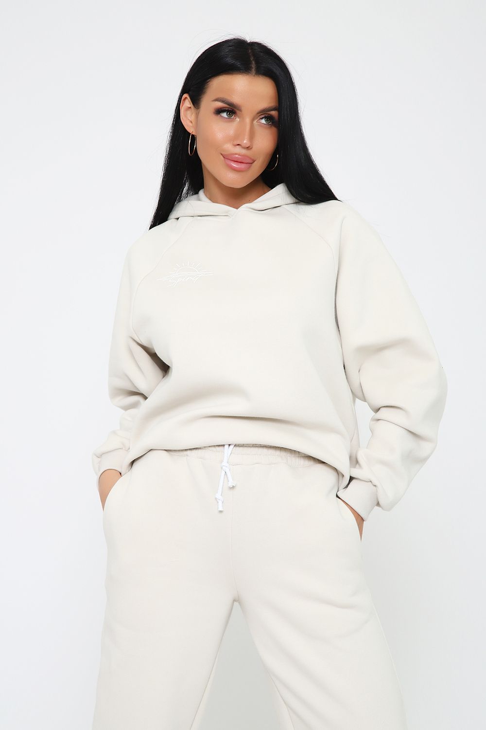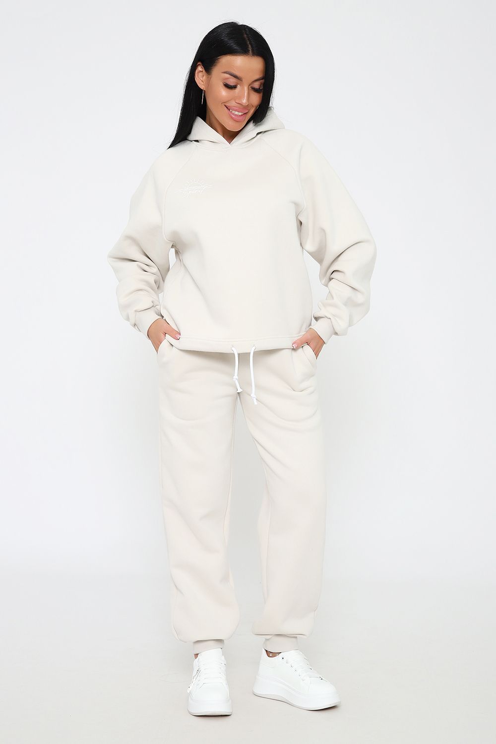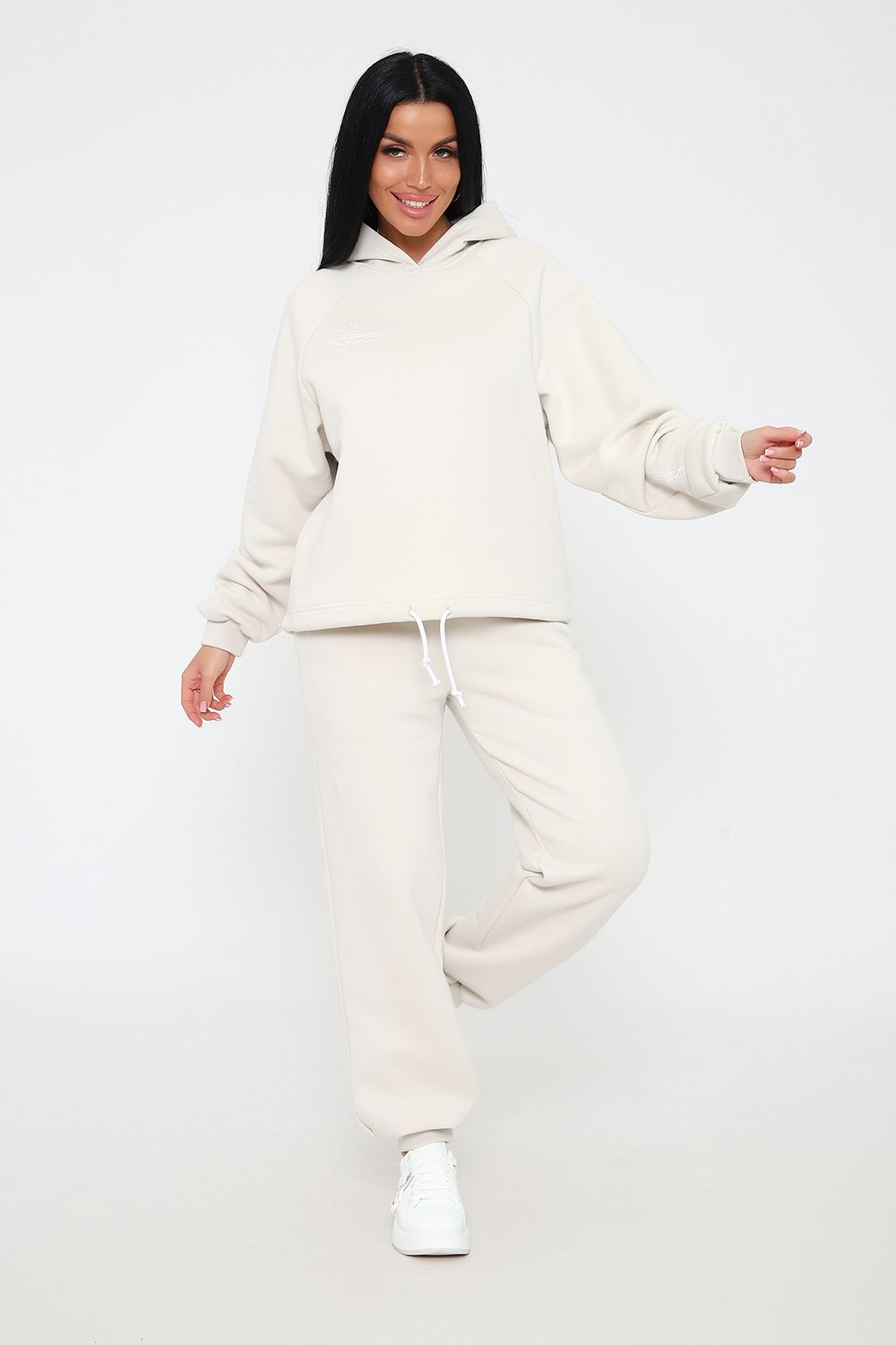 Костюм из облегченного футера с начесом прекрасно садится по фигуре за счет мягкости и дарит комфорт благодаря начесу. Дополнительная фишка печать на рукаве и полочке. В отделке использовано кашкорсе на рукавах и брюках, низ толстовки украшает декоративный шнур.