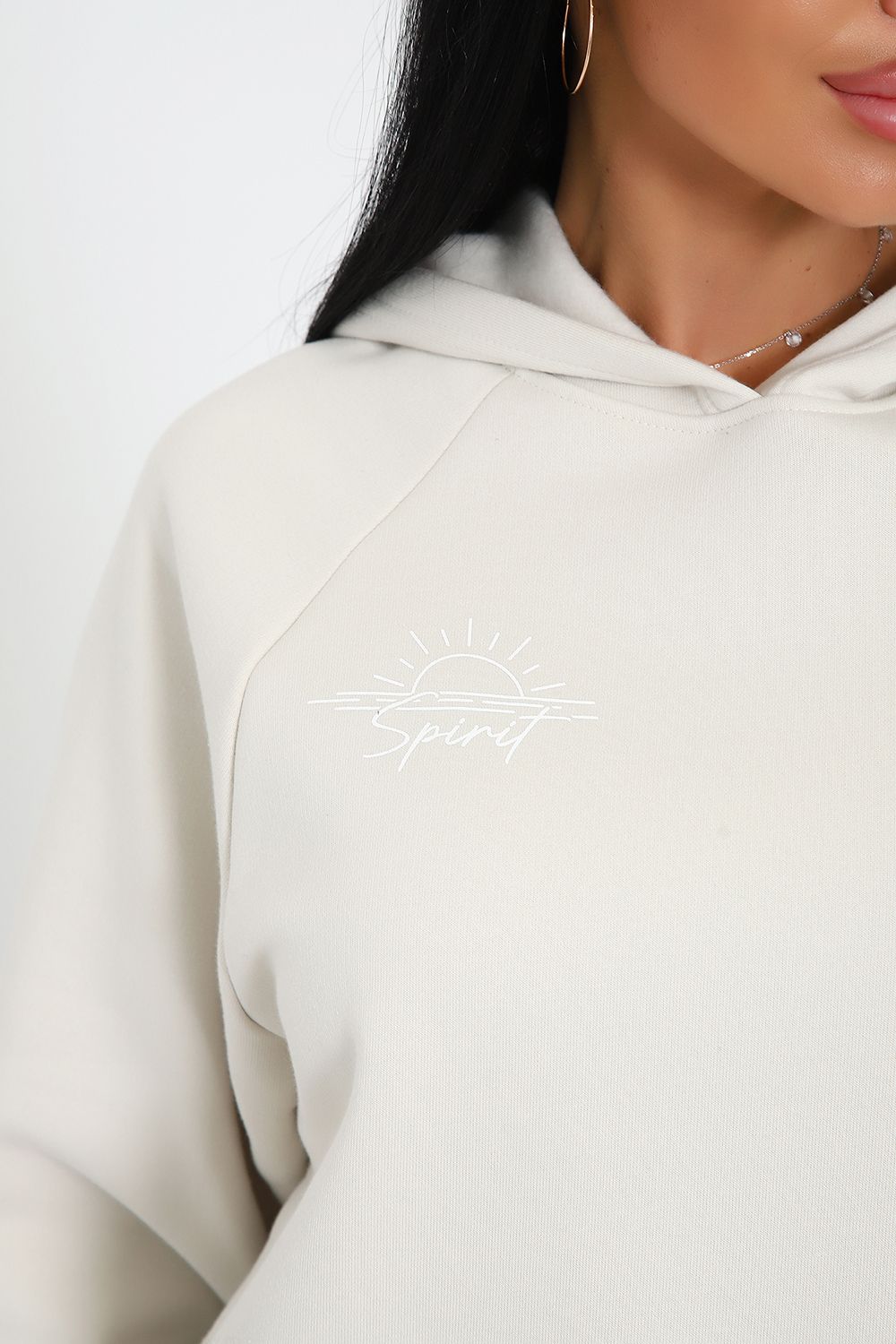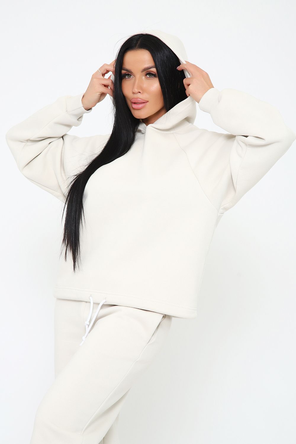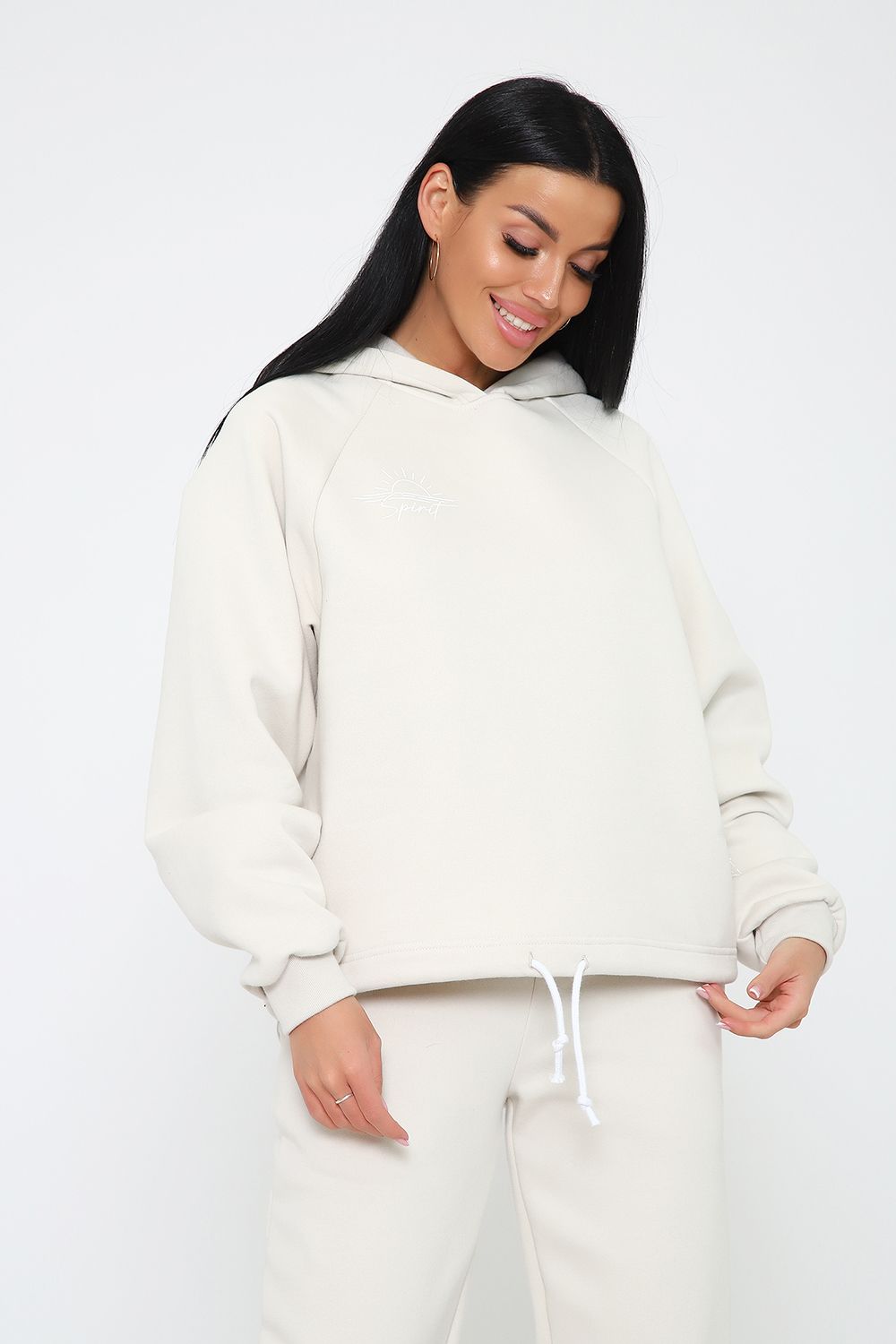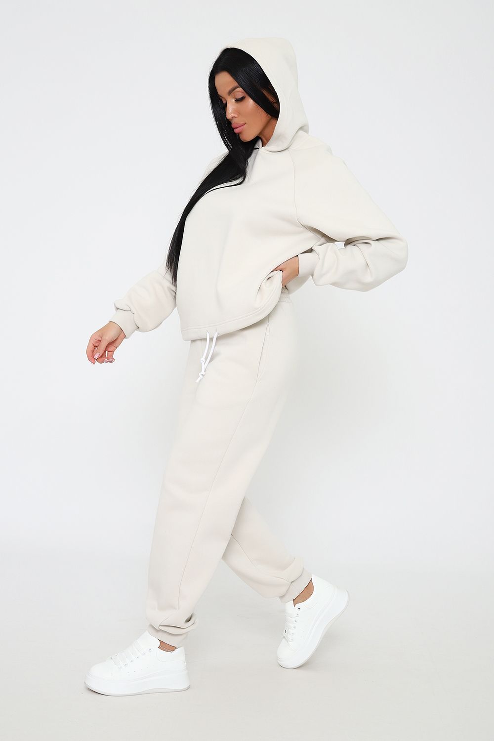 Костюм из облегченного футера с начесом прекрасно садится по фигуре за счет мягкости и дарит комфорт благодаря начесу. Дополнительная фишка печать на рукаве и полочке. В отделке использовано кашкорсе на рукавах и брюках, низ толстовки украшает декоративный шнур.