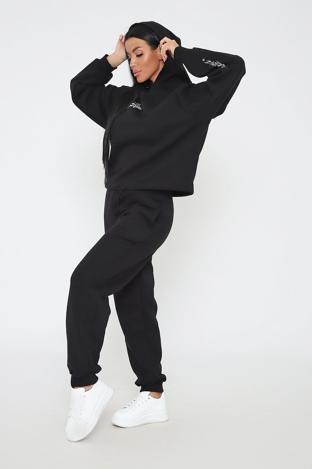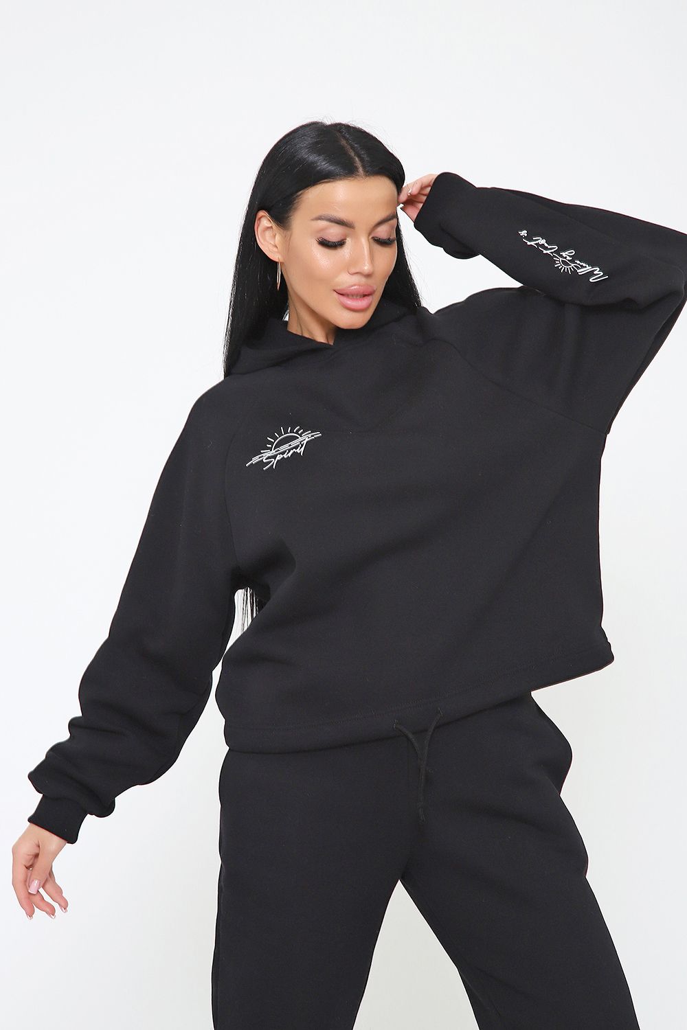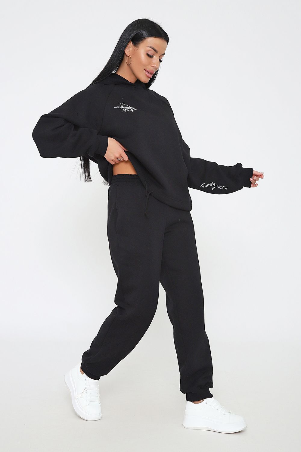 Костюм из облегченного футера с начесом прекрасно садится по фигуре за счет мягкости и дарит комфорт благодаря начесу. Дополнительная фишка печать на рукаве и полочке. В отделке использовано кашкорсе на рукавах и брюках, низ толстовки украшает декоративный шнур.