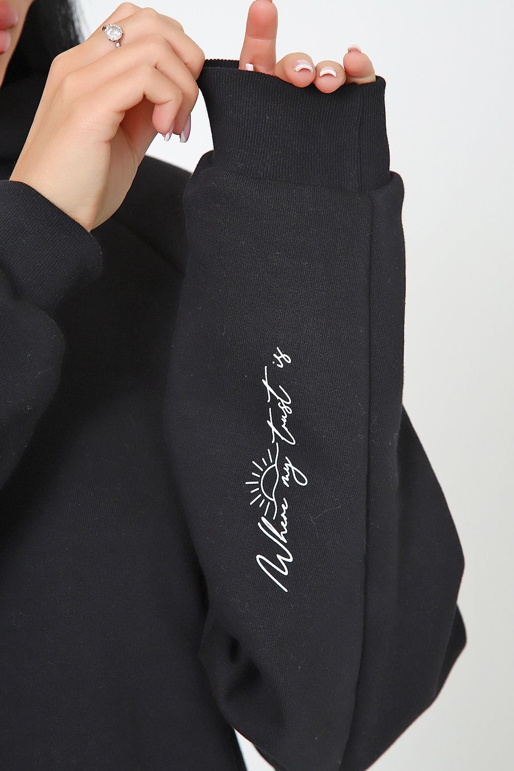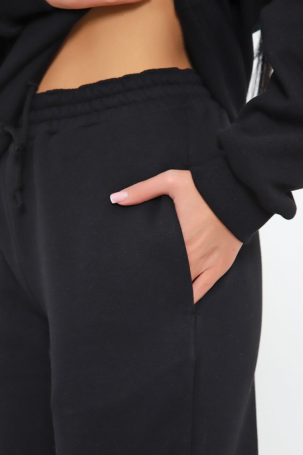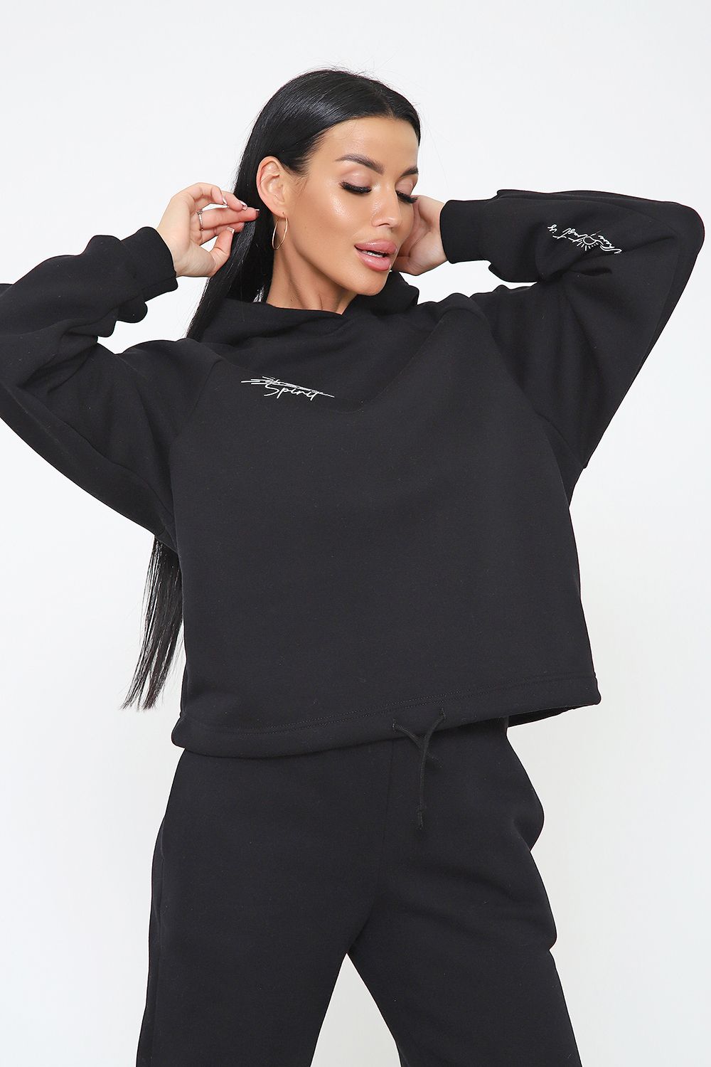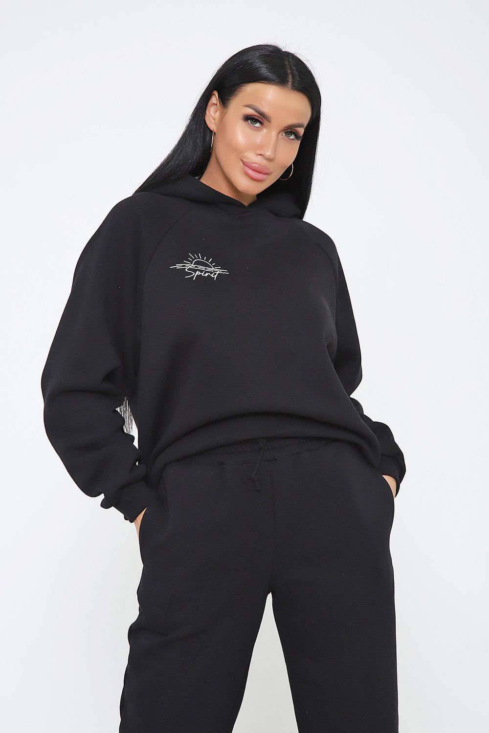 Костюм из облегченного футера с начесом прекрасно садится по фигуре за счет мягкости и дарит комфорт благодаря начесу. Дополнительная фишка печать на рукаве и полочке. В отделке использовано кашкорсе на рукавах и брюках, низ толстовки украшает декоративный шнур.
