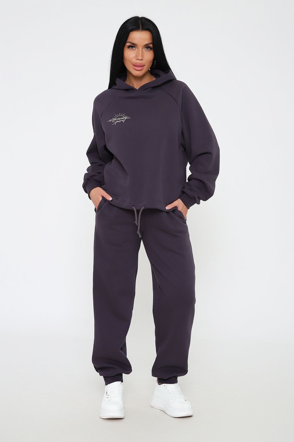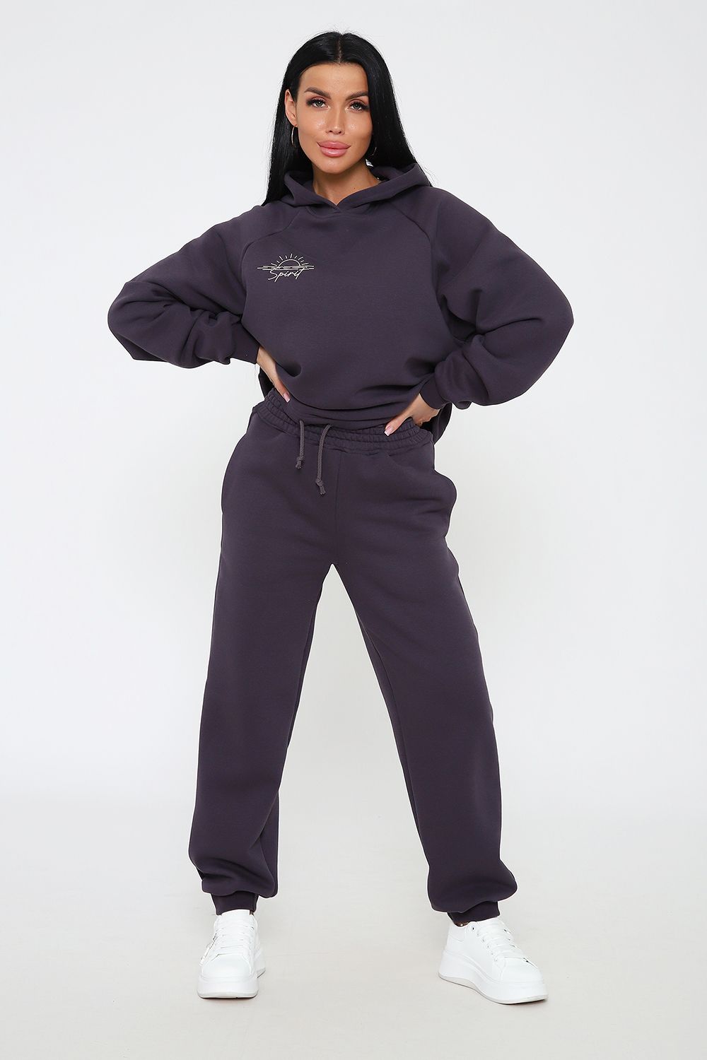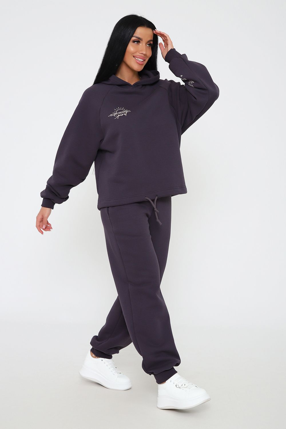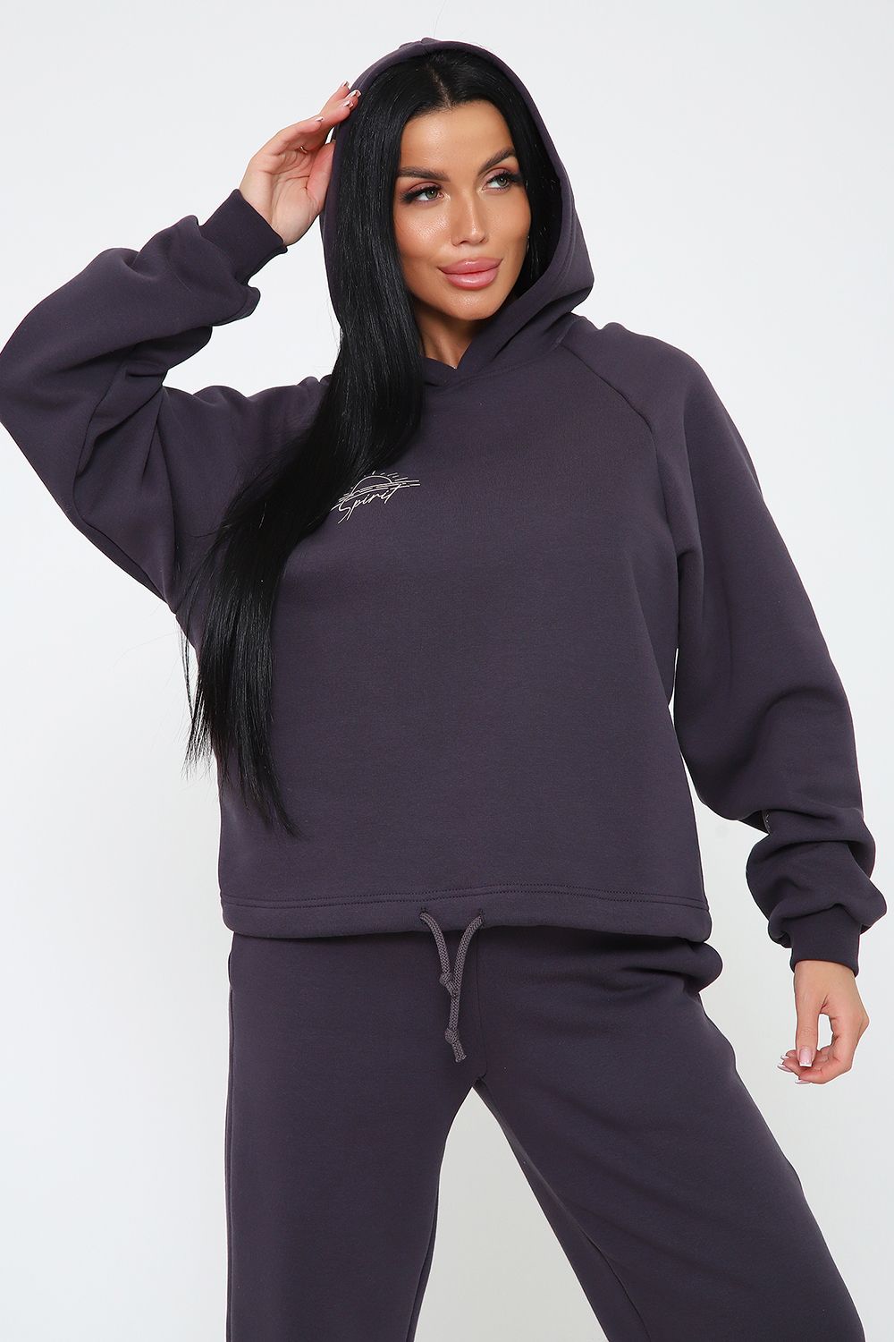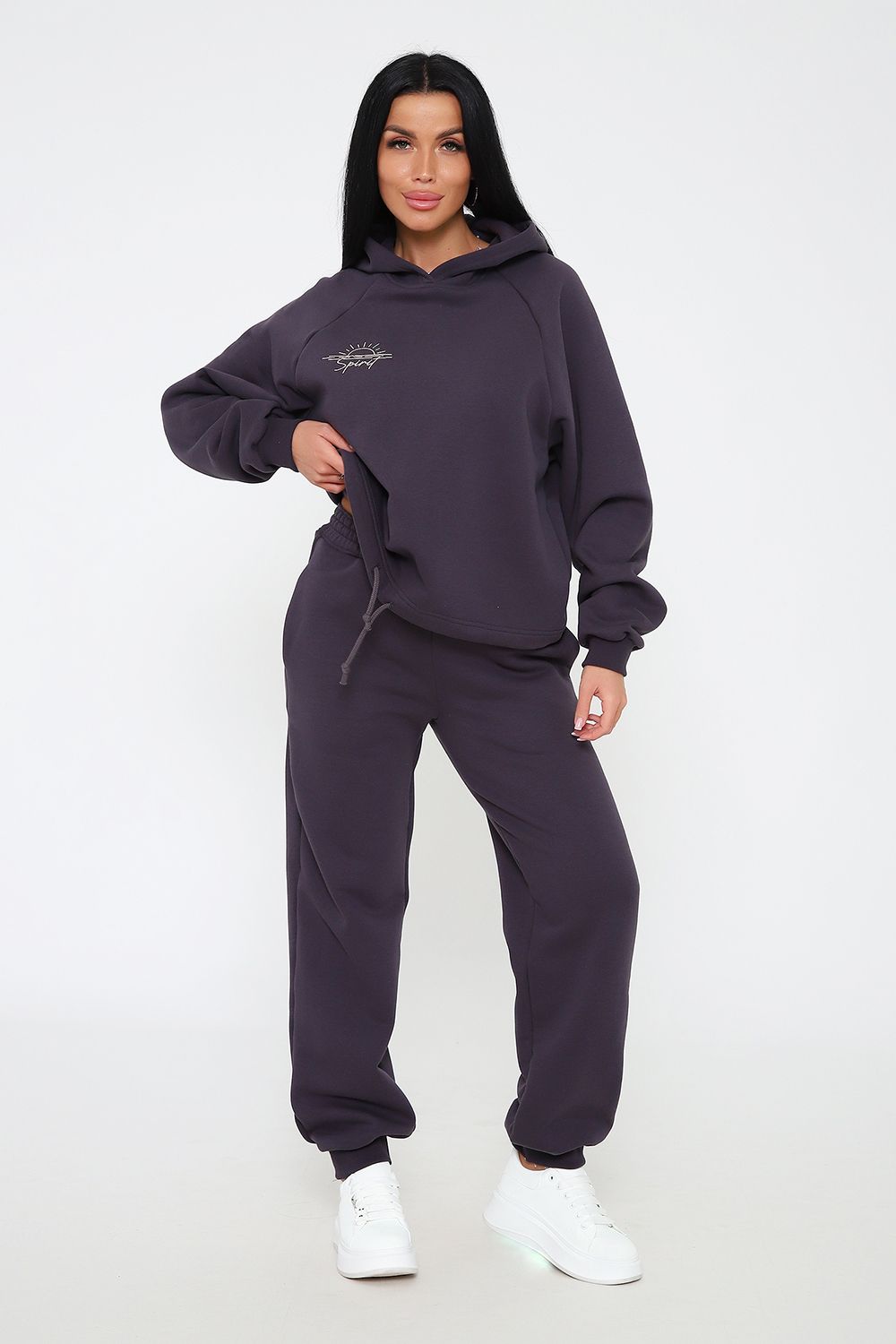 Костюм из облегченного футера с начесом прекрасно садится по фигуре за счет мягкости и дарит комфорт благодаря начесу. Дополнительная фишка печать на рукаве и полочке. В отделке использовано кашкорсе на рукавах и брюках, низ толстовки украшает декоративный шнур.