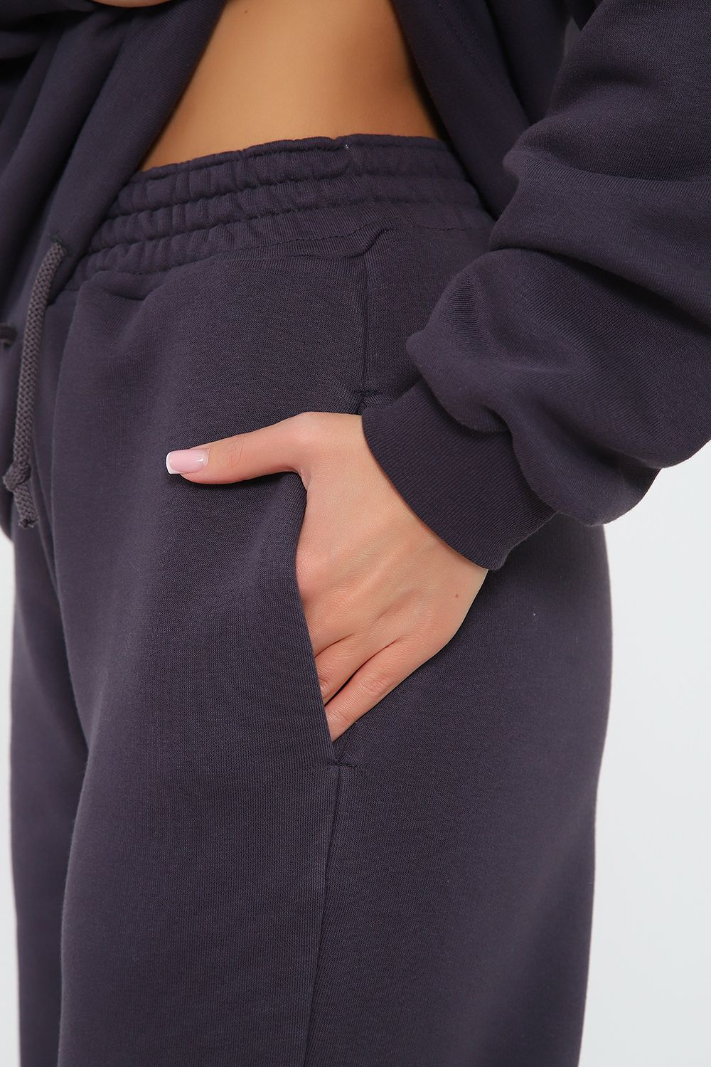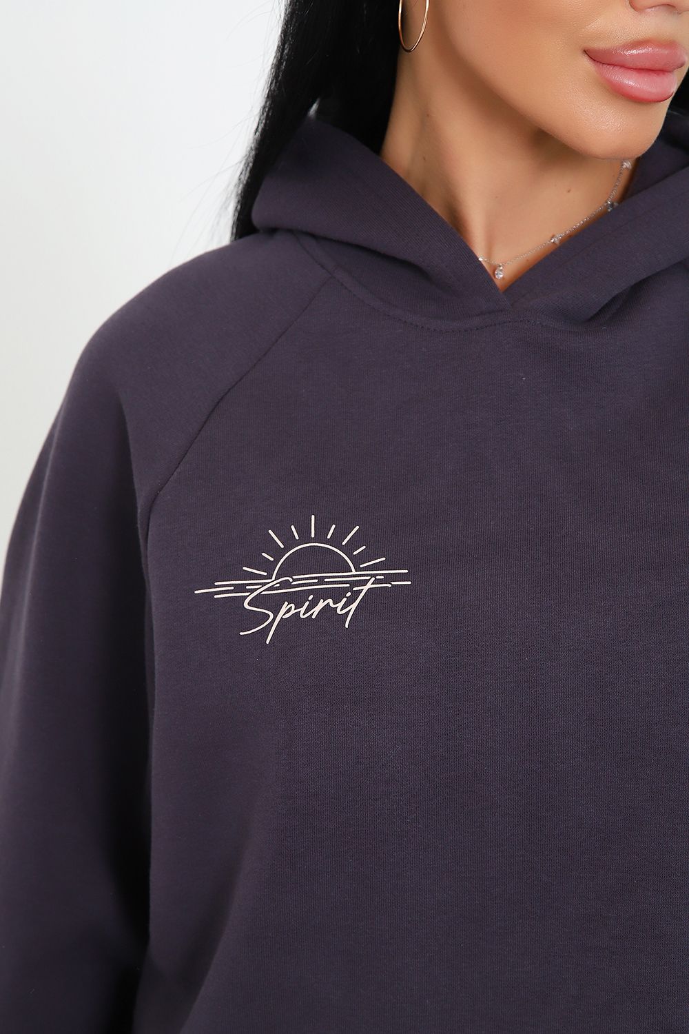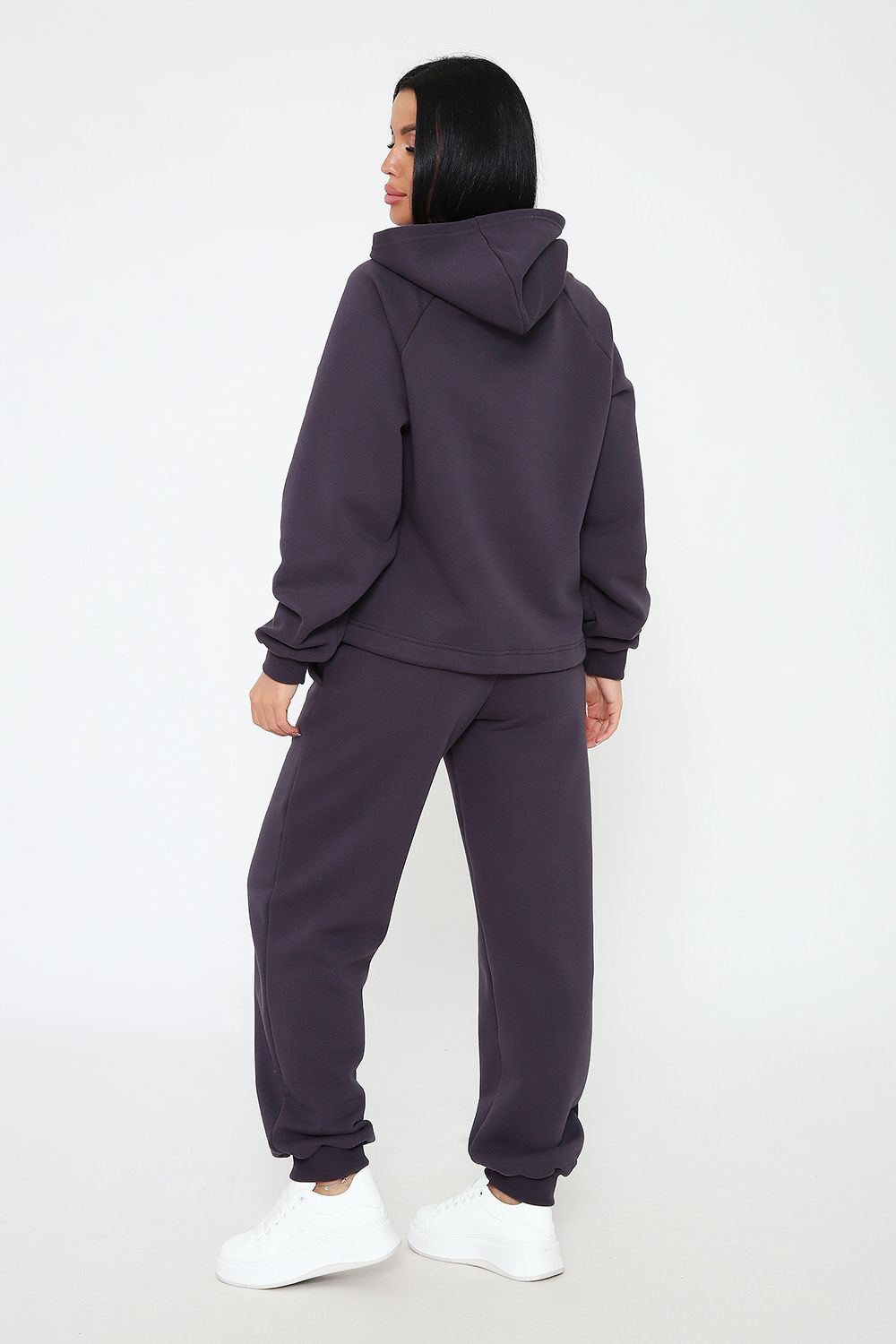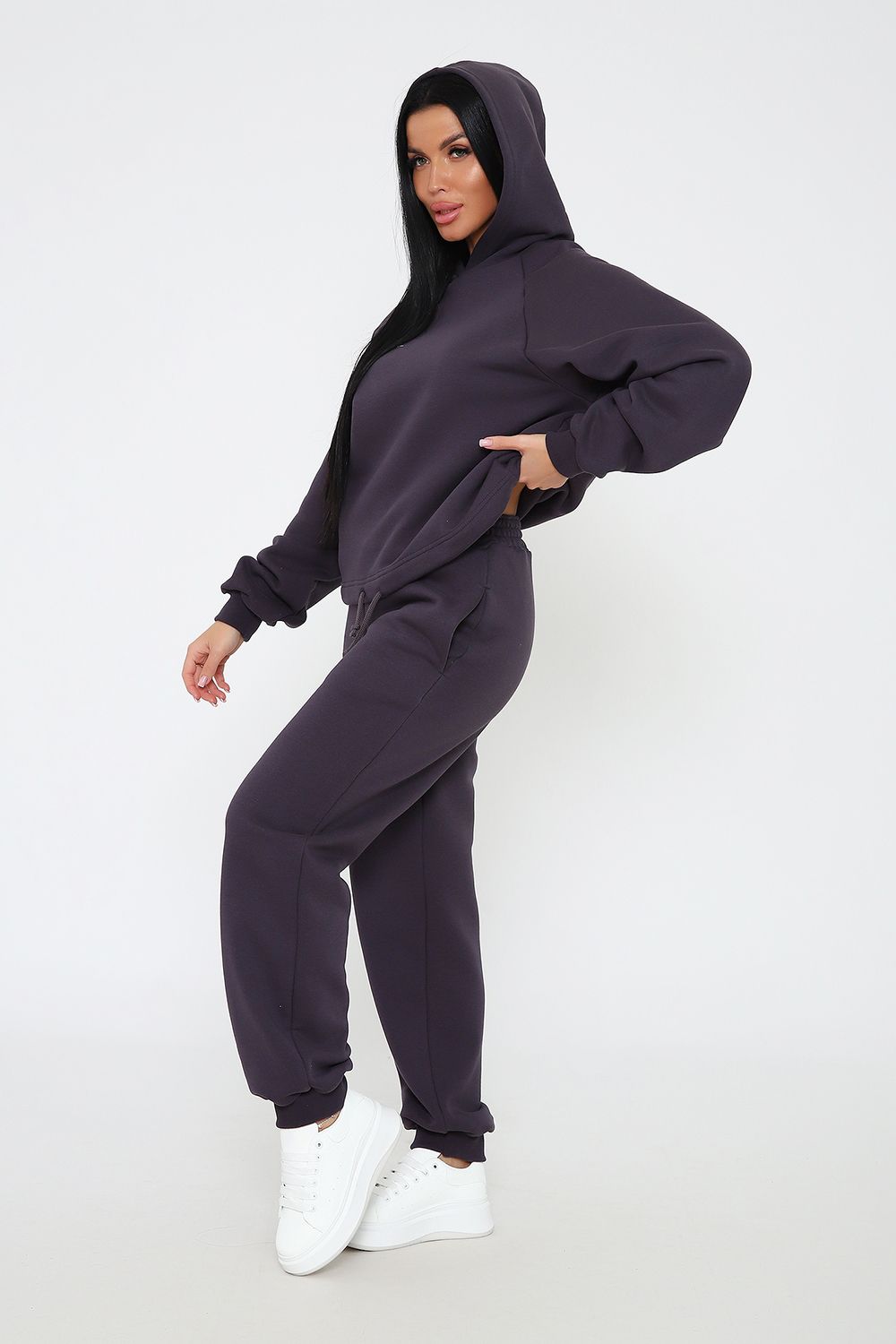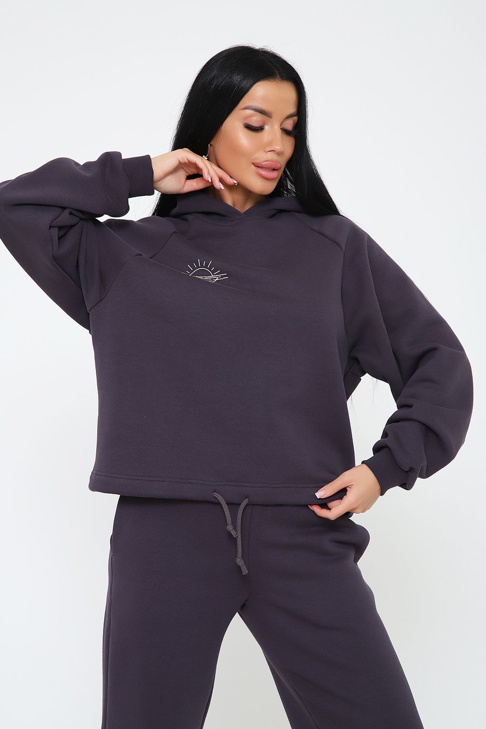 Костюм из облегченного футера с начесом прекрасно садится по фигуре за счет мягкости и дарит комфорт благодаря начесу. Дополнительная фишка печать на рукаве и полочке. В отделке использовано кашкорсе на рукавах и брюках, низ толстовки украшает декоративный шнур.