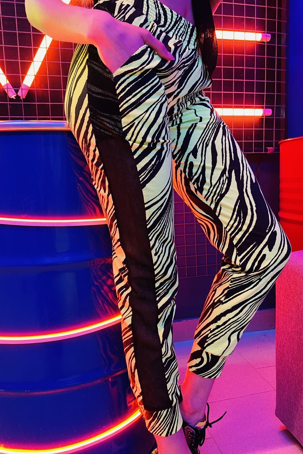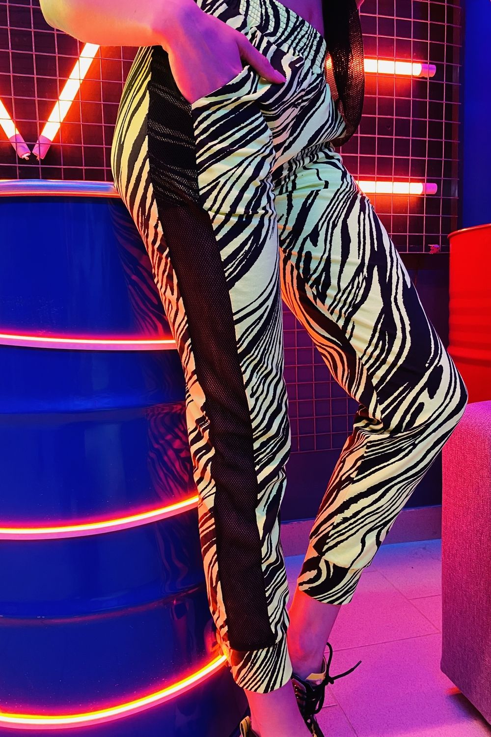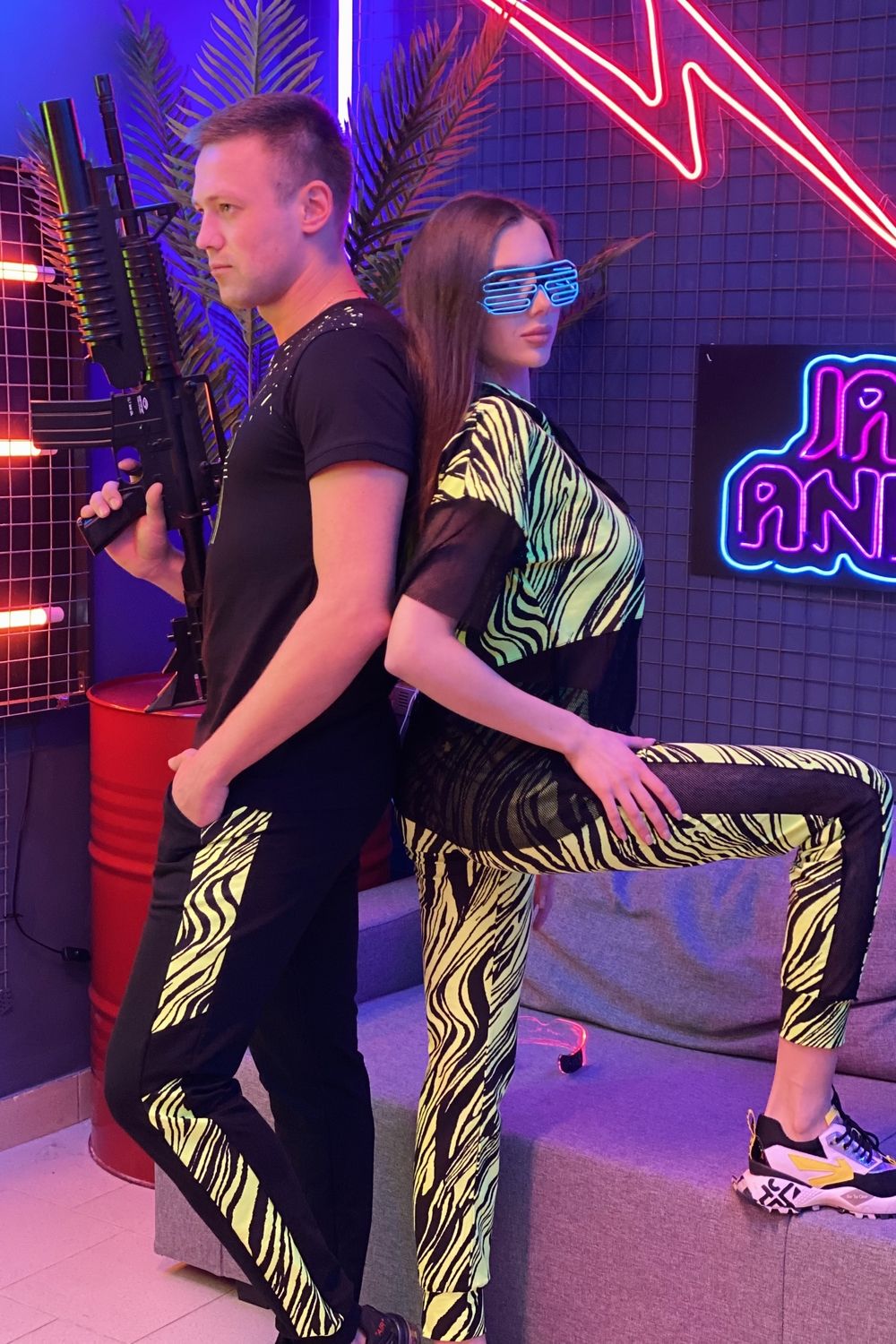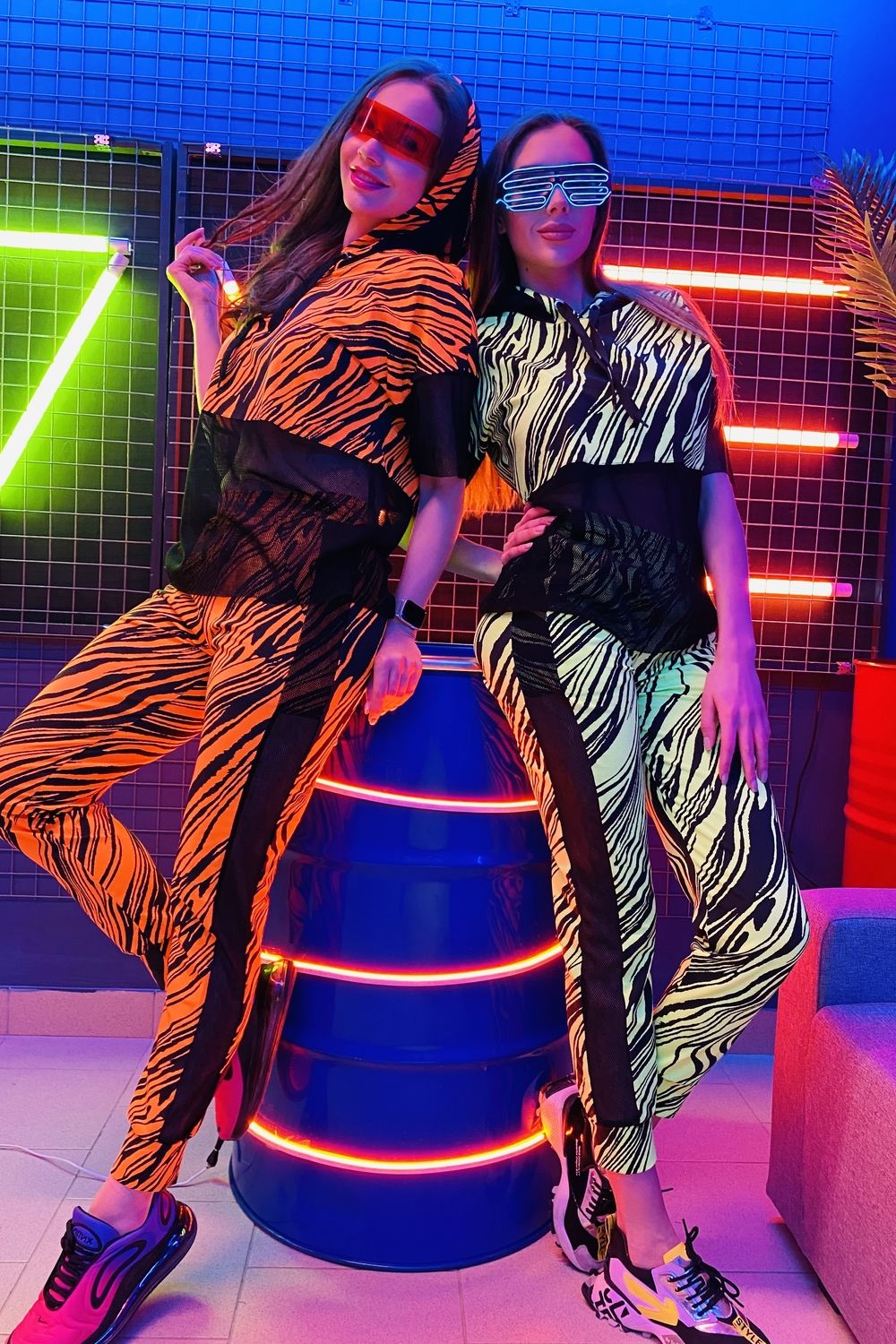Комплект состоит из туники и брюк. Брюки на поясе, с карманами, с лампасами из сетки вдоль боковых швов, на манжете по низу. Туника свободная, с капюшоном из сетки, с удлиненной спинкой, длиной до середины бедра. Рукав короткий, из сетки. Нижняя часть полочки и спинки выполнены из сетки.