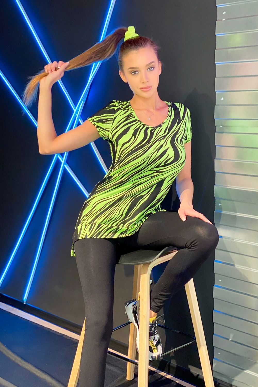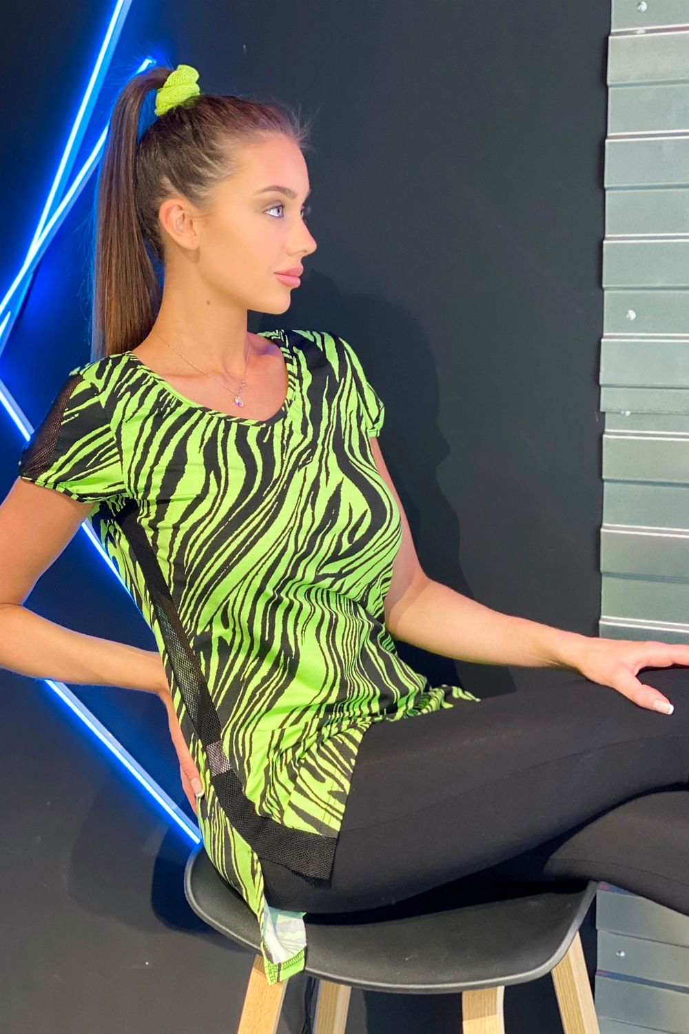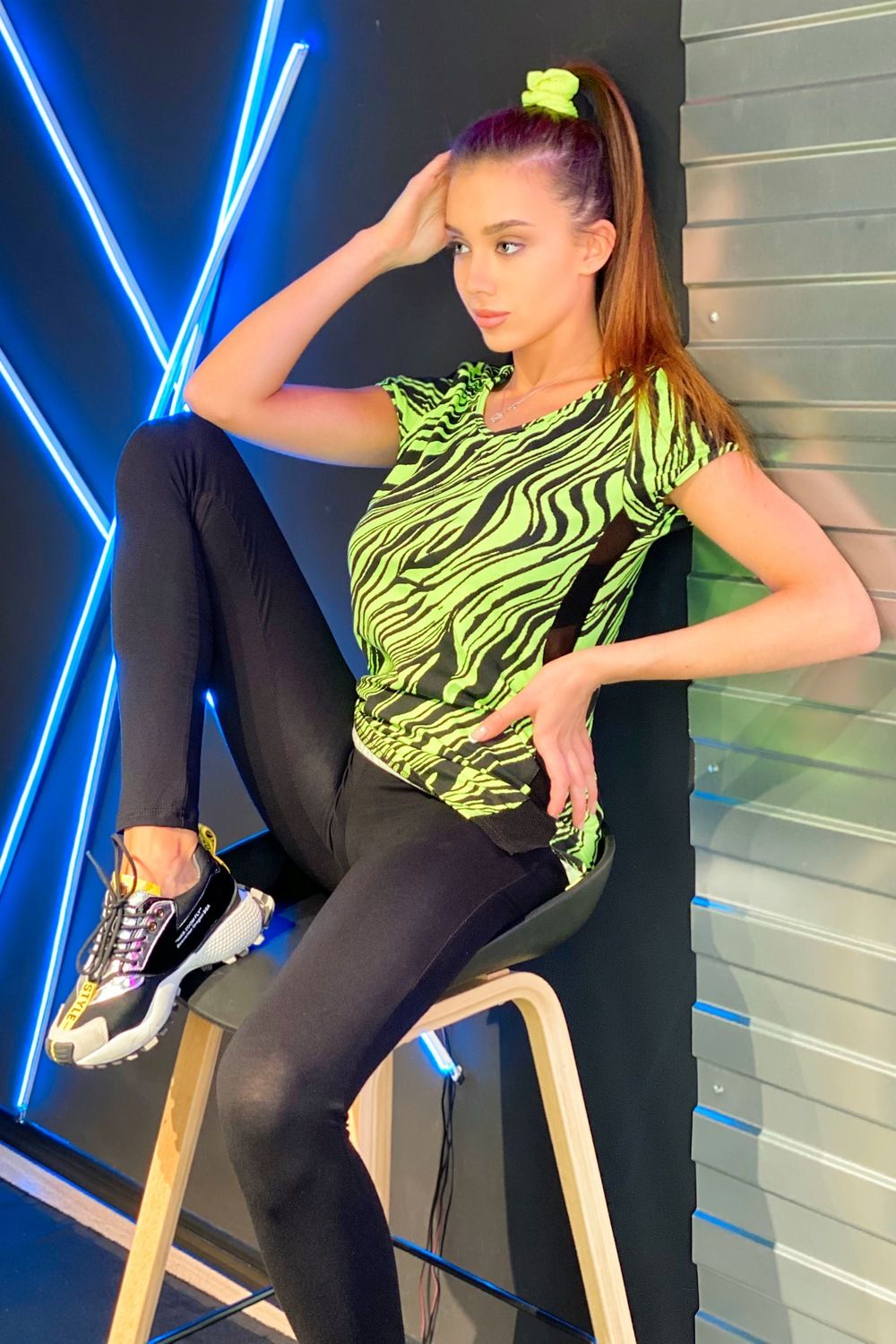 Комплект состоит из футболки и леггинсов. Леггинсы облегающие, на резинке. Футболка полуприлегающего силуэта, с V-образной горловиной, с удлиненной спинкой, с лампасами из сетки по боковым швам. В нижней части боковых швов обработаны разрезы. Рукав втачной, короткий, со вставкой из сетки. Горловина и низ рукавов обработана бейкой из основного полотна.