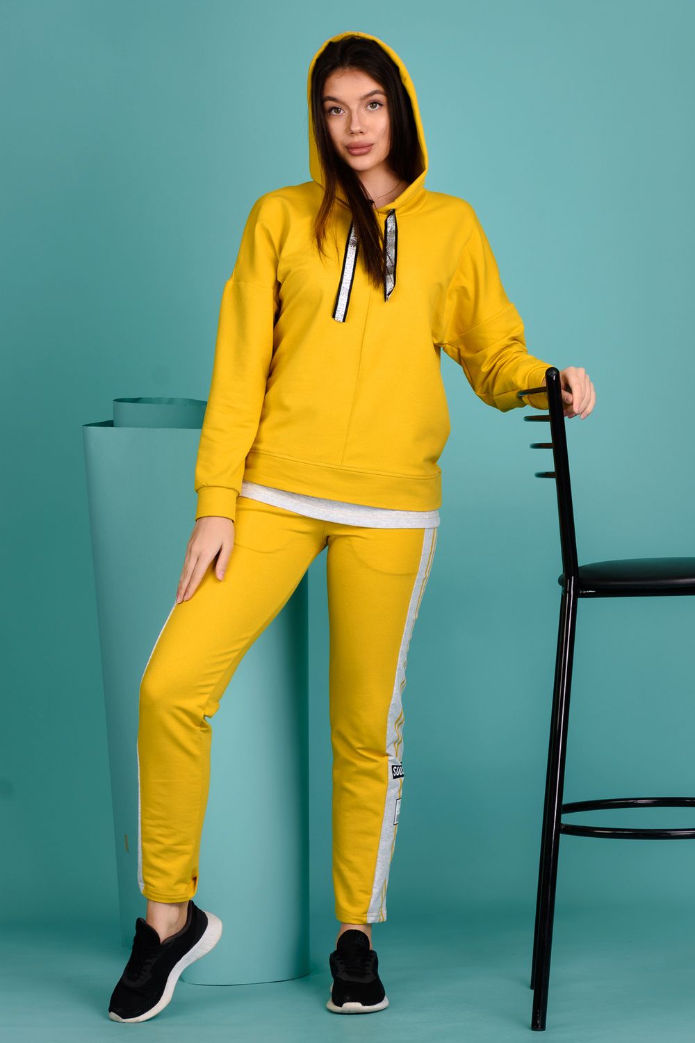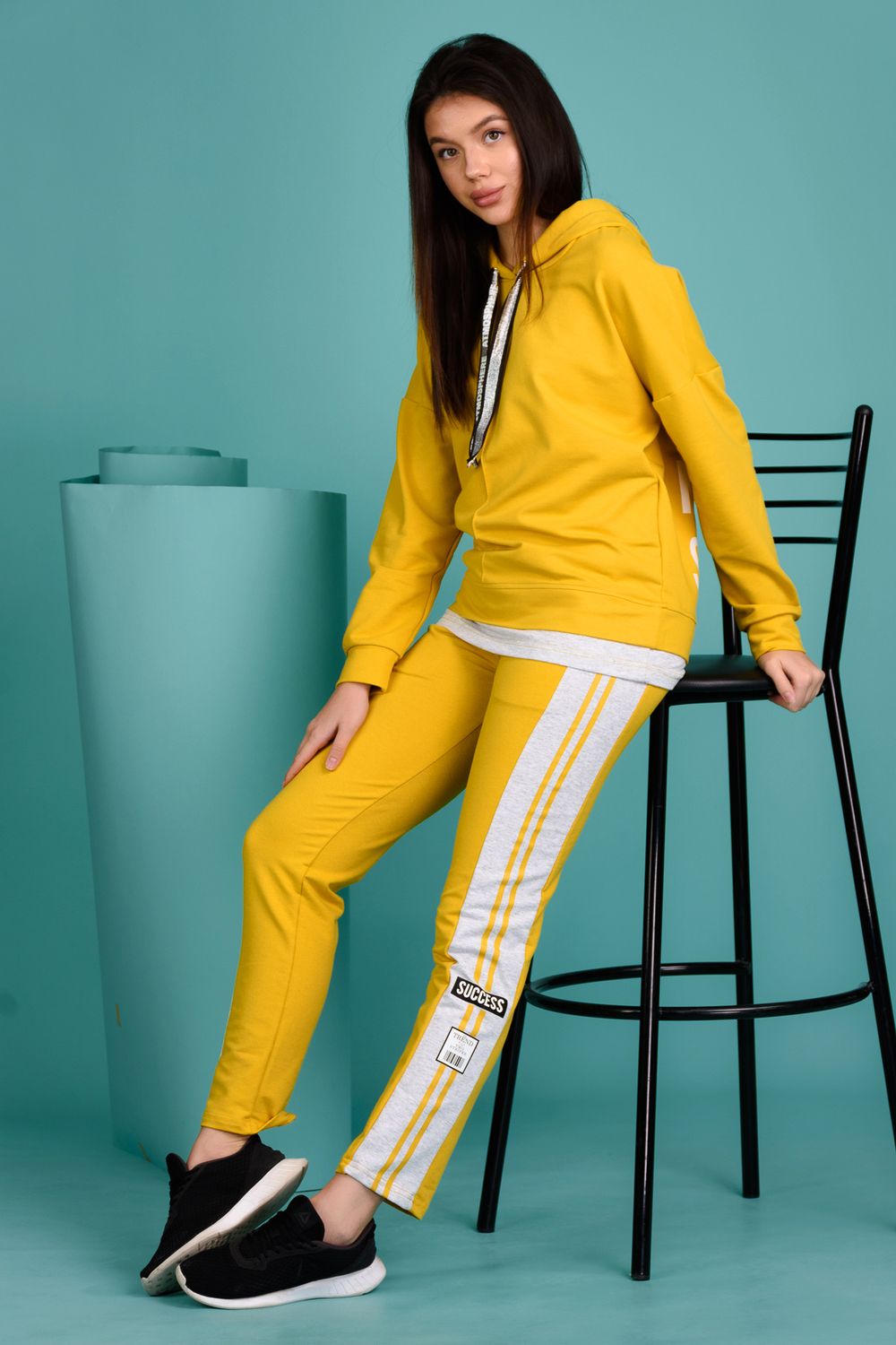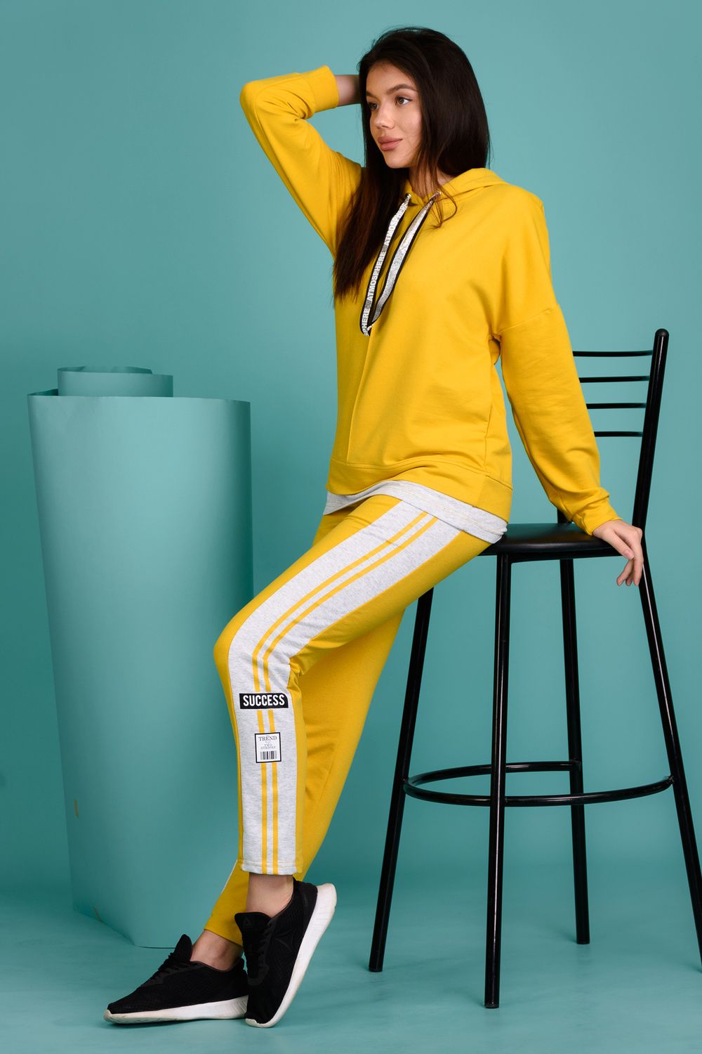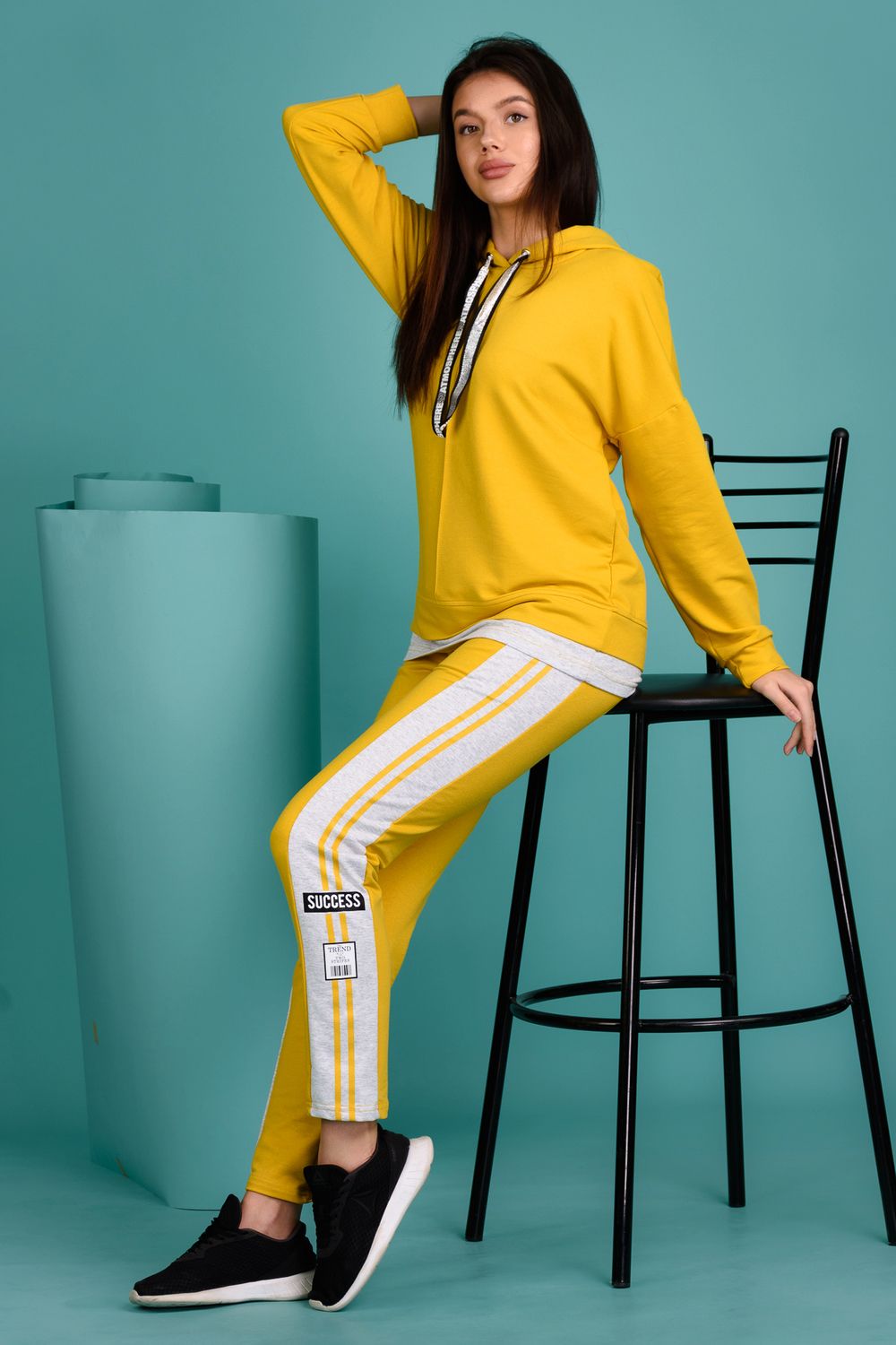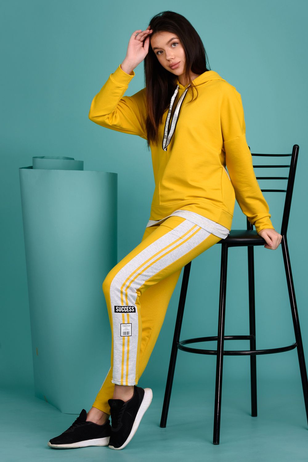 Костюм состоит из толстовки и брюк. Толстовка прямая, свободная, с капюшоном, с длинным рукавом на манжете. Низ полочки и спинки завершен поясом. Брюки с карманами, на поясе. Вдоль боковых швов расположены лампасы из отделочного полотна.