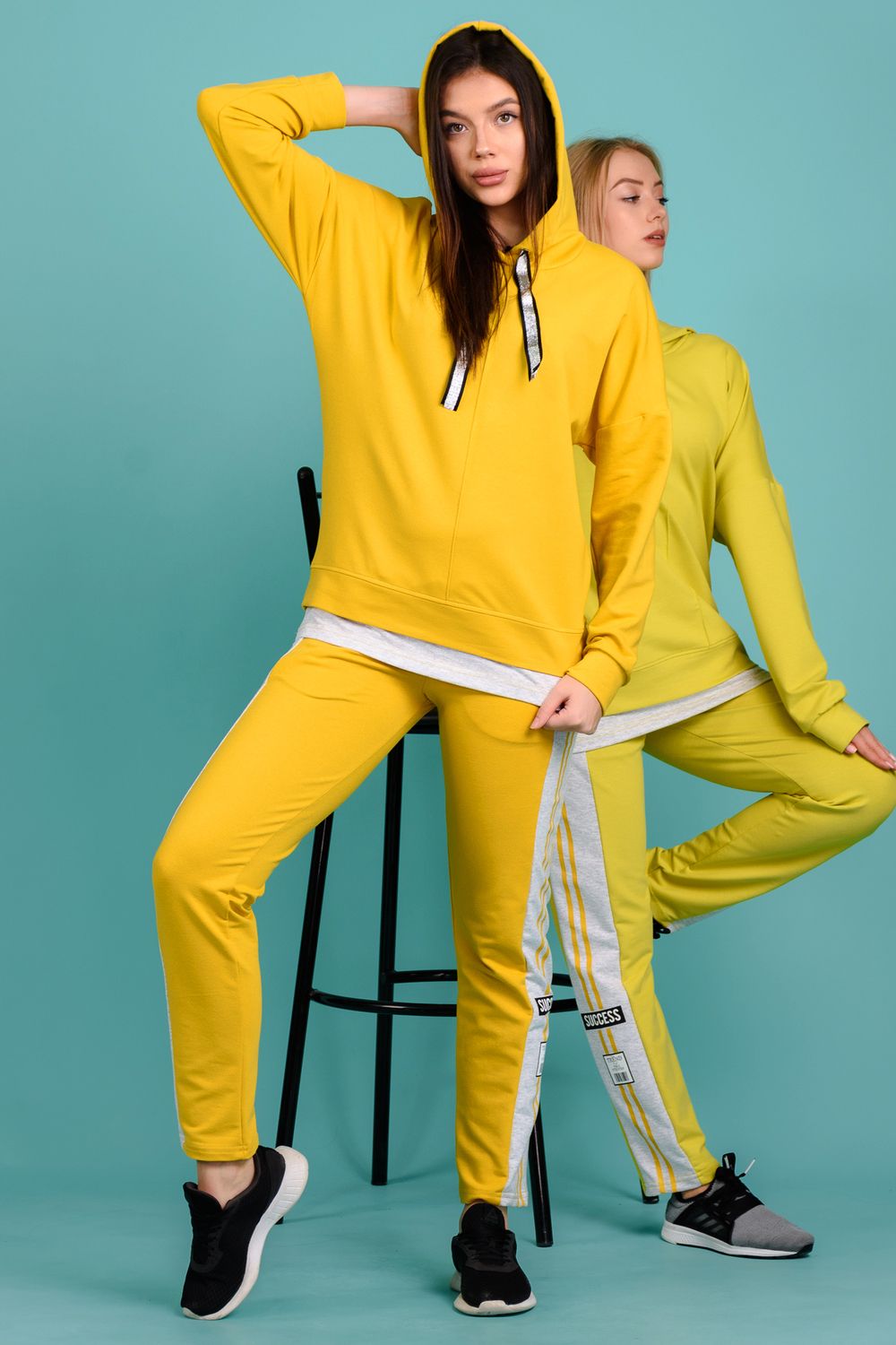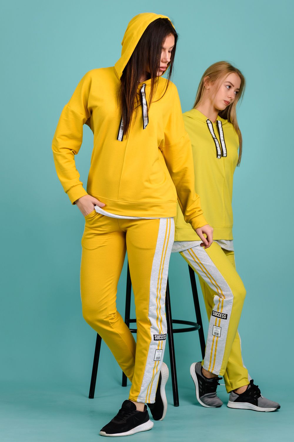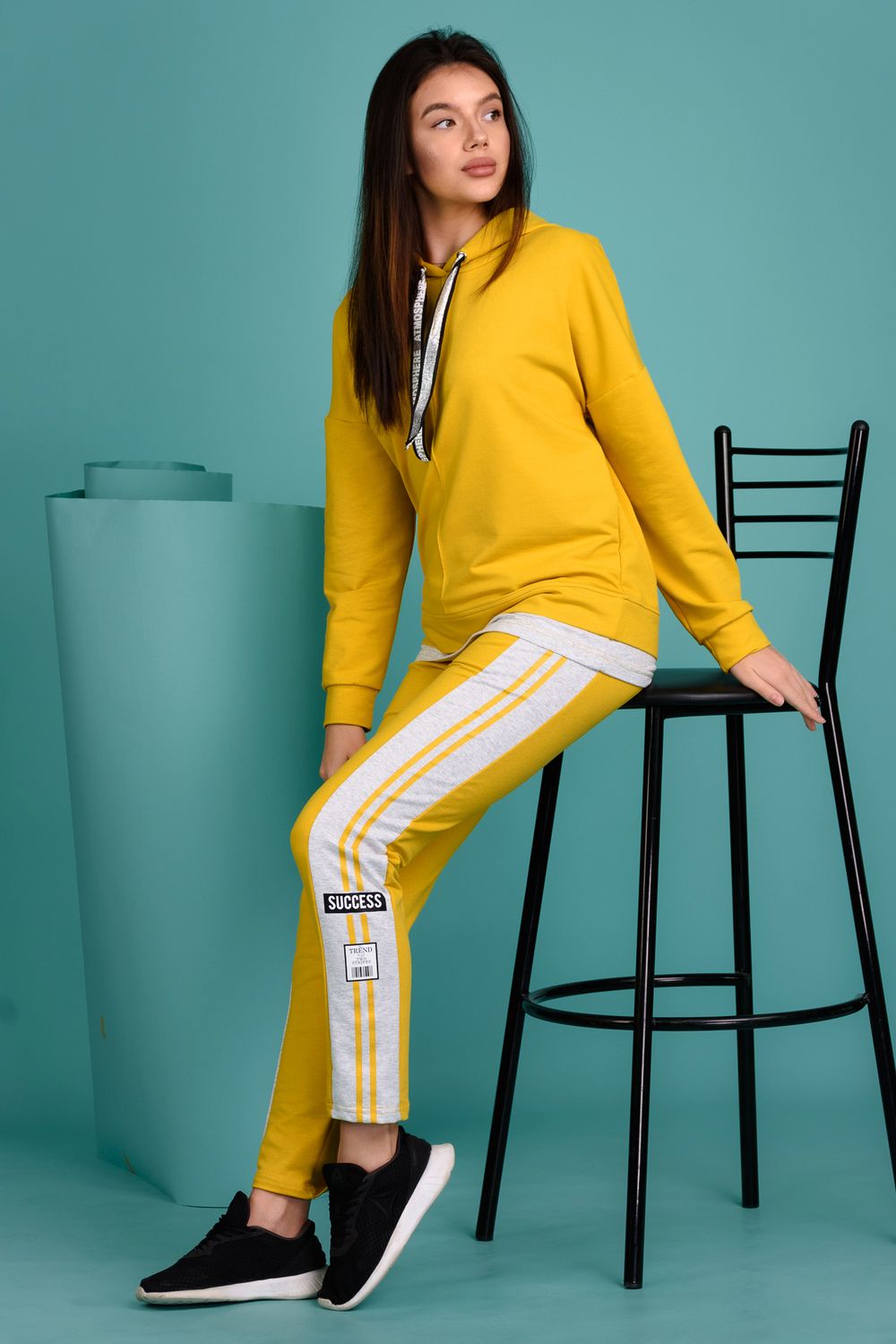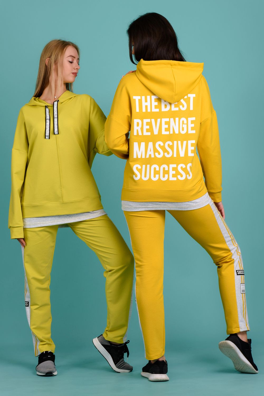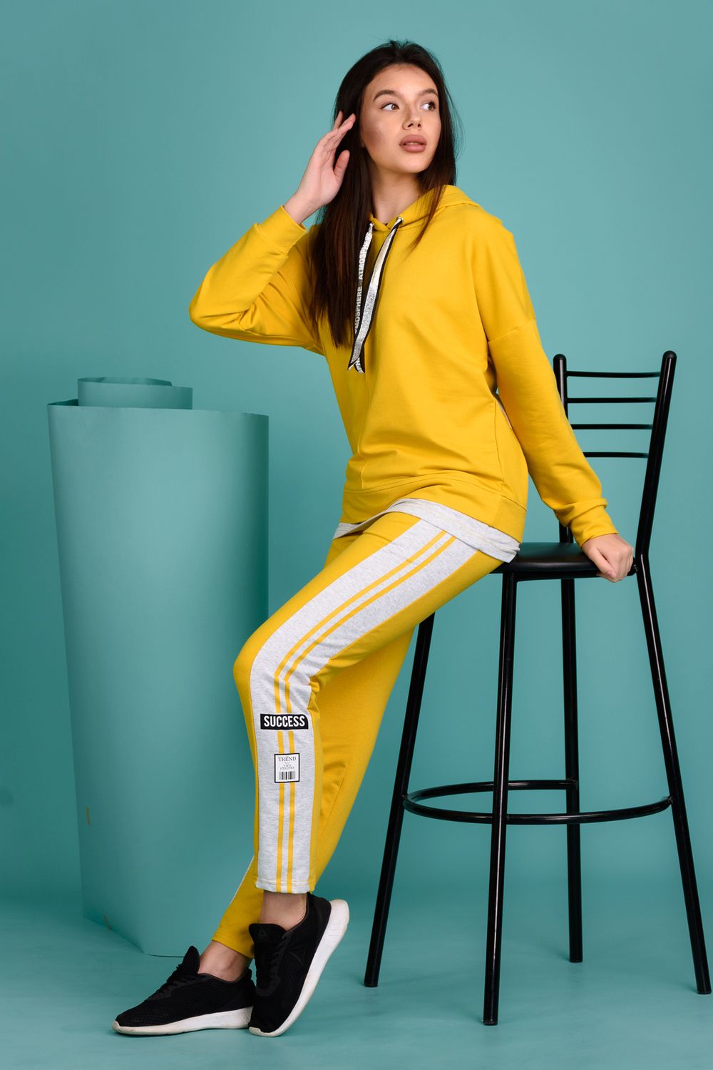 Костюм состоит из толстовки и брюк. Толстовка прямая, свободная, с капюшоном, с длинным рукавом на манжете. Низ полочки и спинки завершен поясом. Брюки с карманами, на поясе. Вдоль боковых швов расположены лампасы из отделочного полотна.