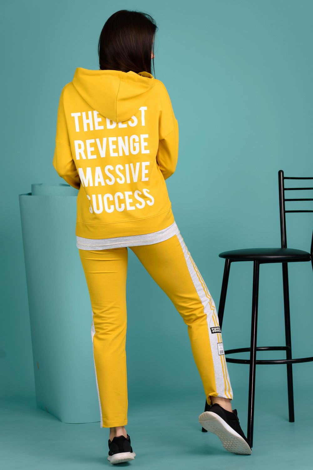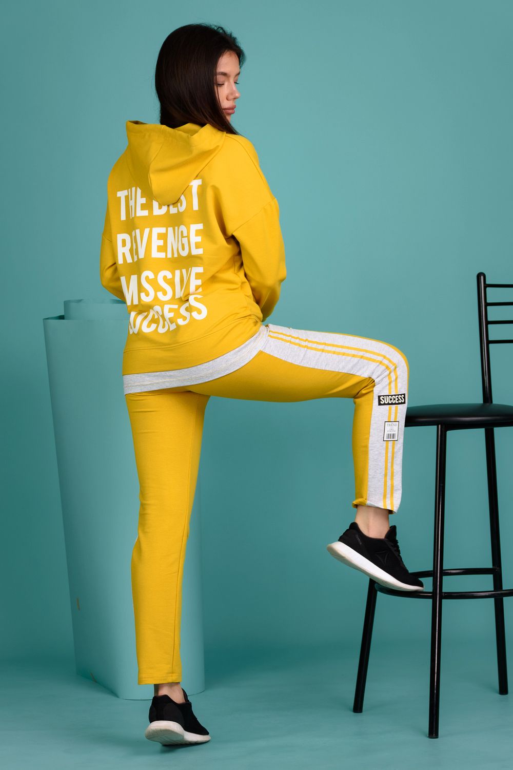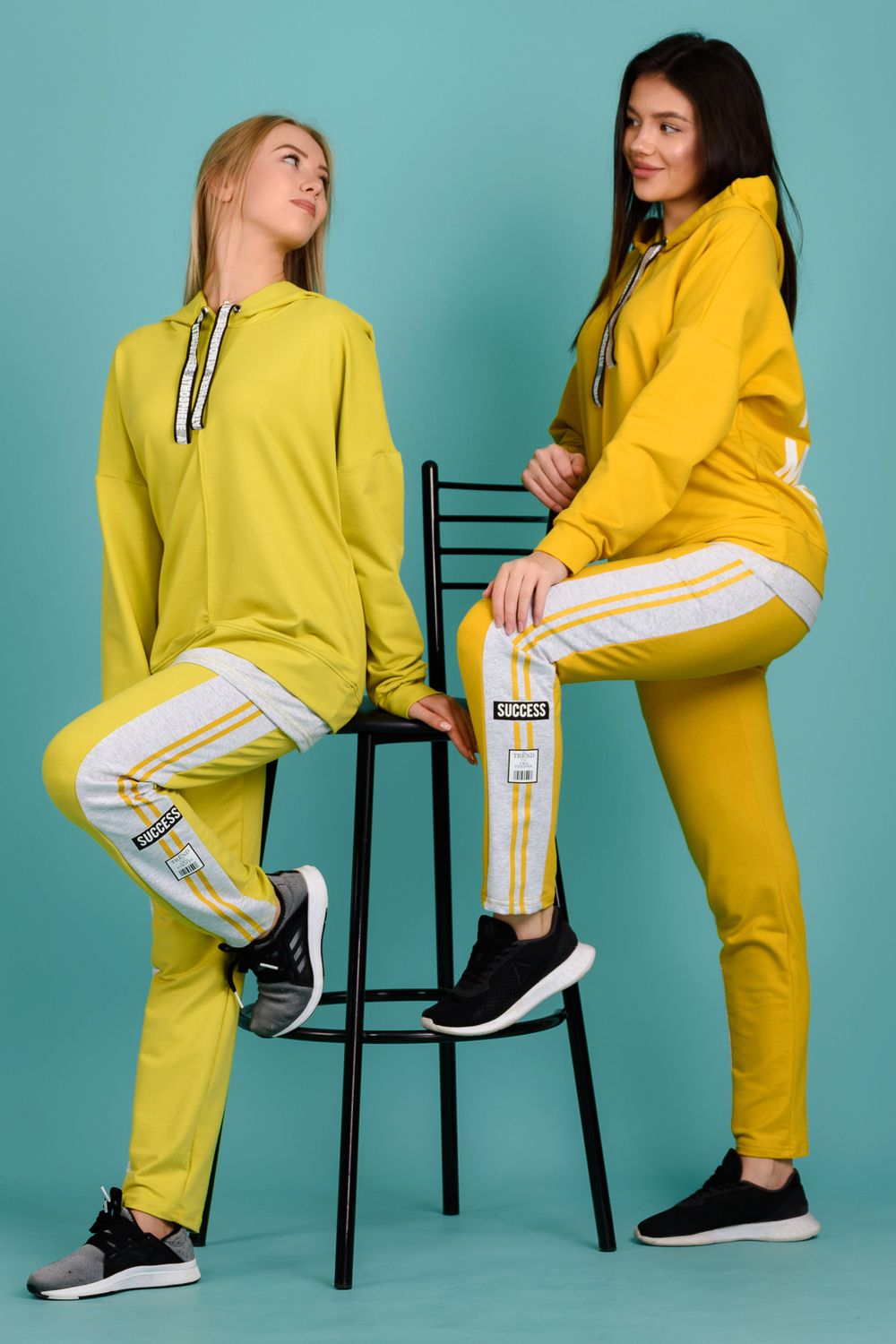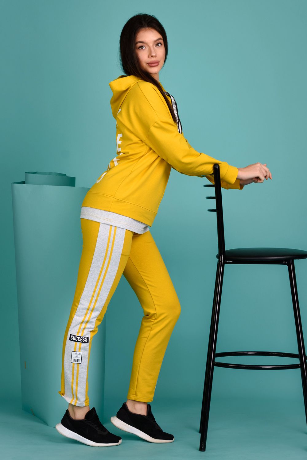 Костюм состоит из толстовки и брюк. Толстовка прямая, свободная, с капюшоном, с длинным рукавом на манжете. Низ полочки и спинки завершен поясом. Брюки с карманами, на поясе. Вдоль боковых швов расположены лампасы из отделочного полотна.
