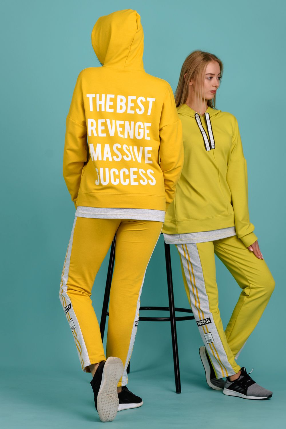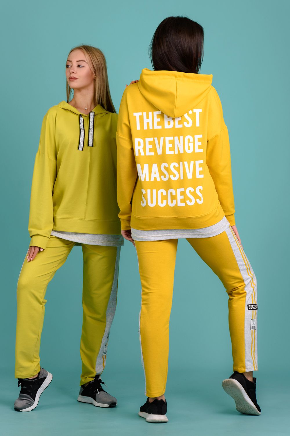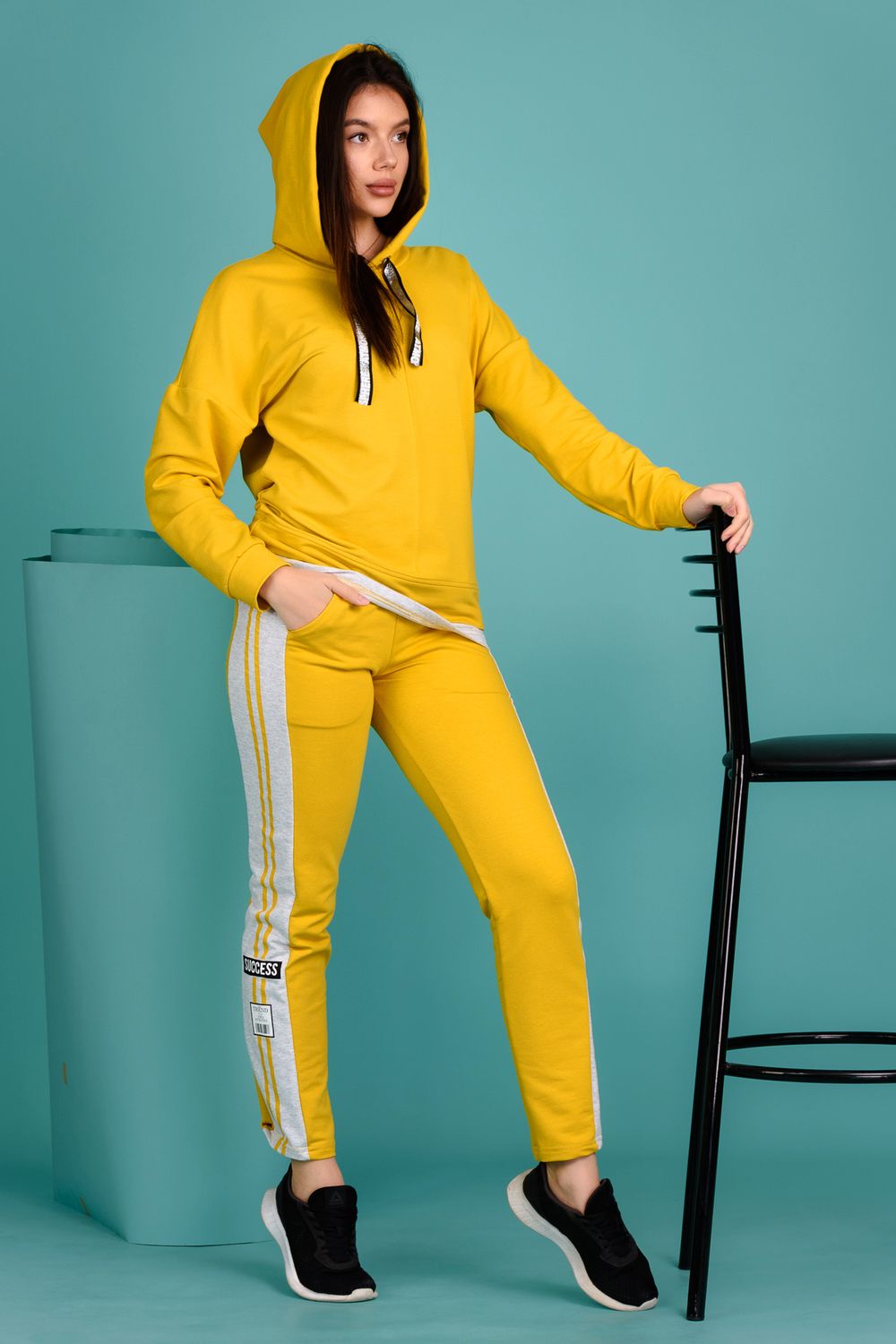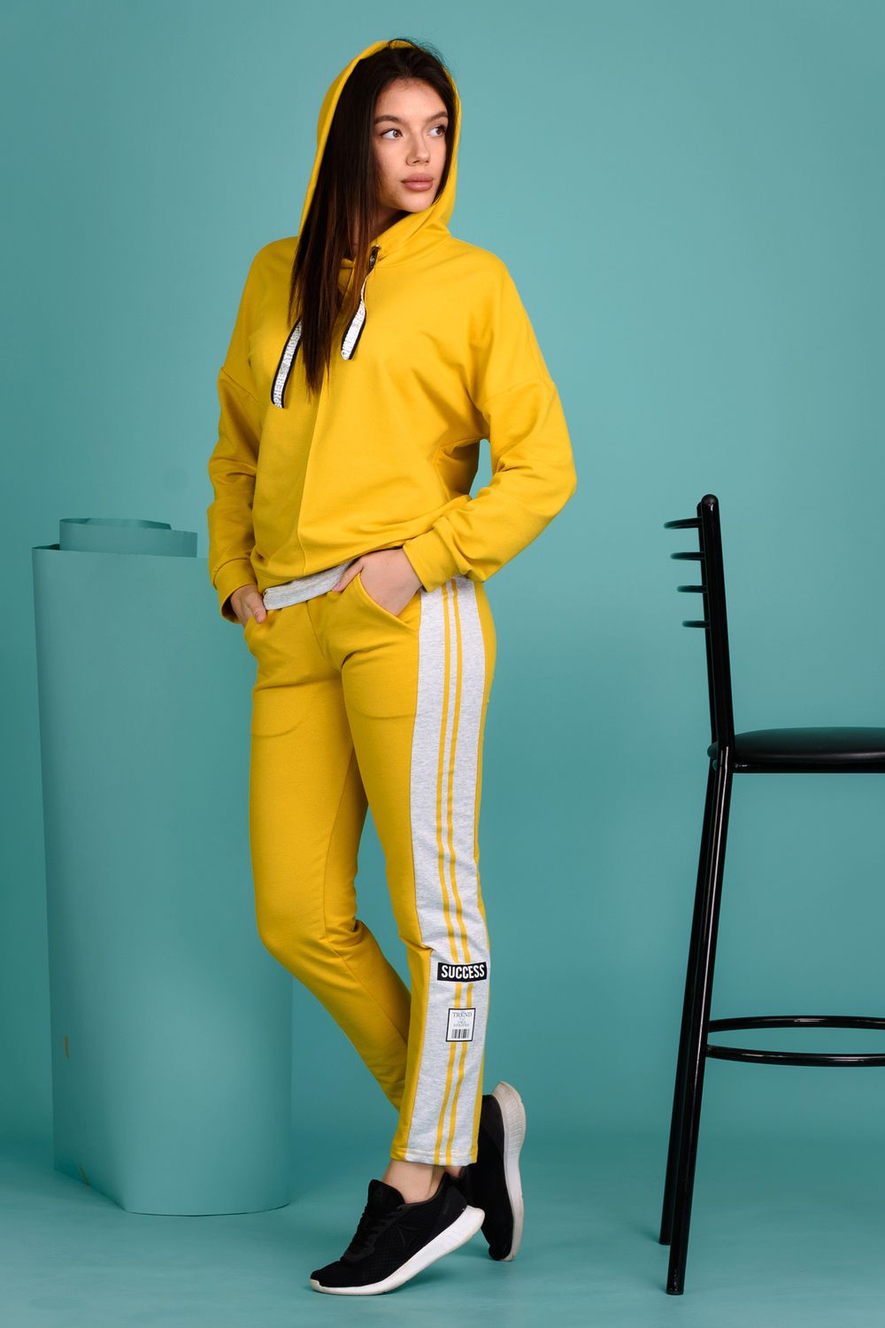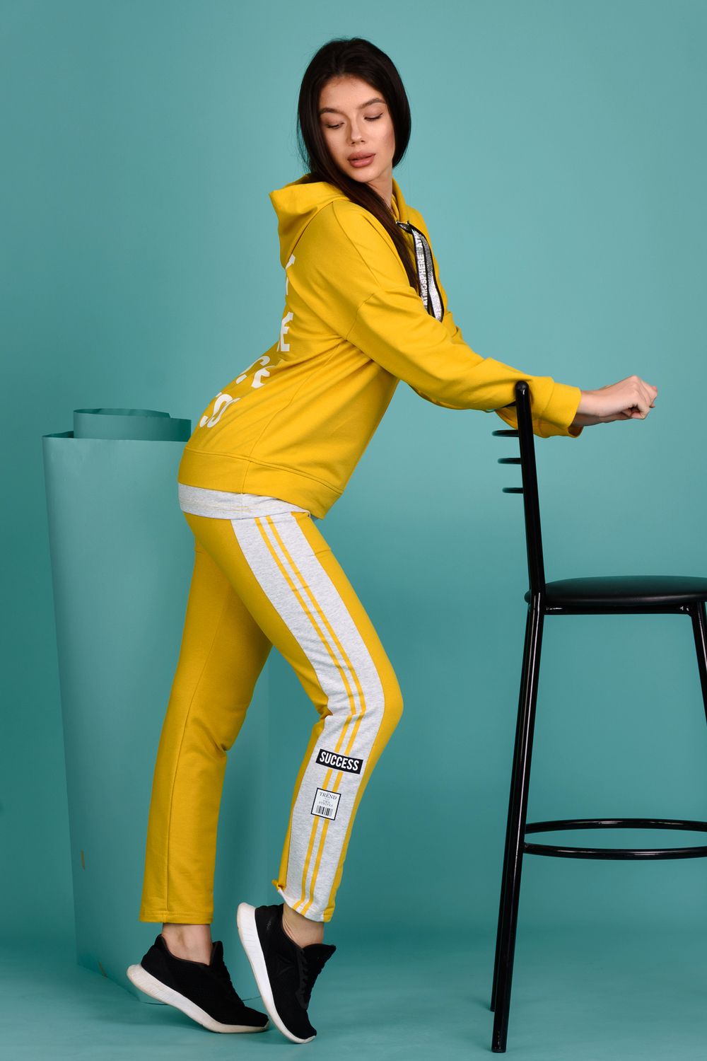 Костюм состоит из толстовки и брюк. Толстовка прямая, свободная, с капюшоном, с длинным рукавом на манжете. Низ полочки и спинки завершен поясом. Брюки с карманами, на поясе. Вдоль боковых швов расположены лампасы из отделочного полотна.
