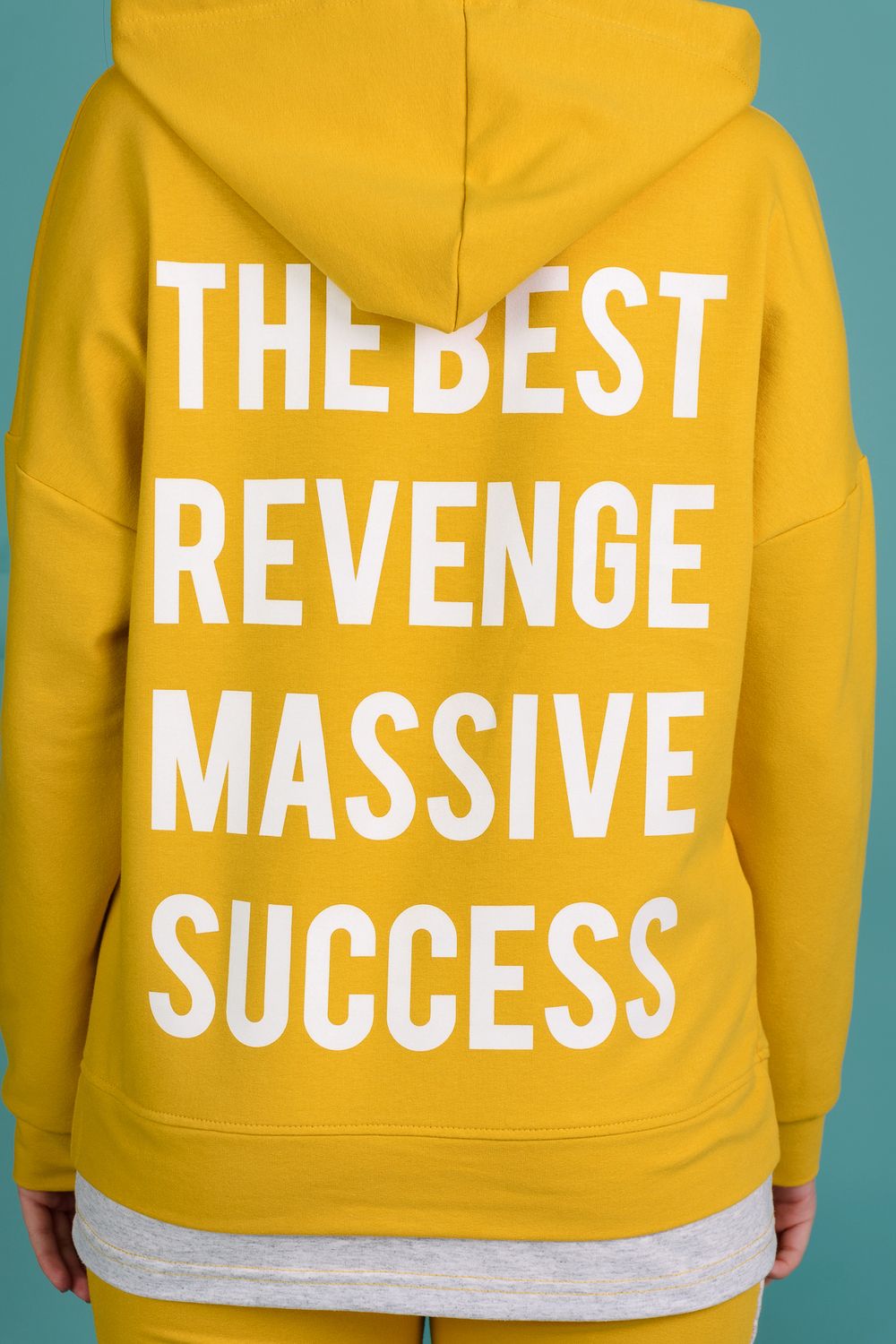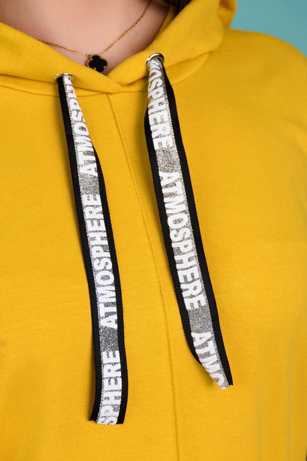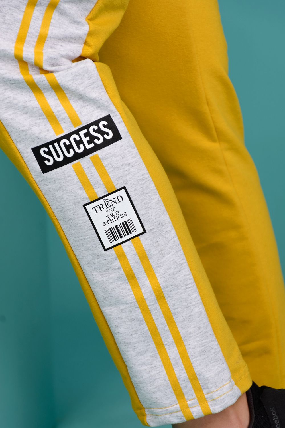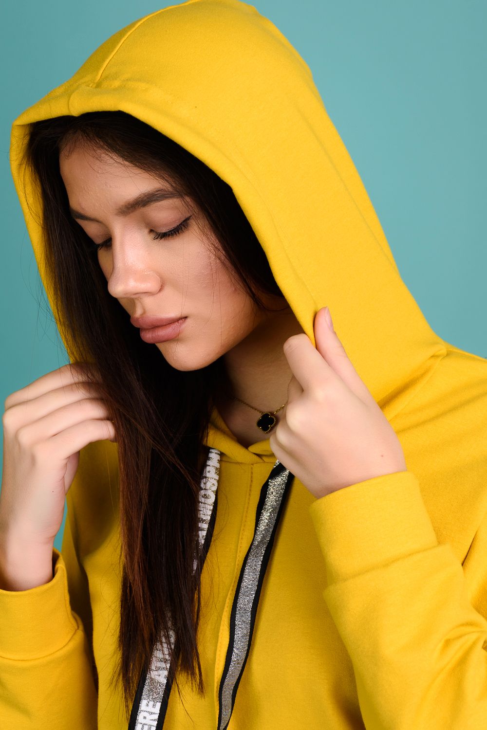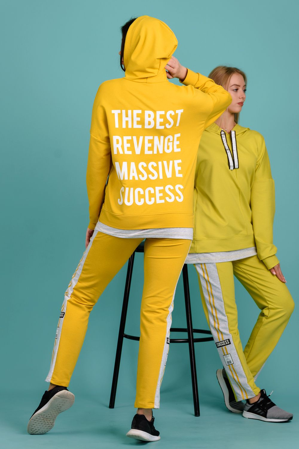 Костюм состоит из толстовки и брюк. Толстовка прямая, свободная, с капюшоном, с длинным рукавом на манжете. Низ полочки и спинки завершен поясом. Брюки с карманами, на поясе. Вдоль боковых швов расположены лампасы из отделочного полотна.