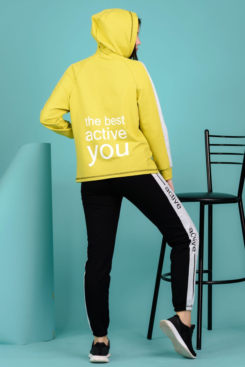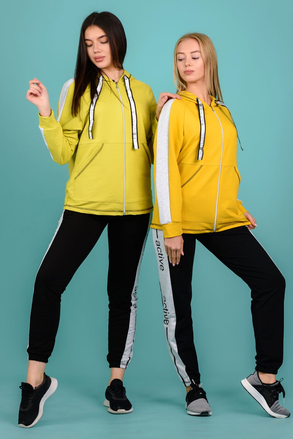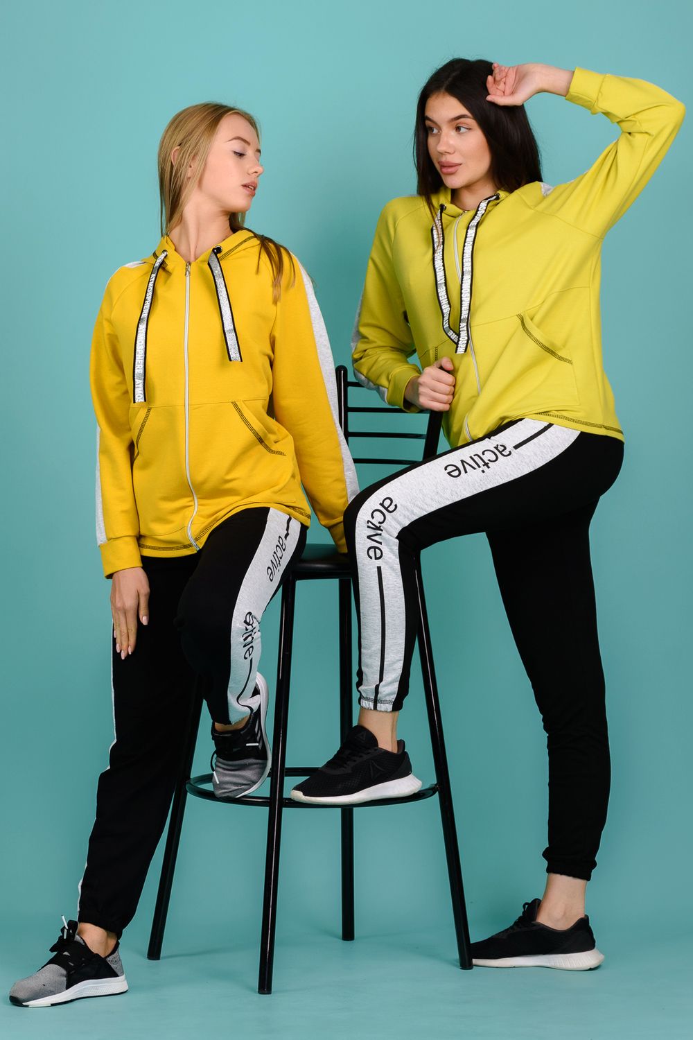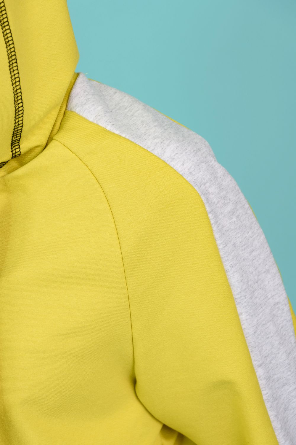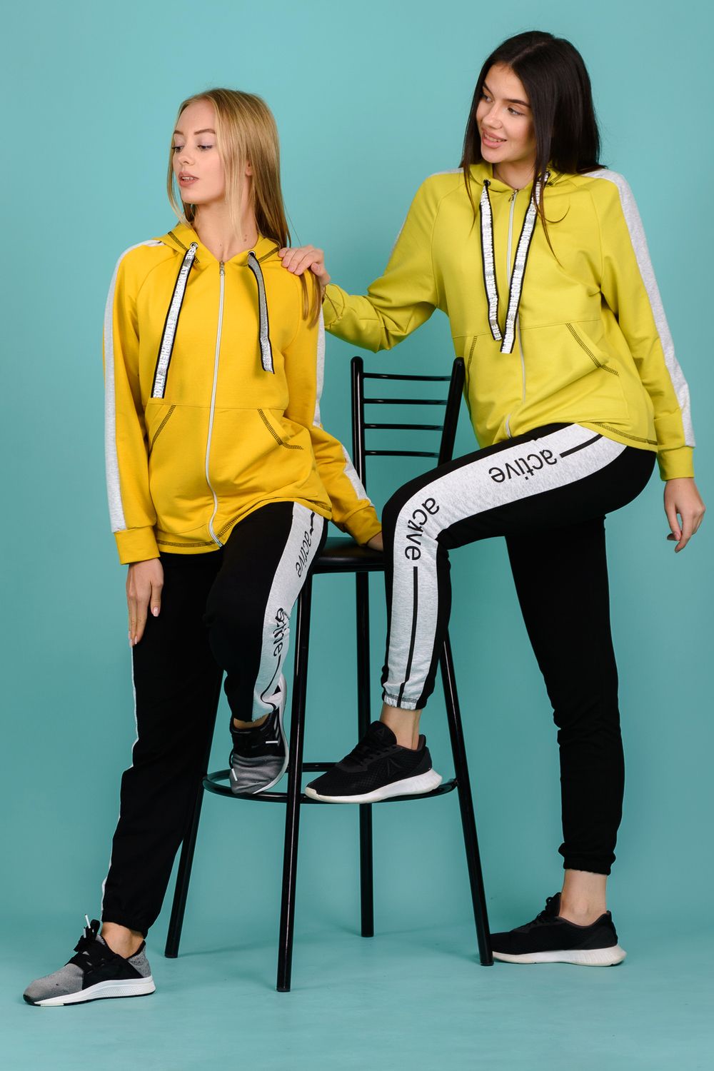 Костюм состоит из толстовки и брюк. Брюки на поясе, с боковыми карманами, с лампасами из отделочного полотна по боковым швам, на резинке по низу. Толстовка прямая, на молнии, с капюшоном, с карманами "кенгуру", длиной до середины бедра. Рукав реглан, длинный, с лампасами из отделочного полотна вдоль рукава, на манжете.