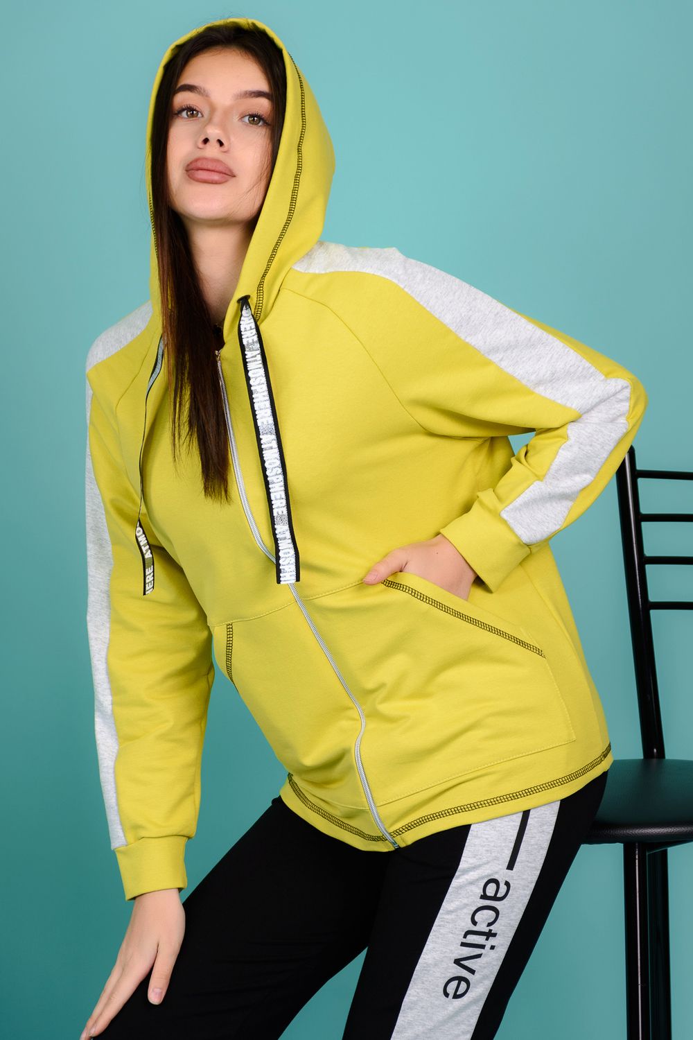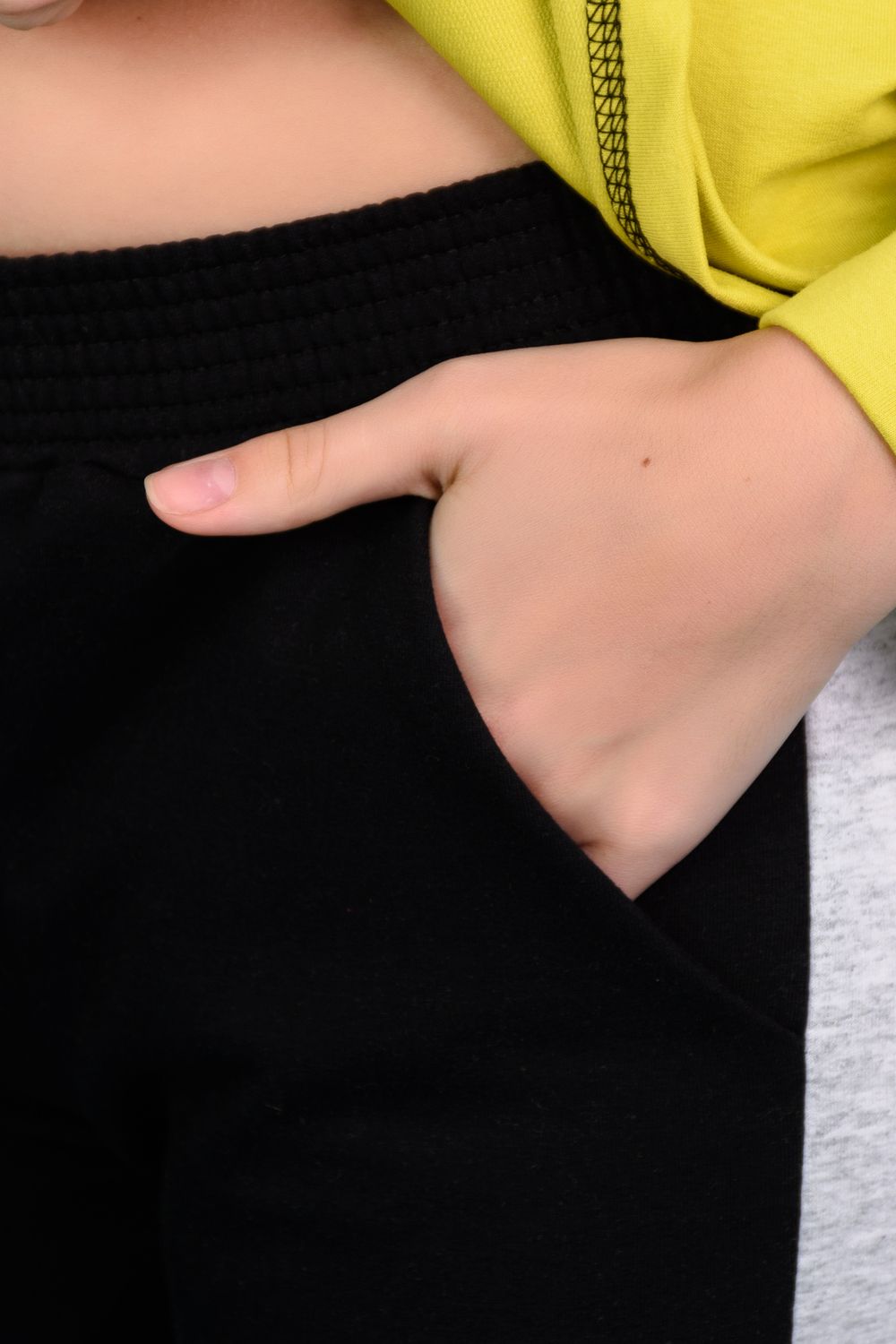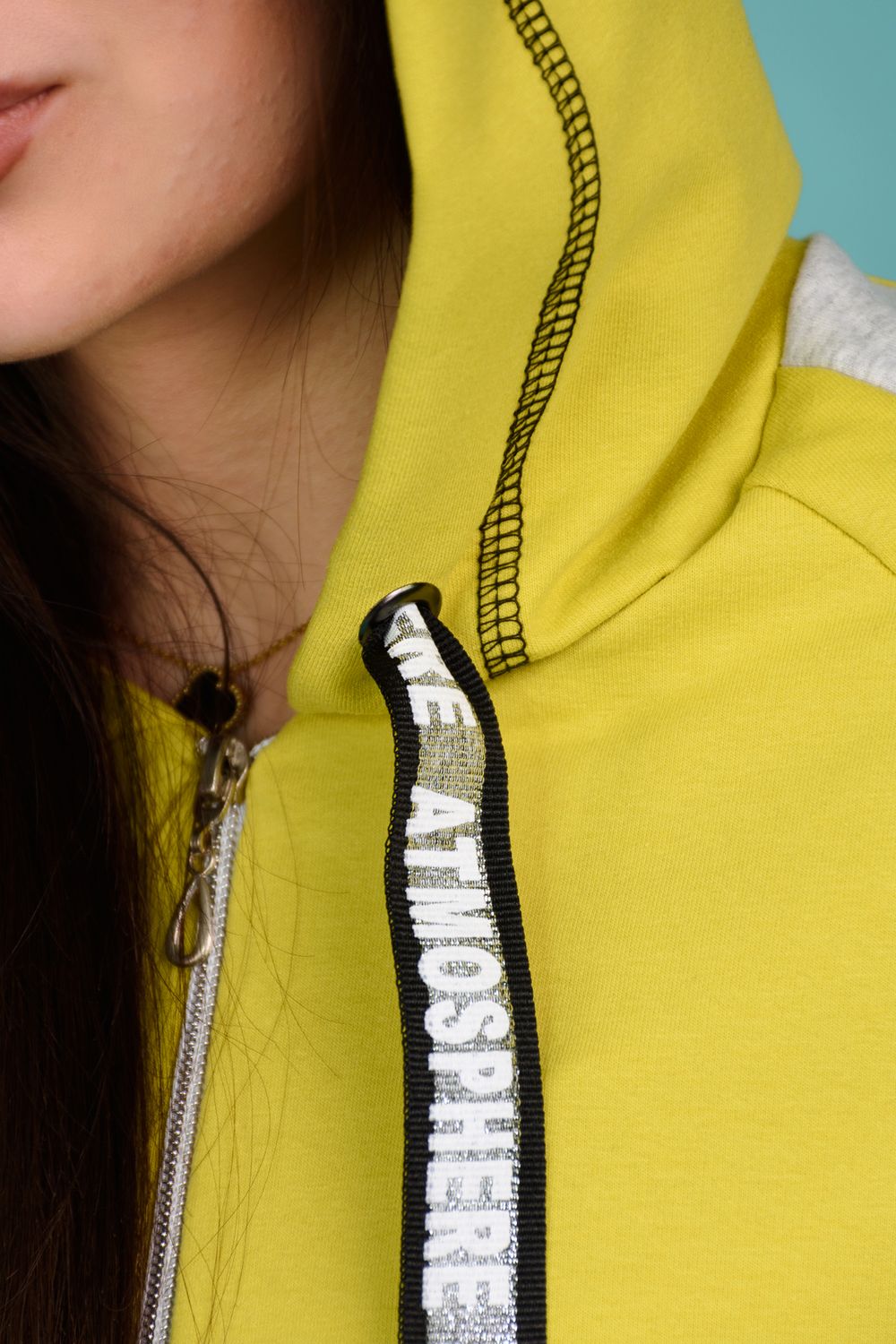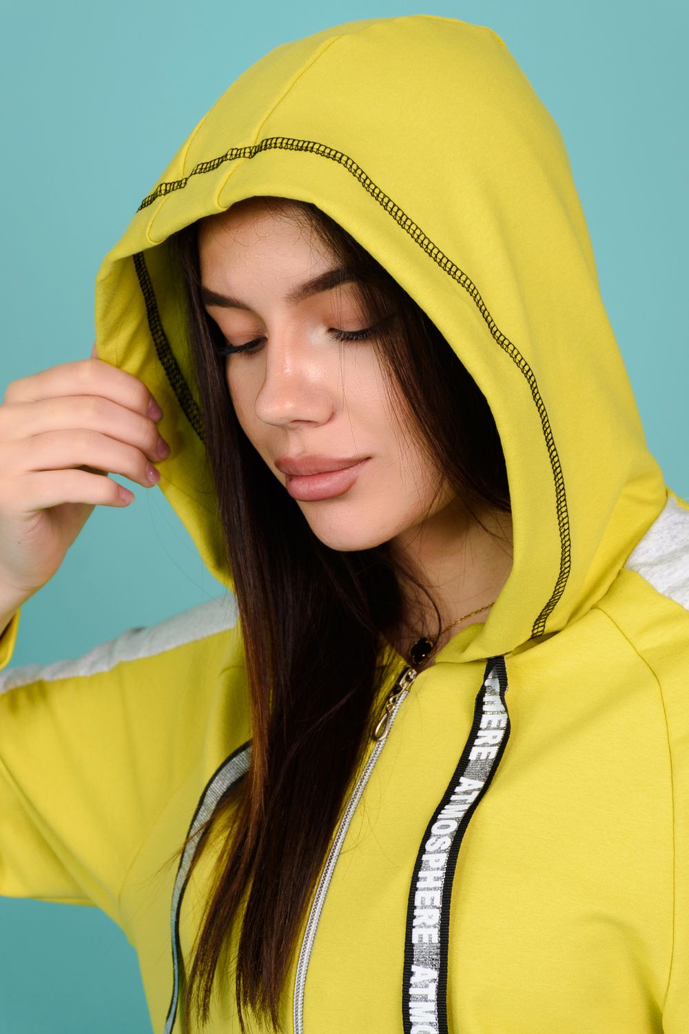 Костюм состоит из толстовки и брюк. Брюки на поясе, с боковыми карманами, с лампасами из отделочного полотна по боковым швам, на резинке по низу. Толстовка прямая, на молнии, с капюшоном, с карманами "кенгуру", длиной до середины бедра. Рукав реглан, длинный, с лампасами из отделочного полотна вдоль рукава, на манжете.