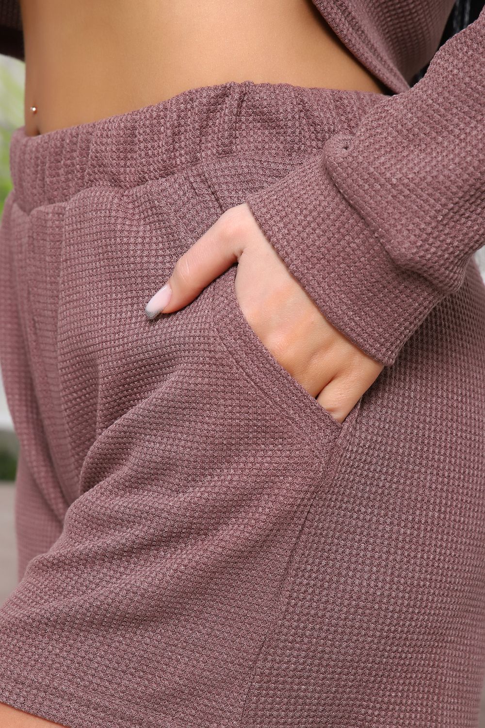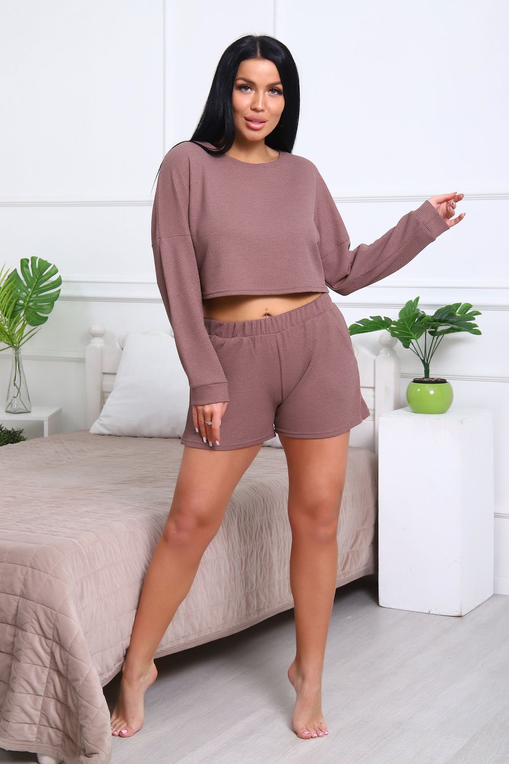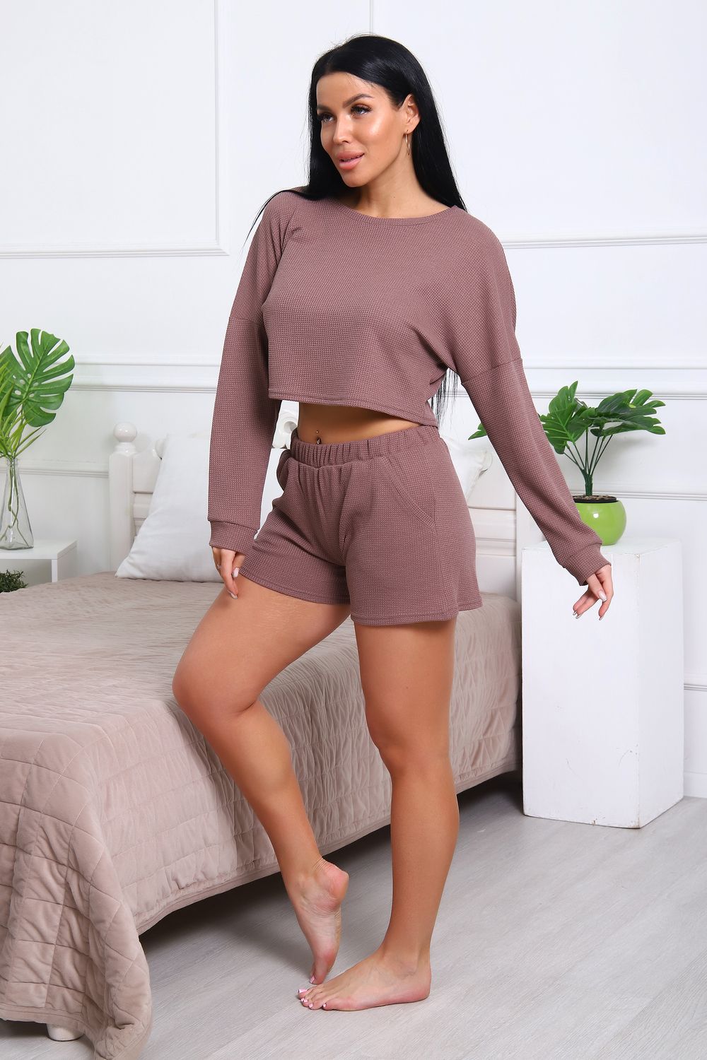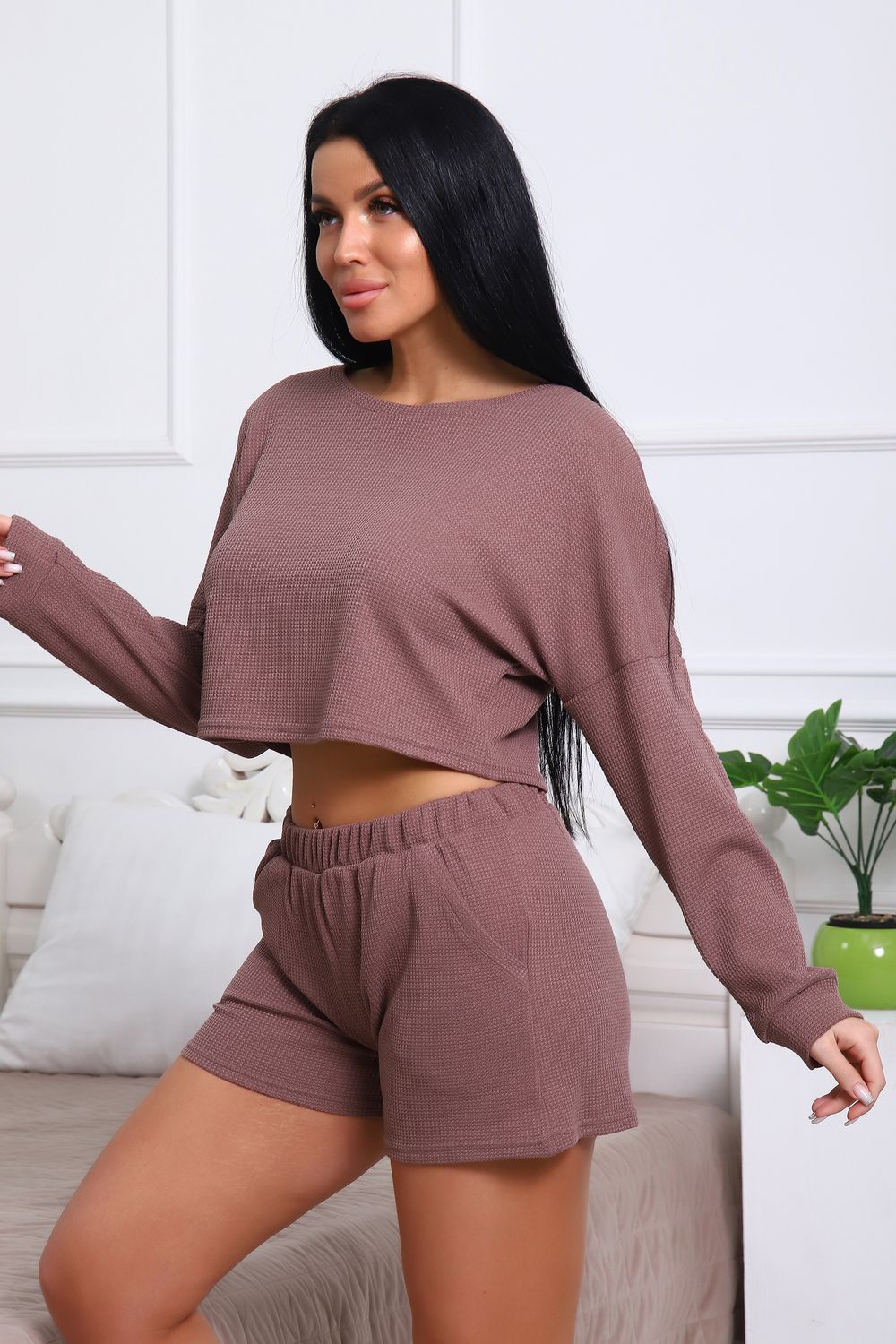 Костюм домашний с шортами из мягкого трикотажа СОТЫ. Комфортный комплект состоит из стильного, укороченного лонгслива с длинным рукавом на манжете и шорт с удобными боковыми карманами. Оригинальный 3Д рисунок, образованный путём сложного переплетения волокон, внешне напоминает пчелиные соты. Полотно мягкое, эластичное и прочное, легко стирается, практически не мнётся, не деформируется.