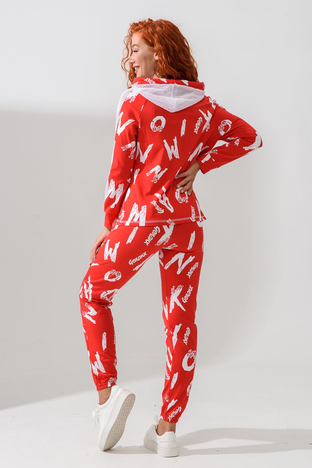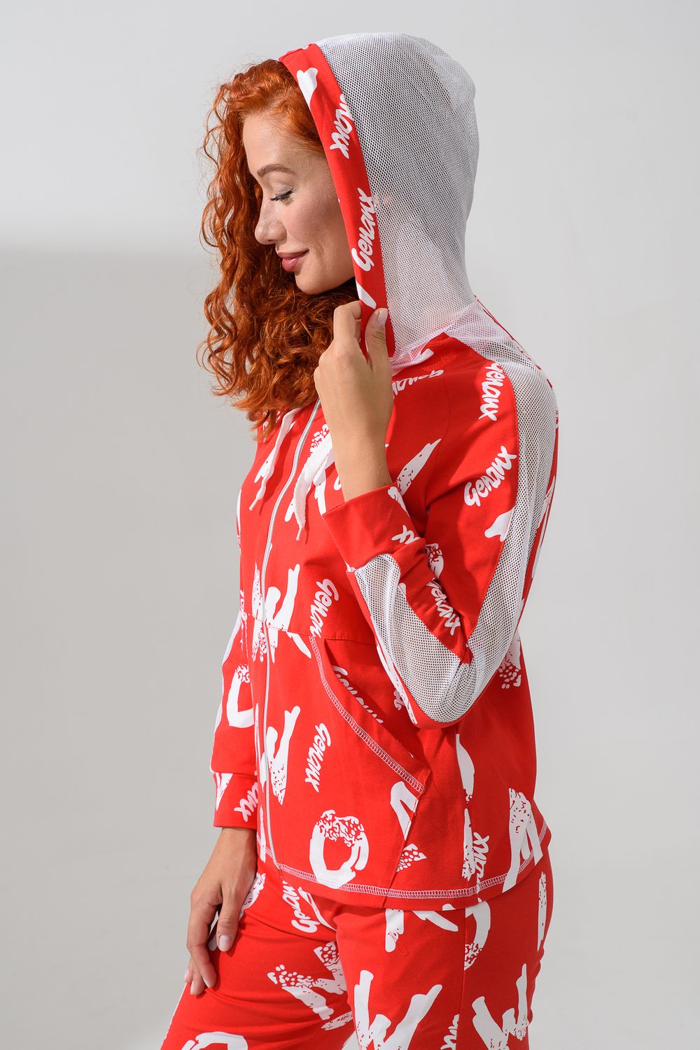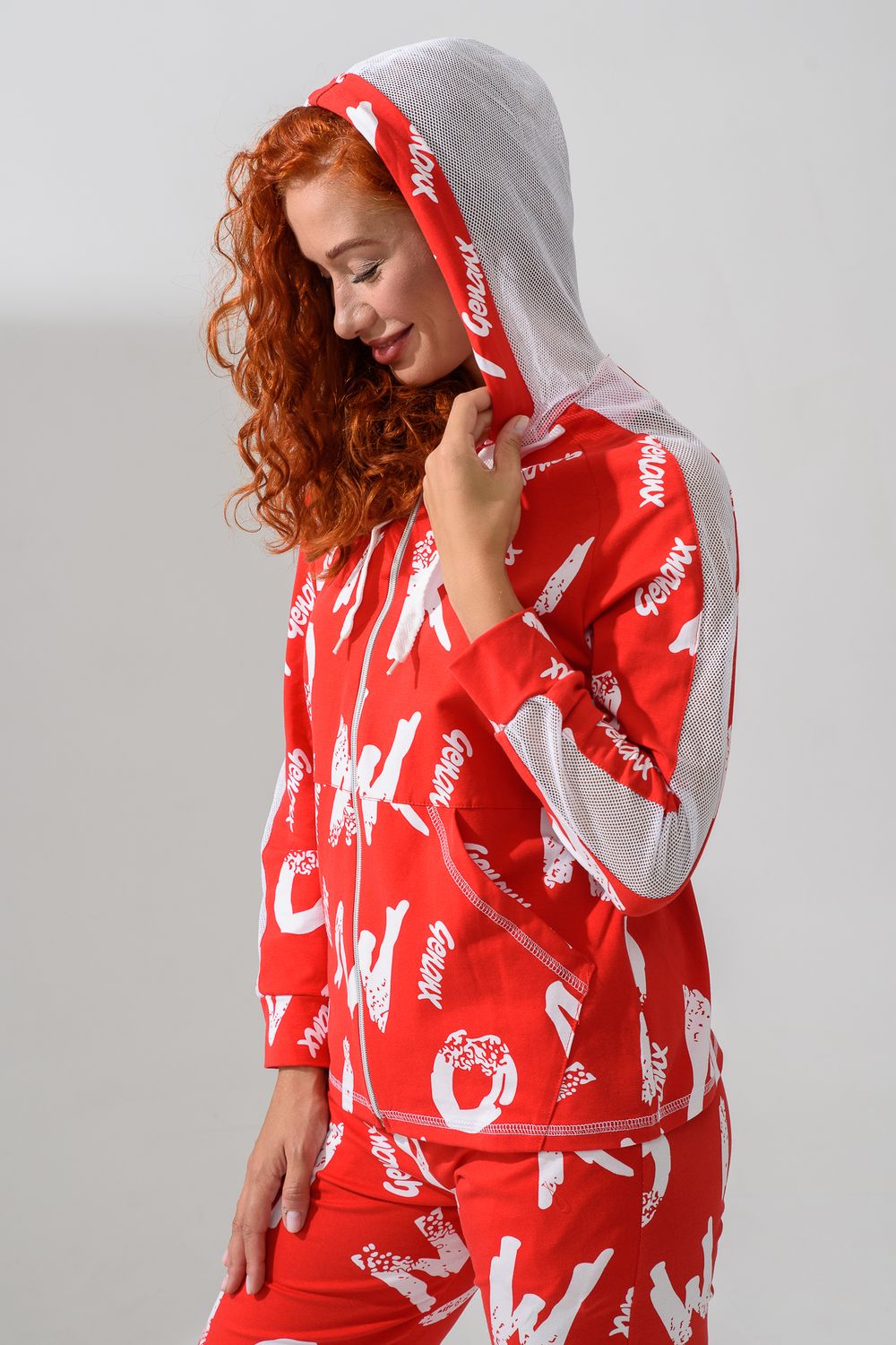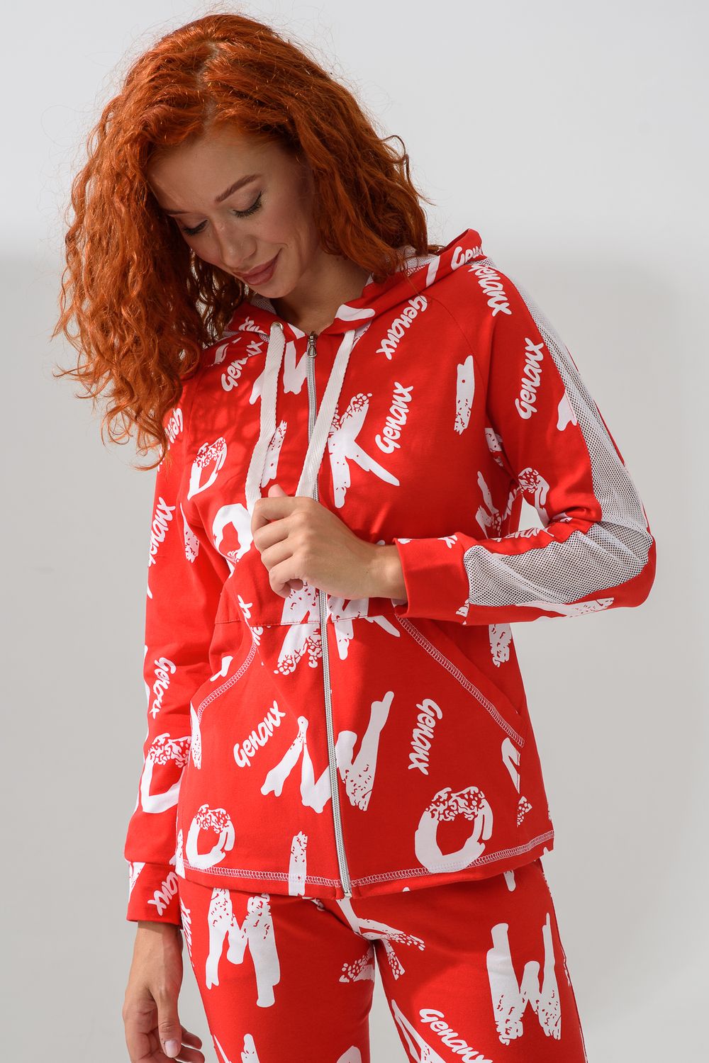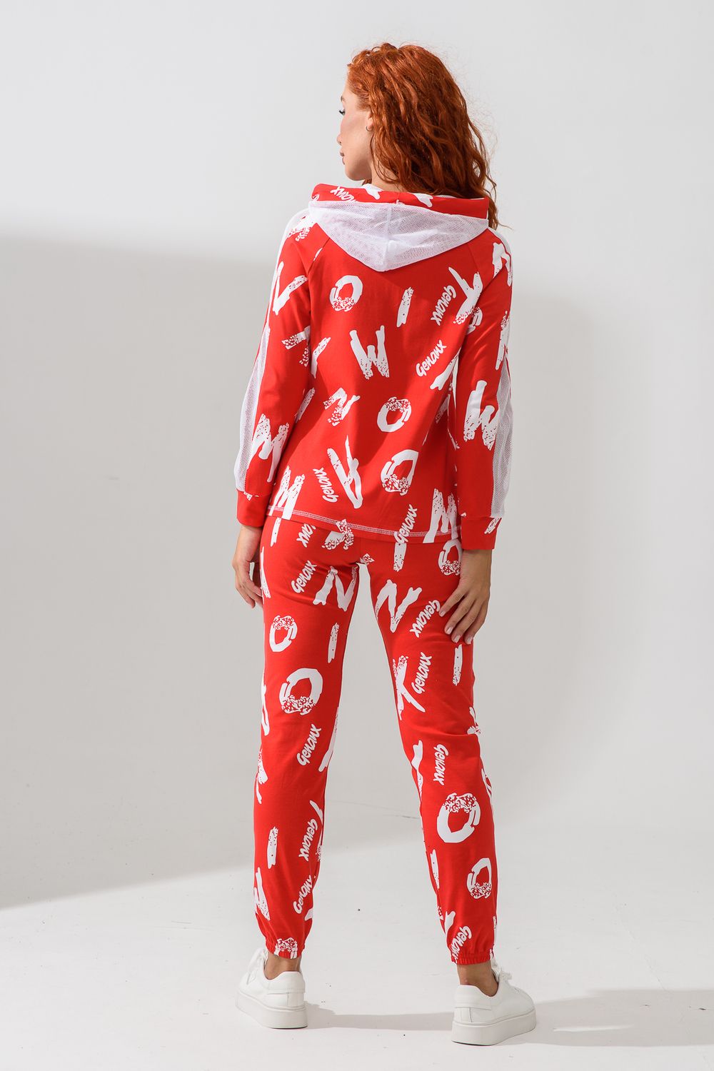 Костюм состоит из толстовки и брюк. Брюки на поясе, с боковыми карманами, на резинке по низу. Толстовка прямая, на молнии, с капюшоном из сетки, с карманами "кенгуру", длиной до середины бедра. Рукав реглан, длинный, с лампасами из сетки вдоль рукава, на манжете.