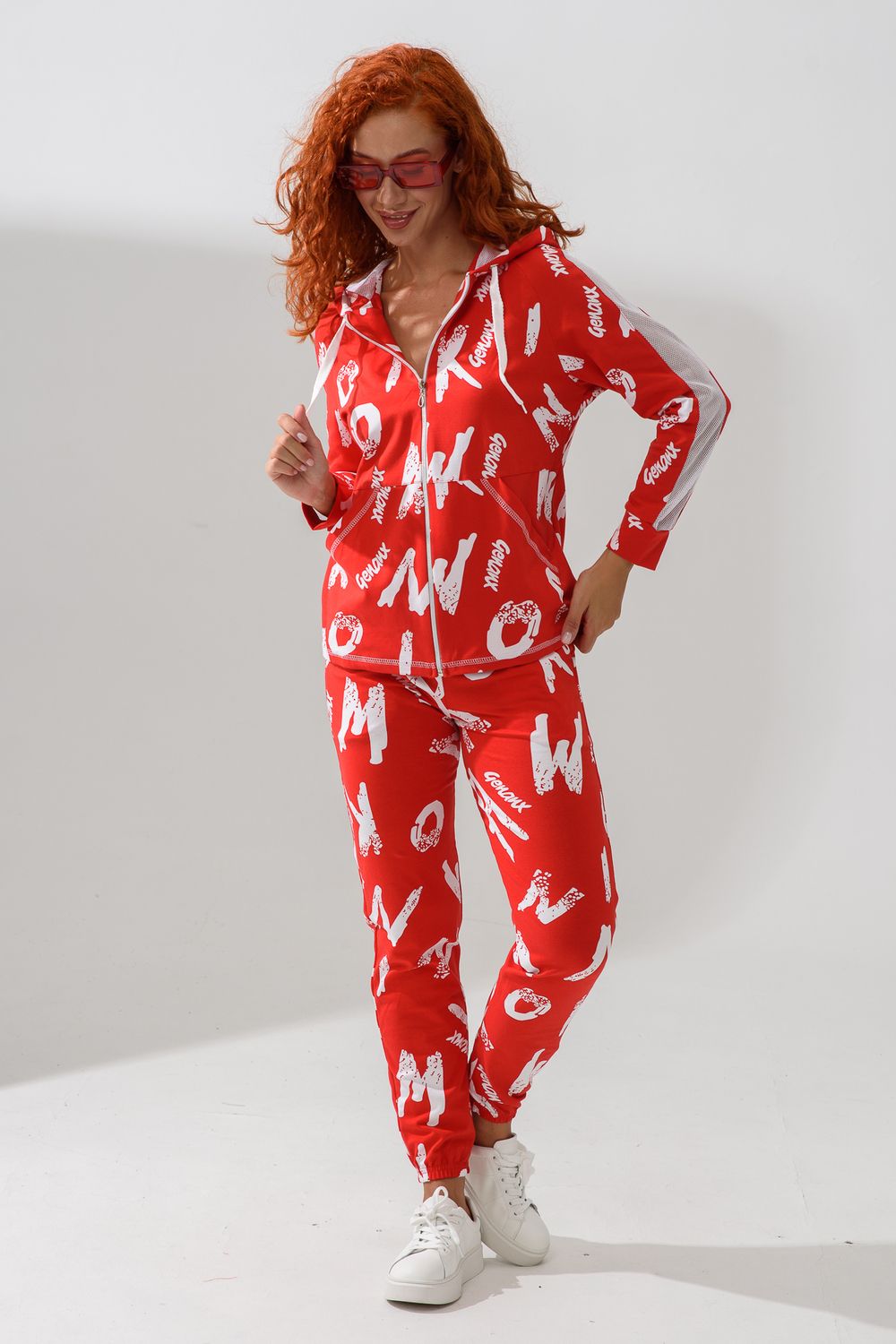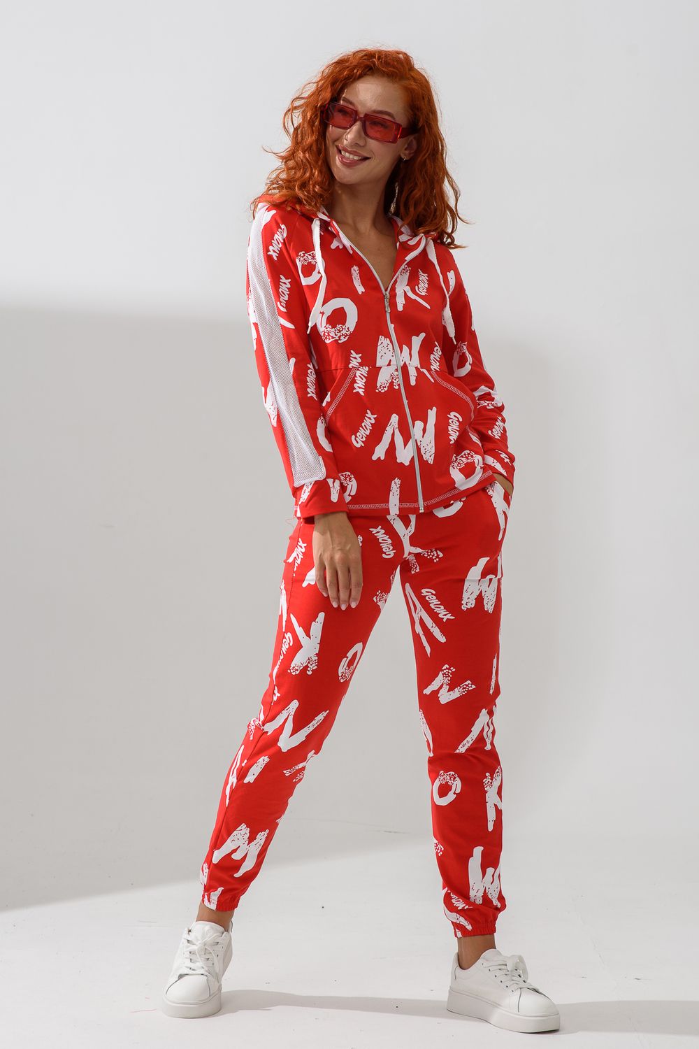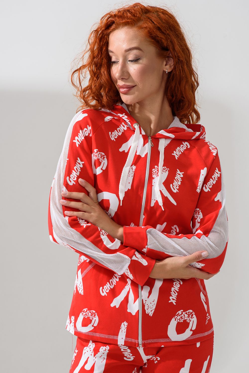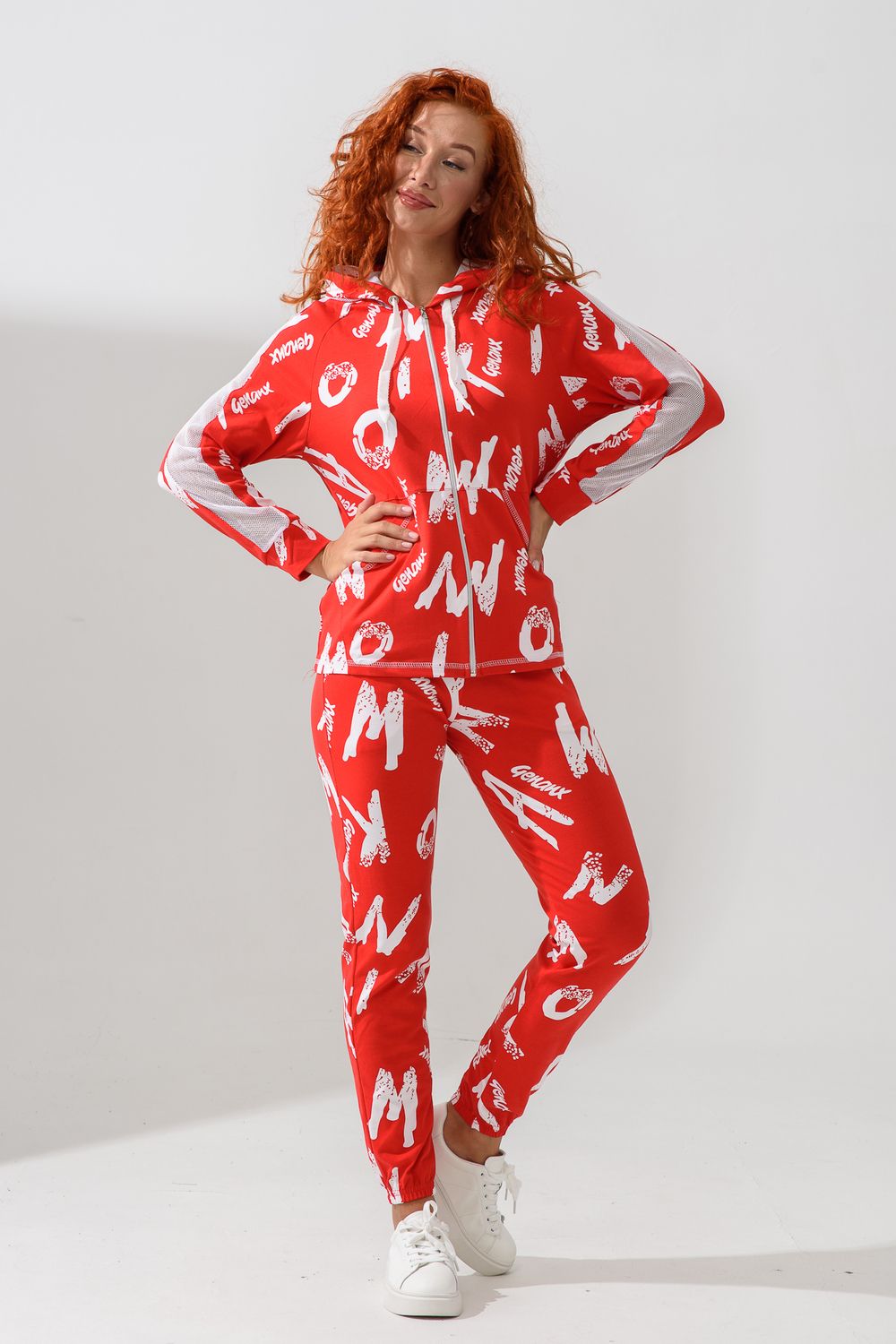 Костюм состоит из толстовки и брюк. Брюки на поясе, с боковыми карманами, на резинке по низу. Толстовка прямая, на молнии, с капюшоном из сетки, с карманами "кенгуру", длиной до середины бедра. Рукав реглан, длинный, с лампасами из сетки вдоль рукава, на манжете.