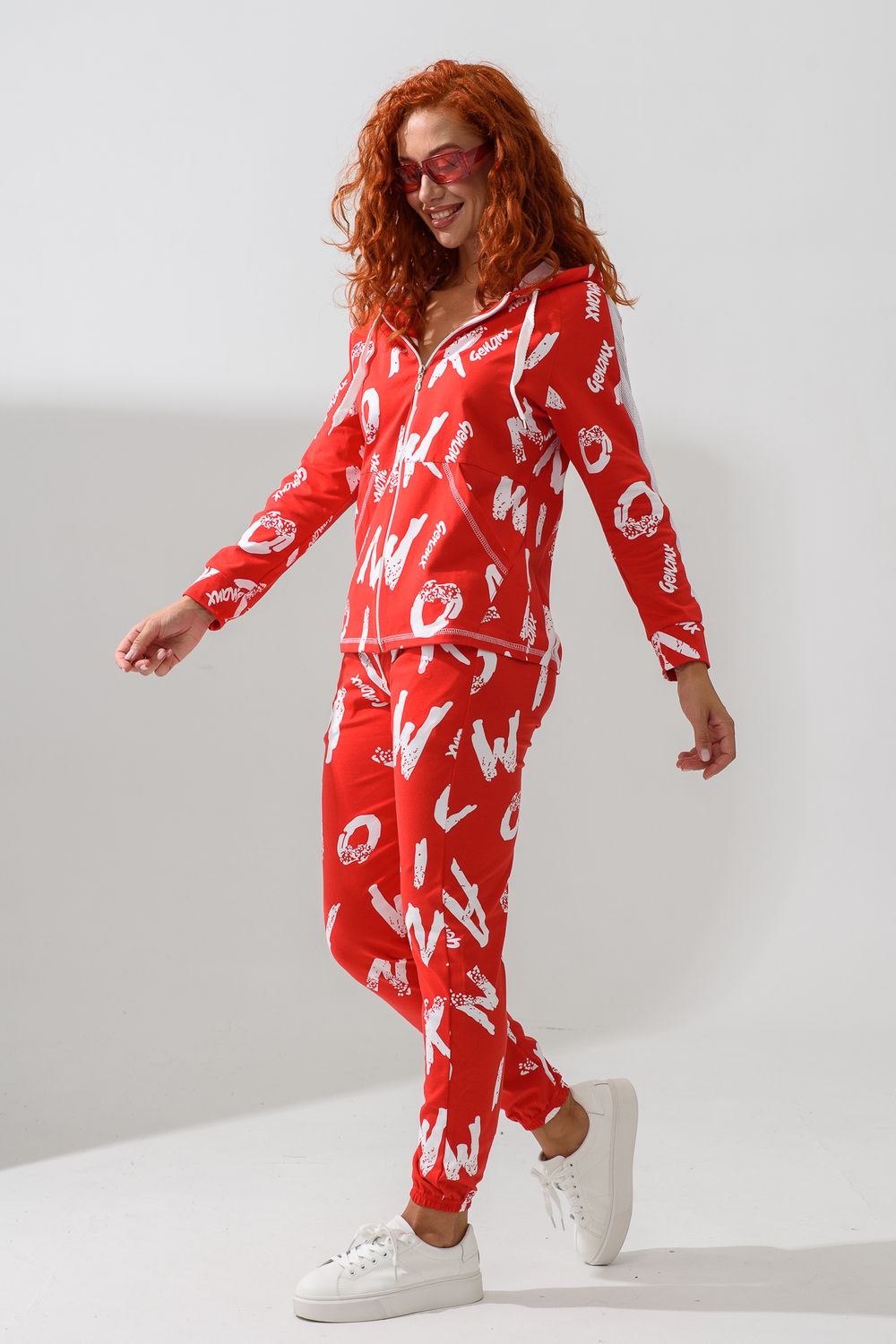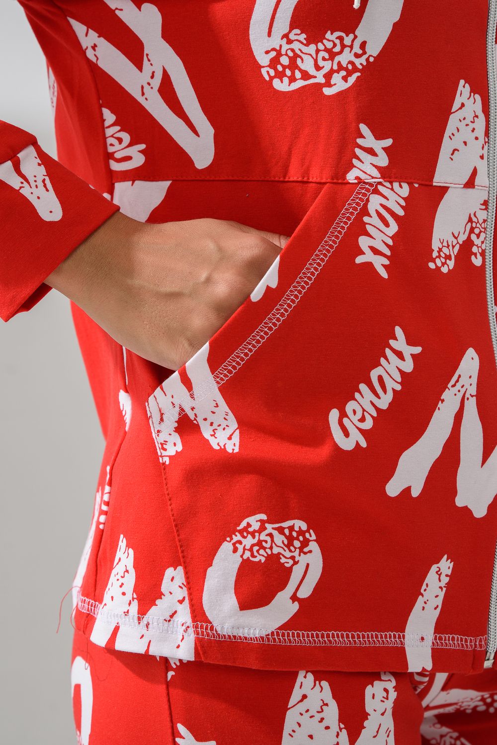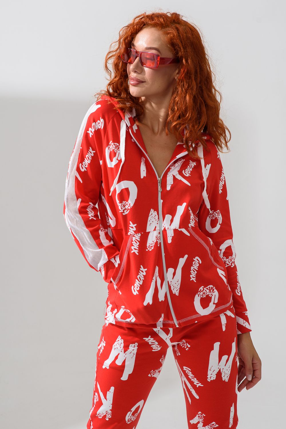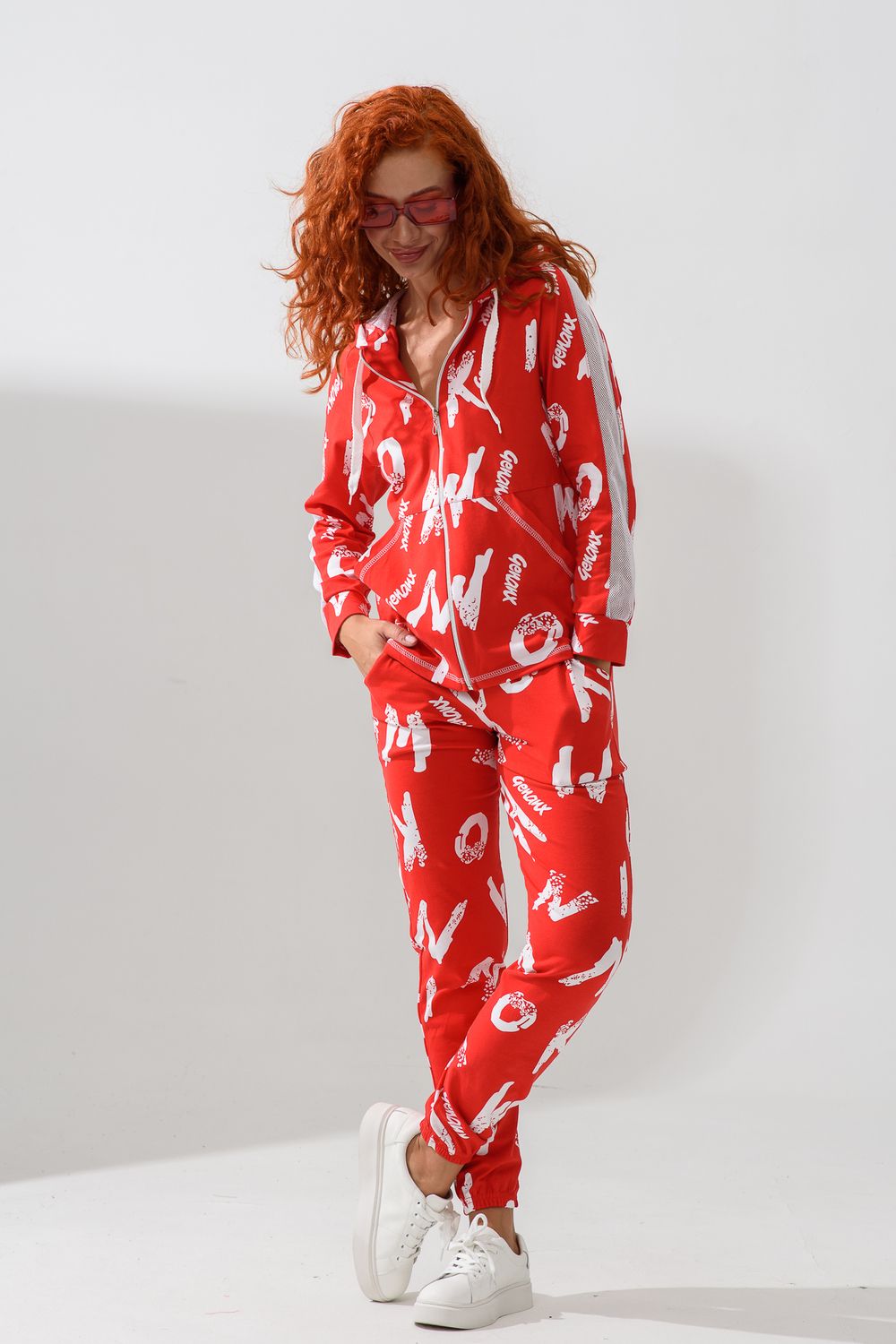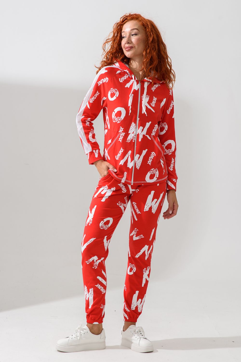 Костюм состоит из толстовки и брюк. Брюки на поясе, с боковыми карманами, на резинке по низу. Толстовка прямая, на молнии, с капюшоном из сетки, с карманами "кенгуру", длиной до середины бедра. Рукав реглан, длинный, с лампасами из сетки вдоль рукава, на манжете.