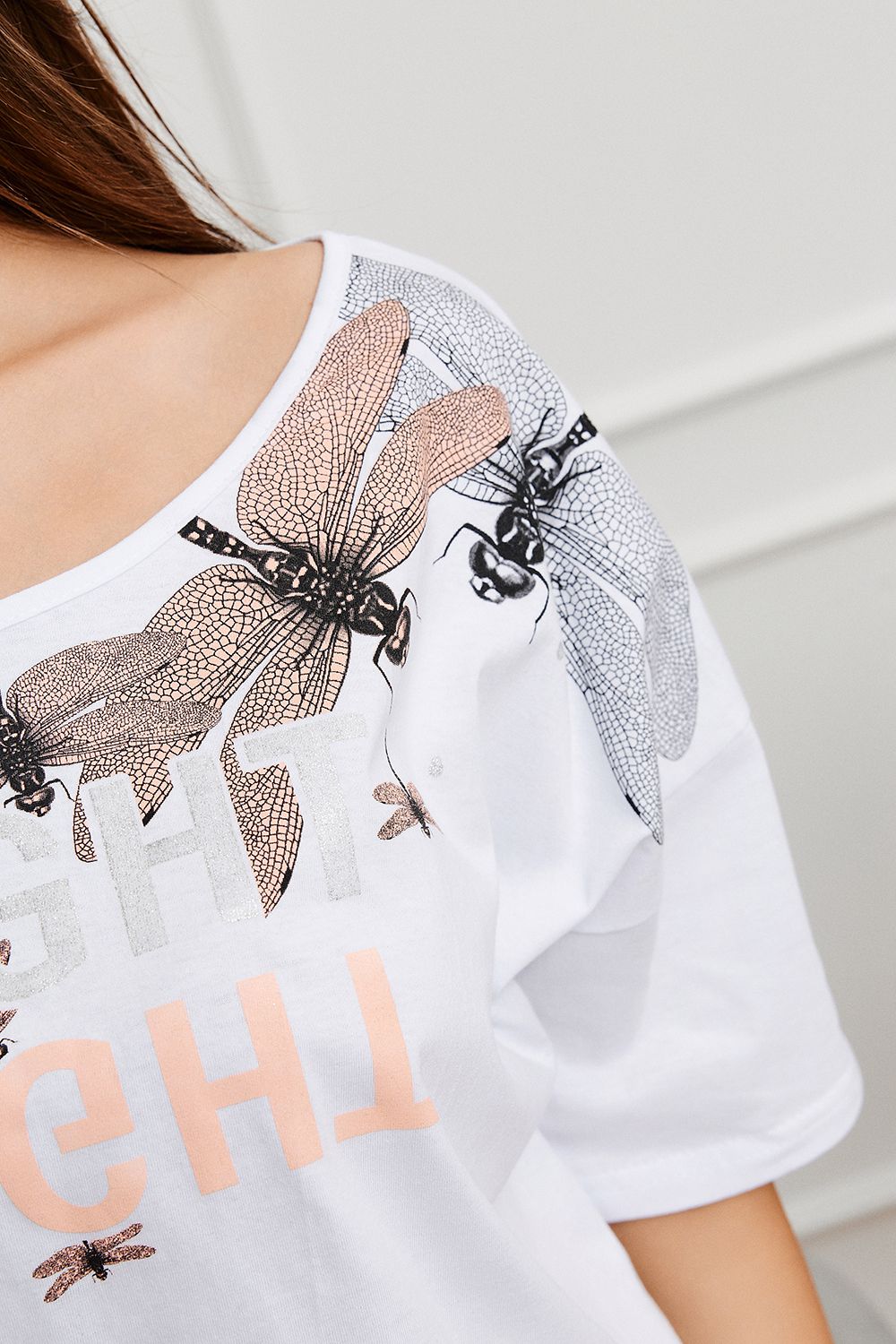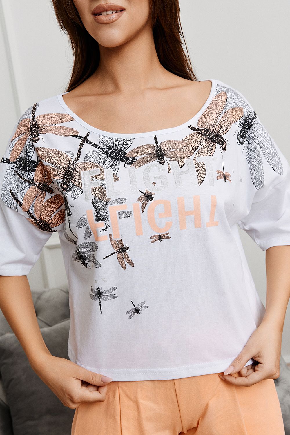 Костюм состоит из укороченной футболки "оверсайз" и шорт. Футболка с округлой горловиной. Рукав короткий. Горловина обработана бейкой из основного полотна. Шорты на поясе, с боковыми карманами и лампасами. В верхней части передних половинок по шву притачивания пояса расположены складки. В нижней части боковых швов обработаны разрезы.
