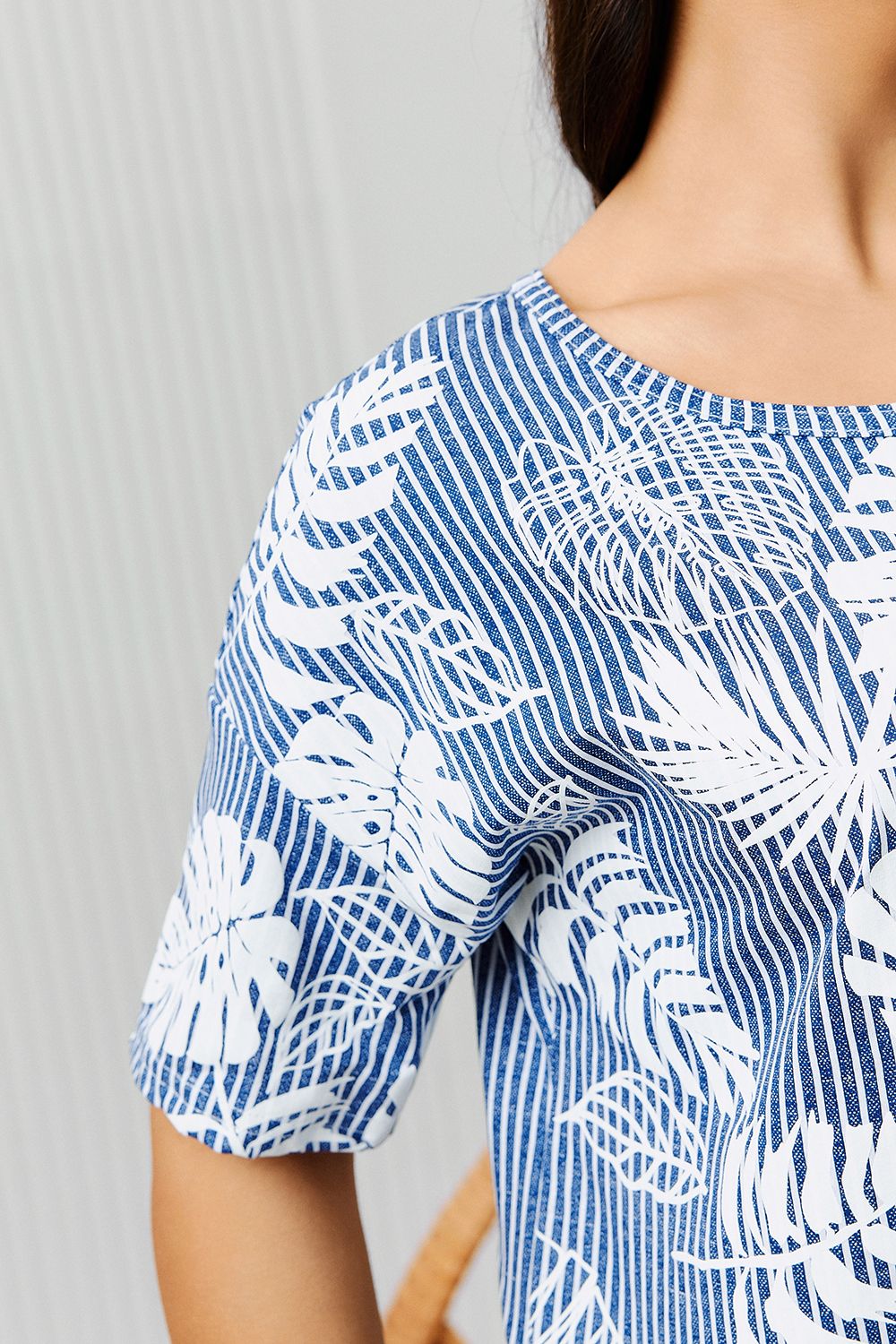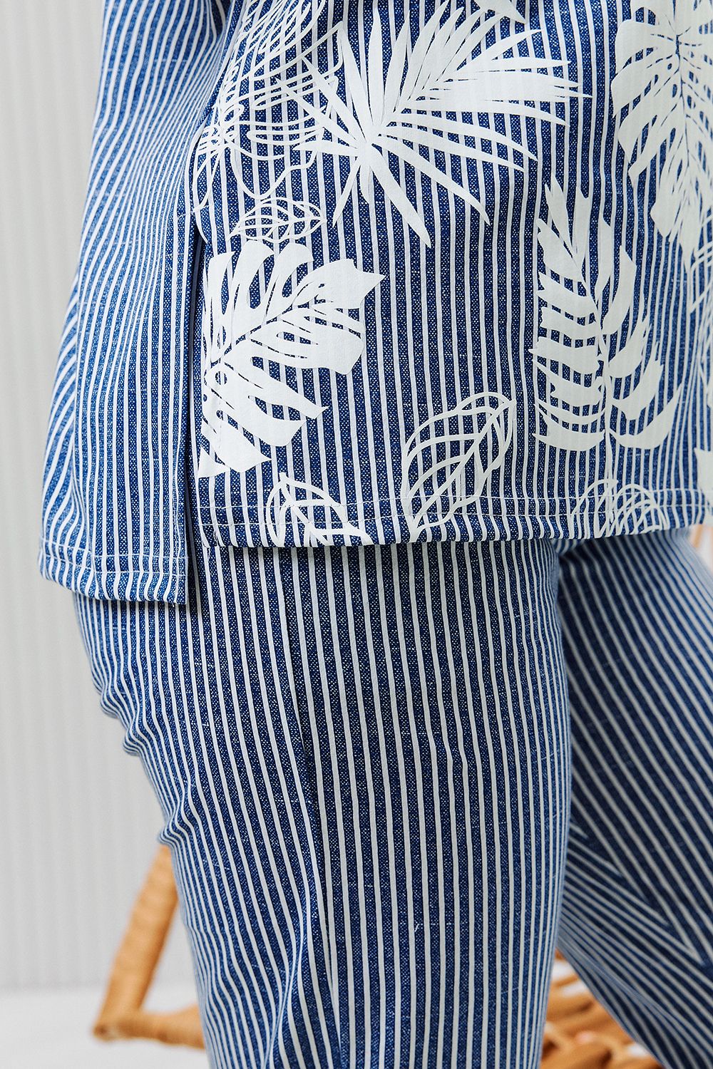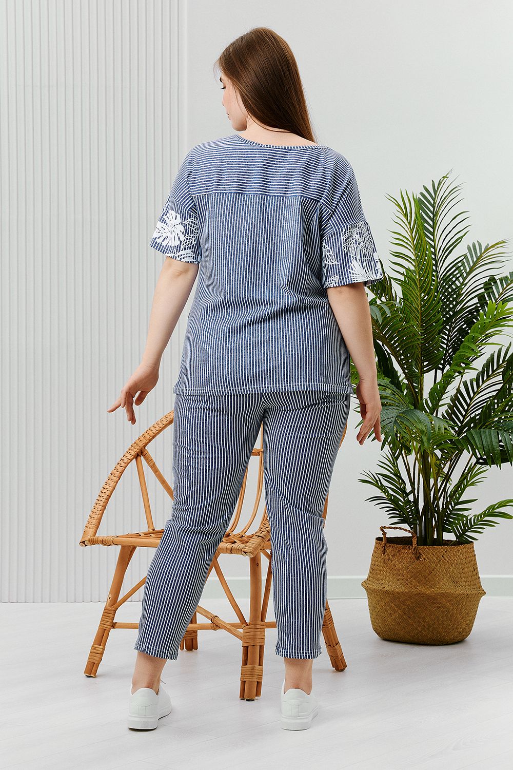 Костюм состоит из туники и брюк. Туника прямого силуэта, с округлой горловиной, длиной до середины бедра. Спинка с кокеткой. В нижней части боковых швов обработаны разрезы. Рукав короткий. Горловина обработана бейкой из основного полотна. Брюки на поясе, с боковыми карманами.