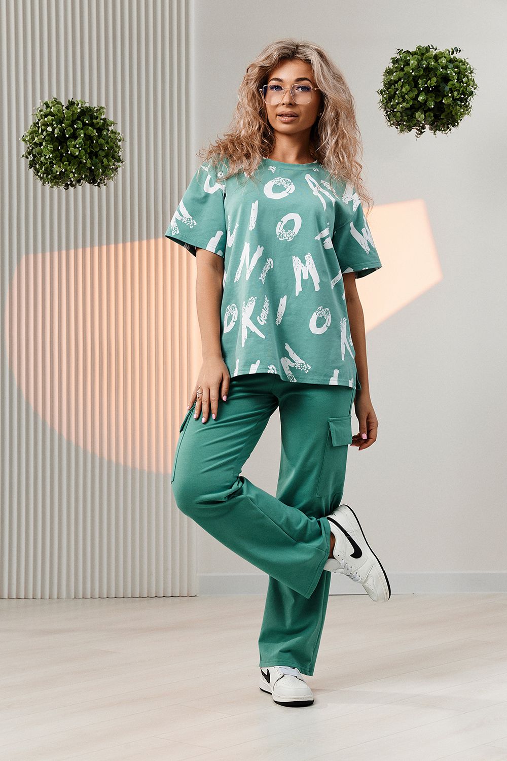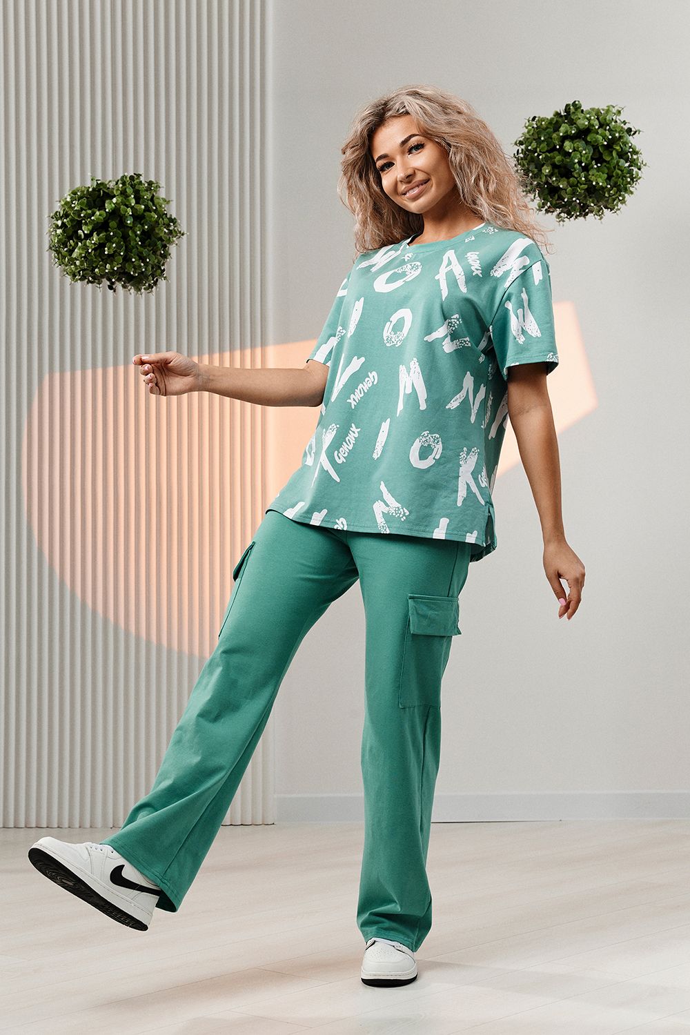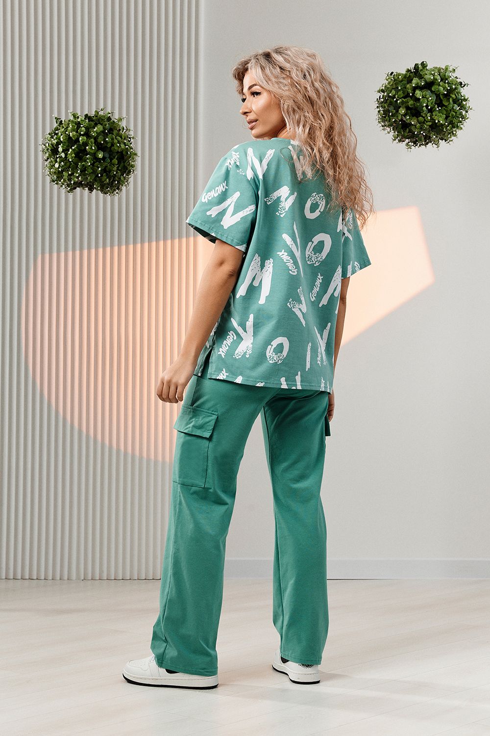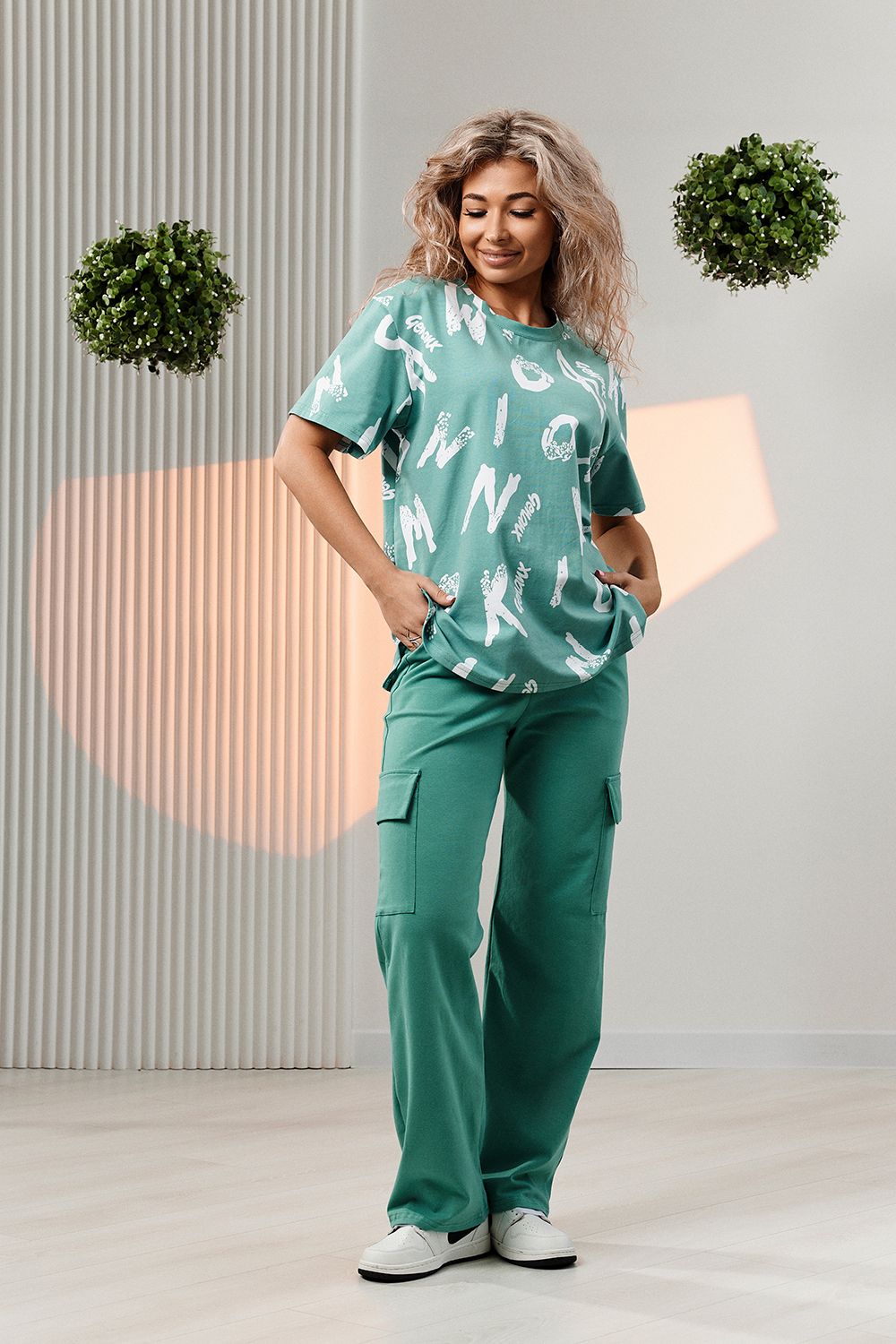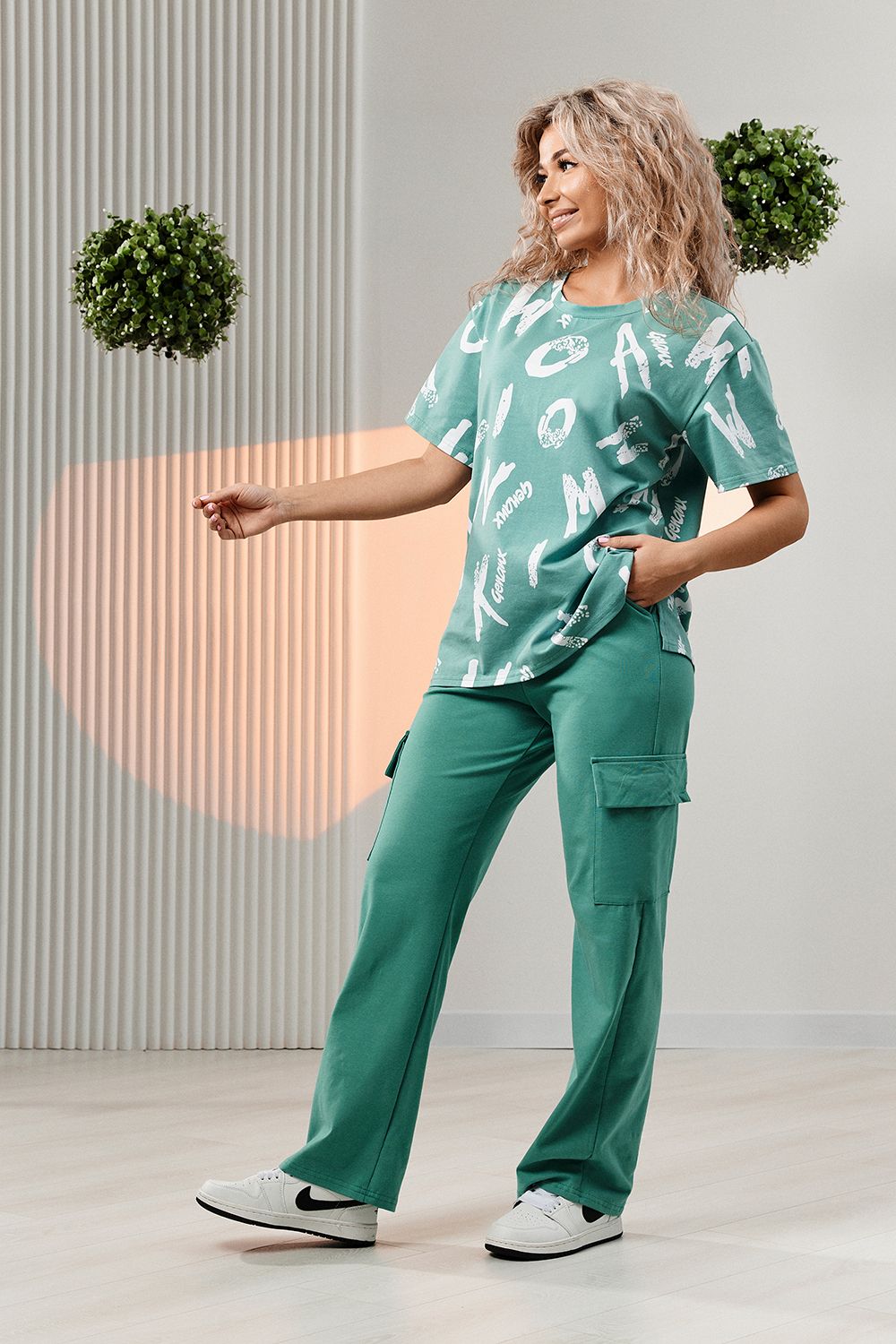 Костюм состоит из футболки и брюк. Футболка прямая, свободная, с округлой горловиной. В нижней части боковых швов футболки обработаны разрезы. Рукав короткий. Горловина обработана обтачкой из основного полотна. Брюки прямые, на поясе, с боковыми карманами, с накладными карманами и клапанами по боковым швам.
