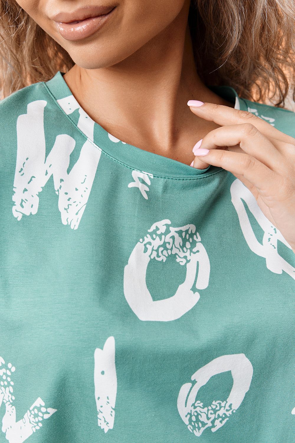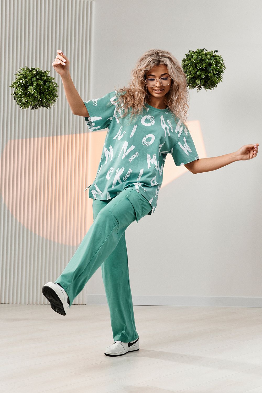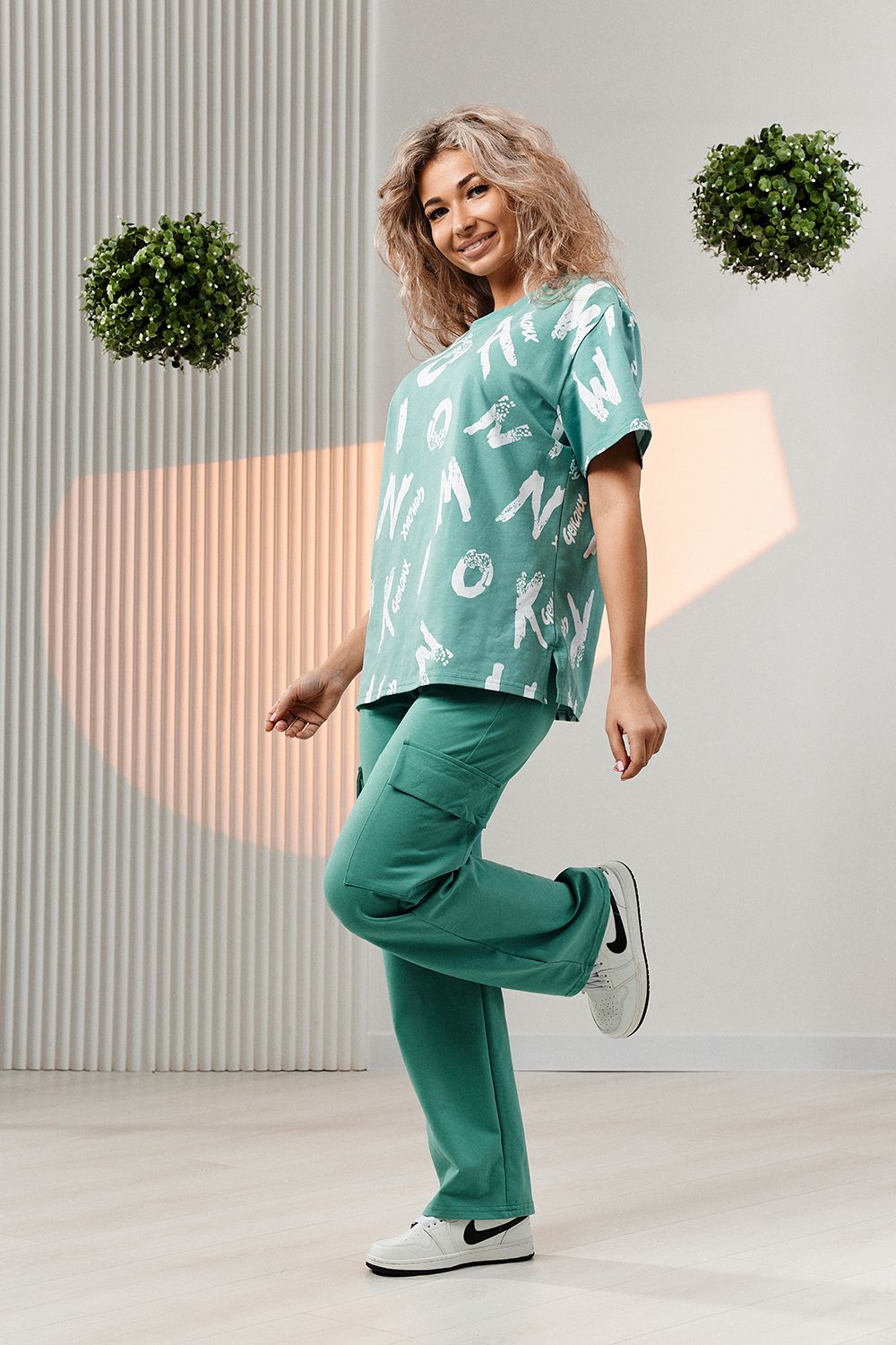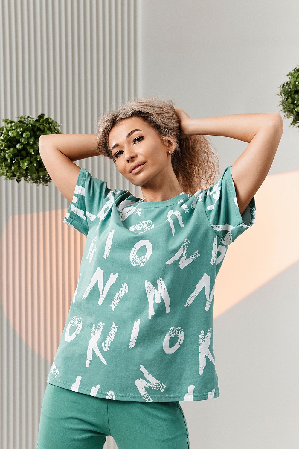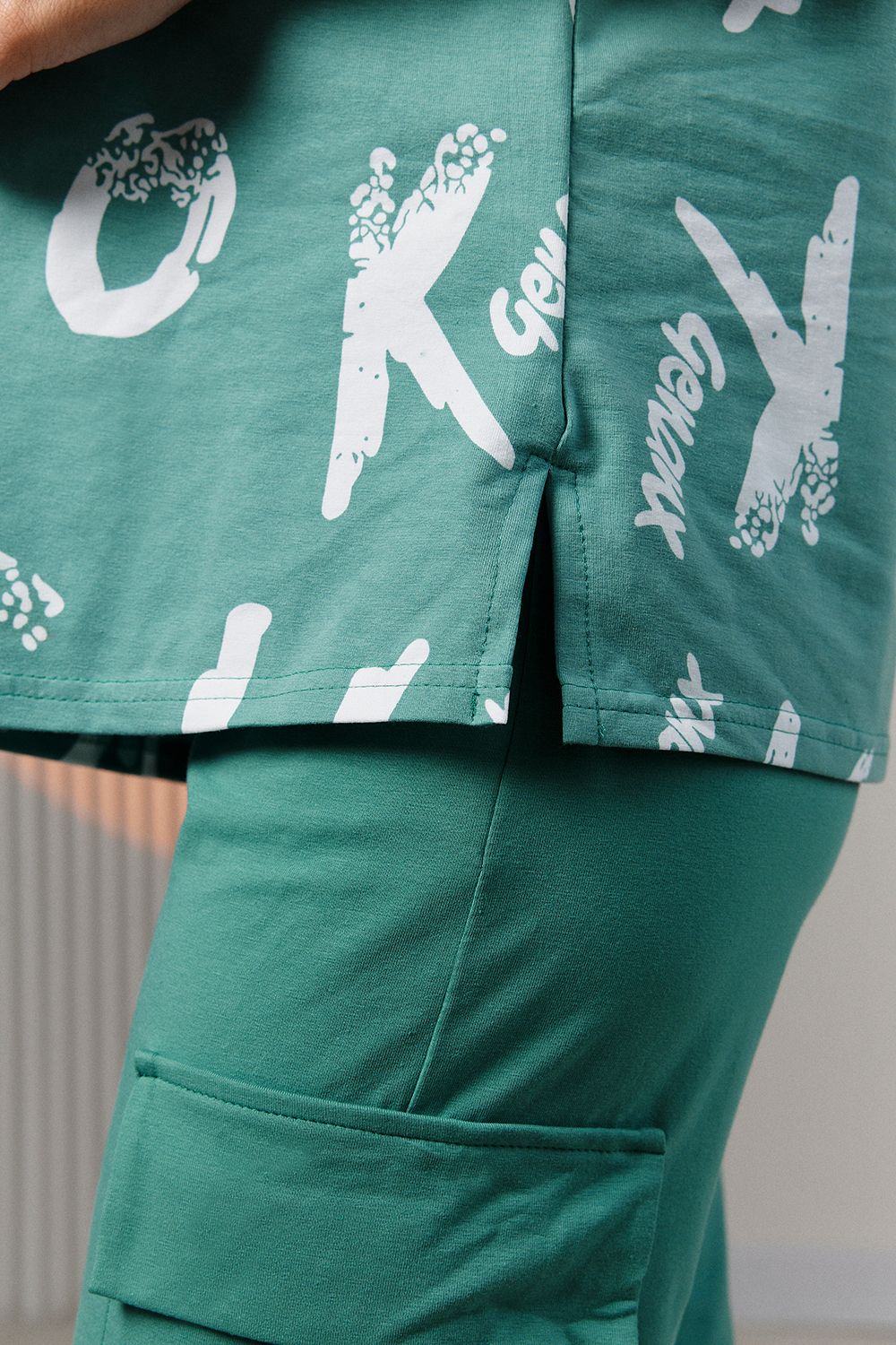 Костюм состоит из футболки и брюк. Футболка прямая, свободная, с округлой горловиной. В нижней части боковых швов футболки обработаны разрезы. Рукав короткий. Горловина обработана обтачкой из основного полотна. Брюки прямые, на поясе, с боковыми карманами, с накладными карманами и клапанами по боковым швам.