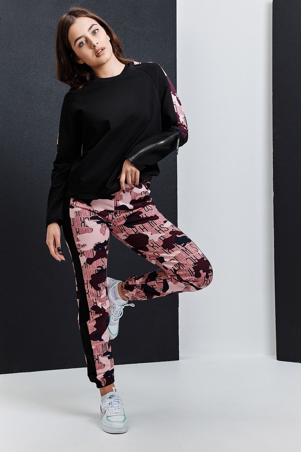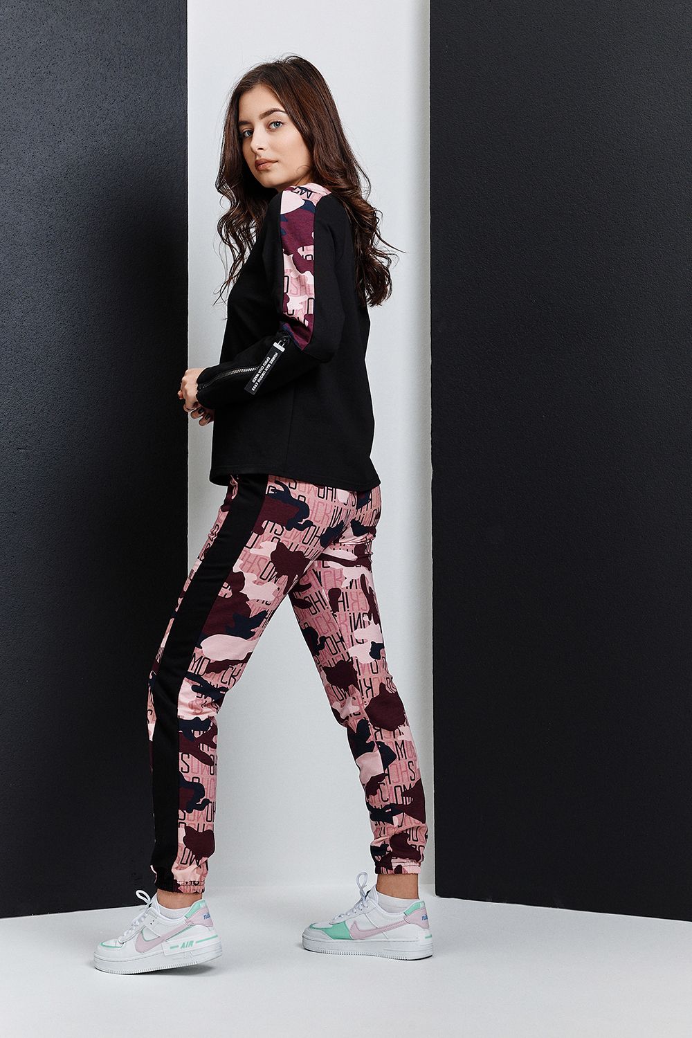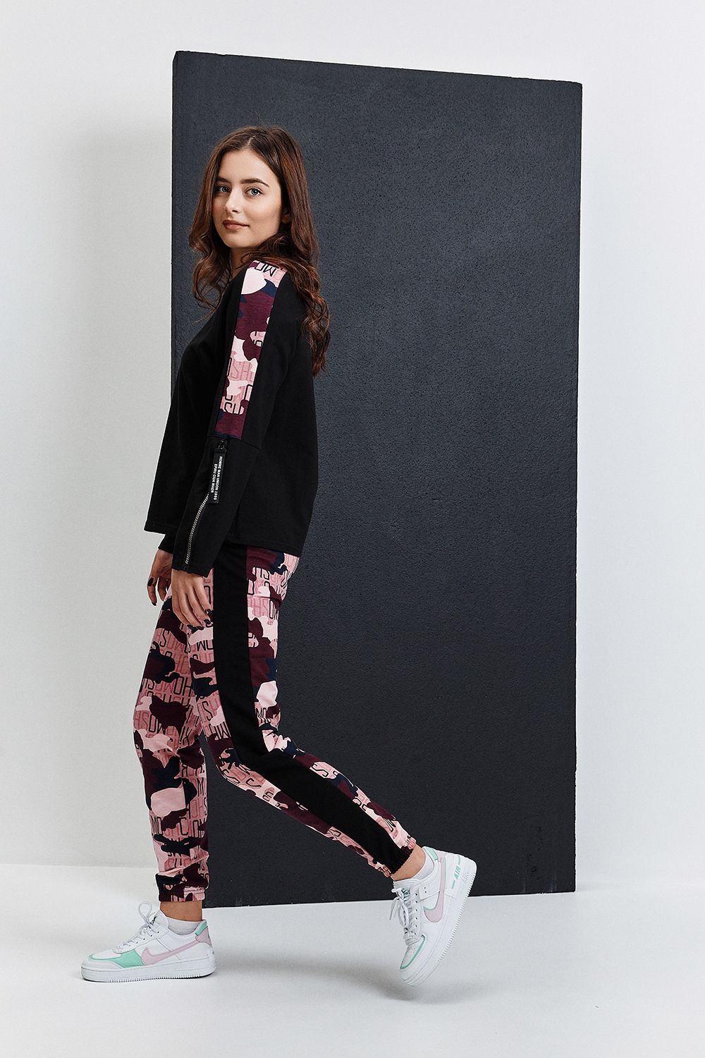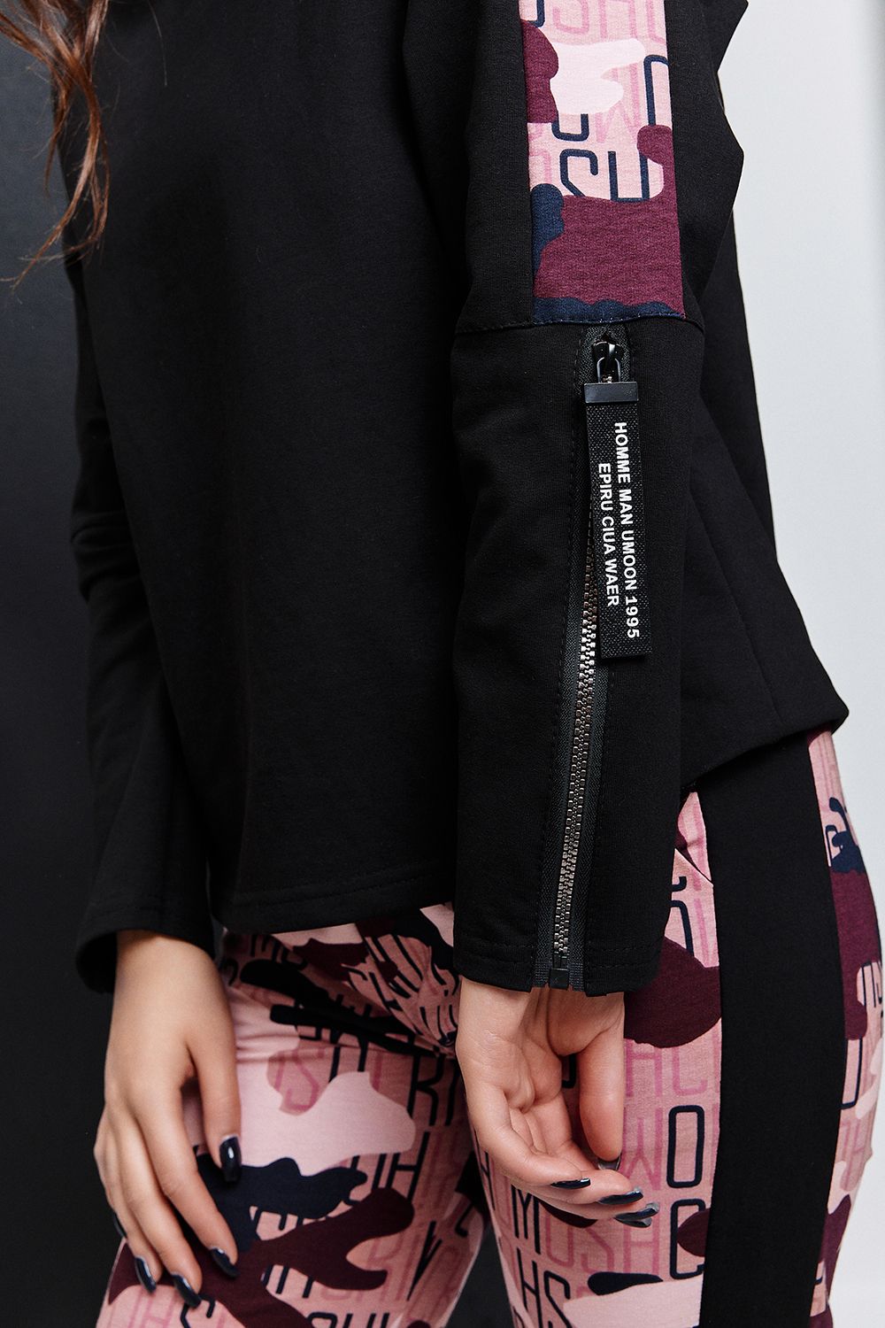 Костюм состоит из туники и брюк. Туника прямая, с округлой горловиной, средней дины. Рукав реглан, длинный, с лампасом из отделочного полотна вдоль рукава и декоративными молниями. Горловина обработана обтачкой из эластичного полотна. Брюки прямые, на поясе, с боковыми карманами, с лампасами из отделочного полотна вдоль боковых швов, с резинкой по низу.