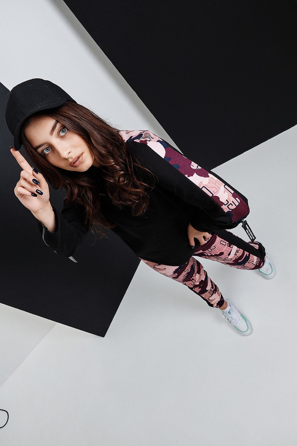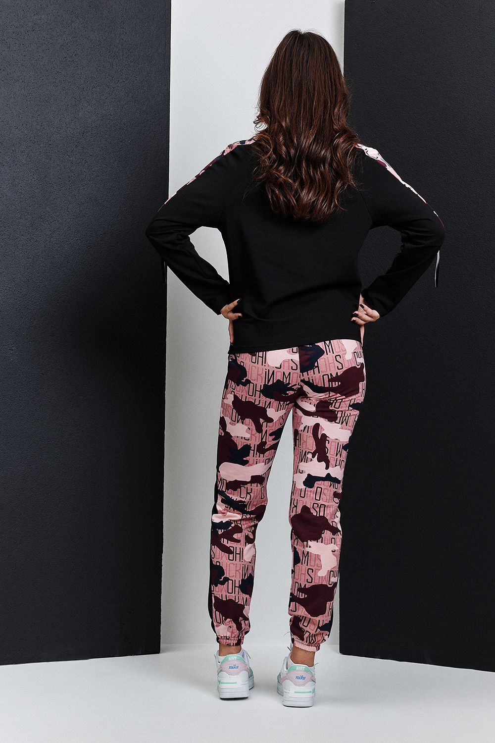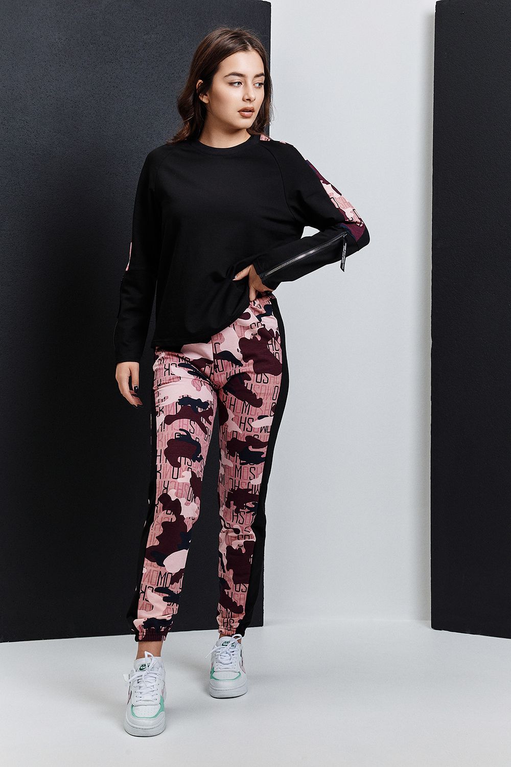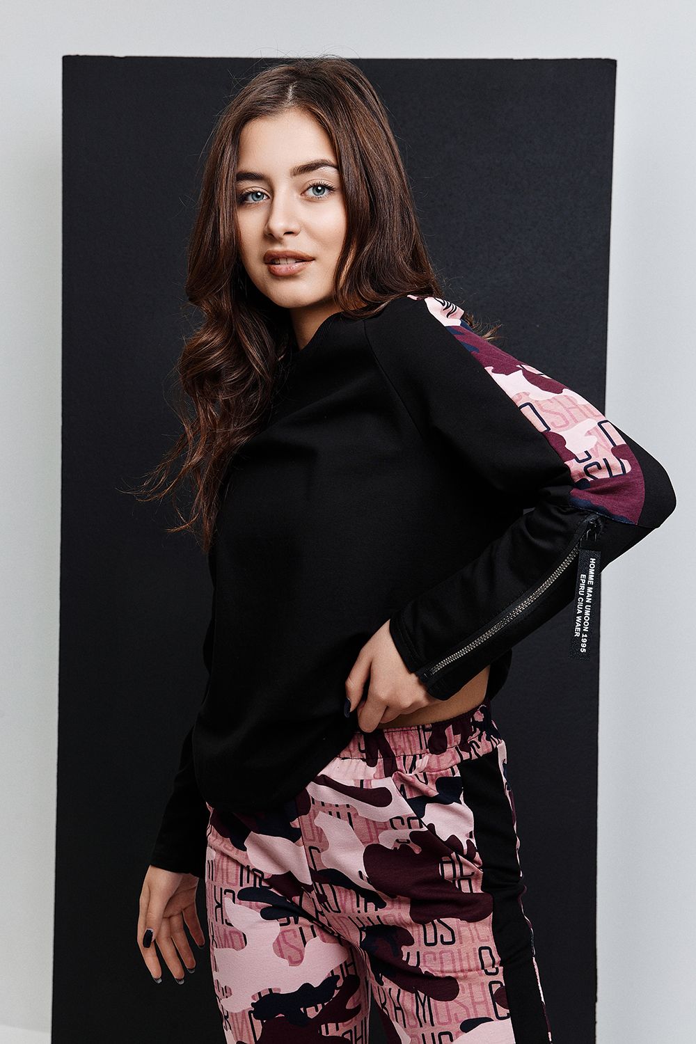 Костюм состоит из туники и брюк. Туника прямая, с округлой горловиной, средней дины. Рукав реглан, длинный, с лампасом из отделочного полотна вдоль рукава и декоративными молниями. Горловина обработана обтачкой из эластичного полотна. Брюки прямые, на поясе, с боковыми карманами, с лампасами из отделочного полотна вдоль боковых швов, с резинкой по низу.