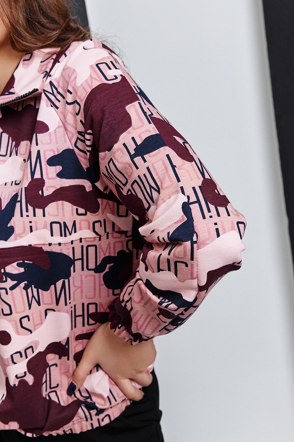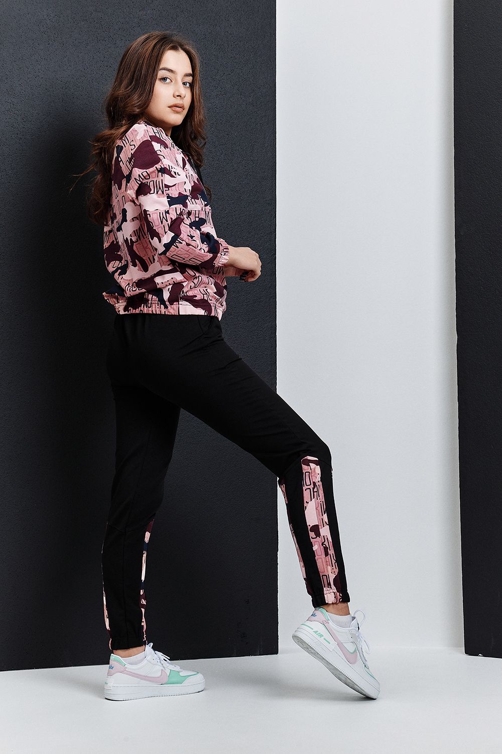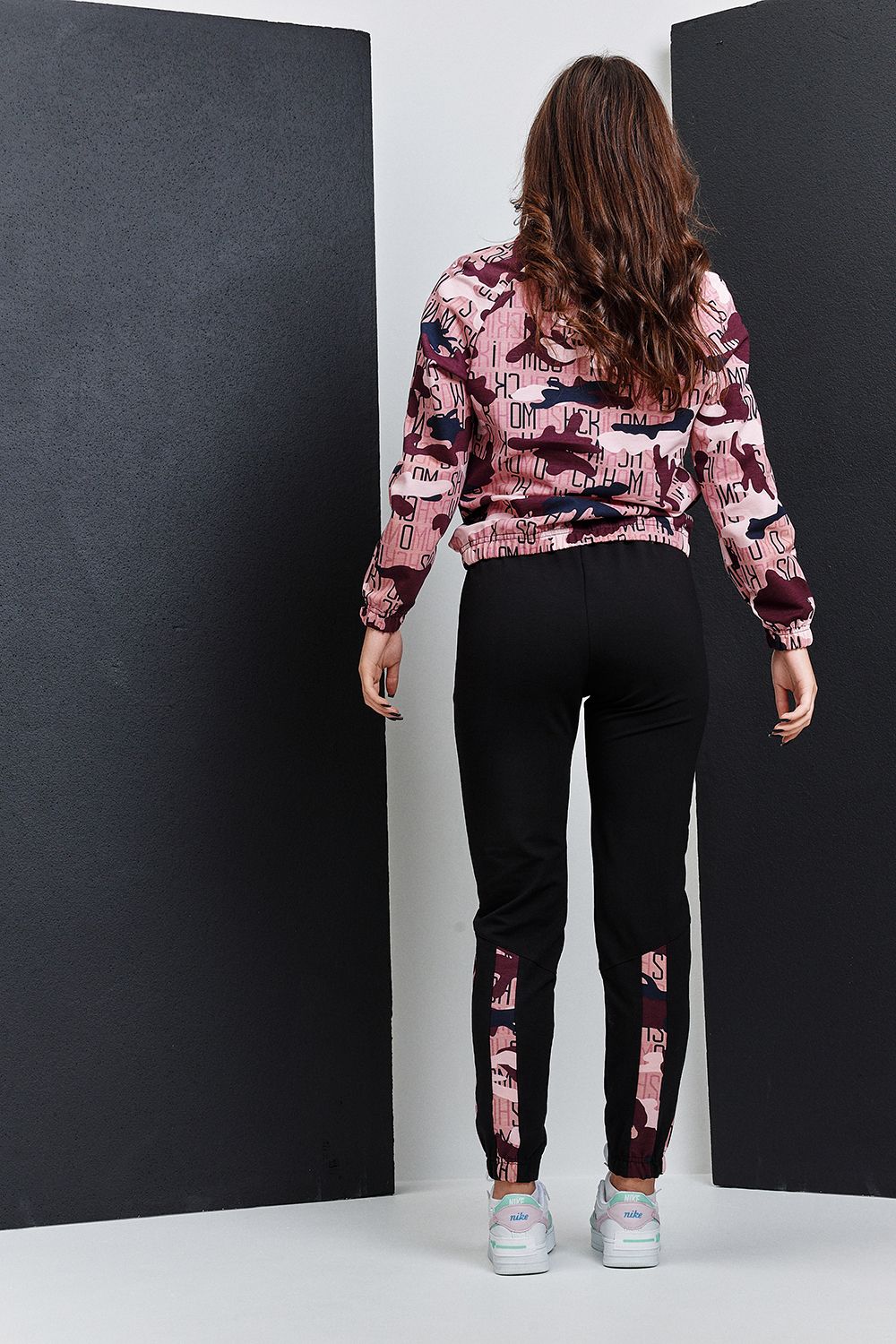 Костюм состоит из толстовки и брюк. Толстовка, с воротником, с молнией до середины полочки, низ собран на резинку. Рукав реглан, длинный, низ на резинке. Брюки, на поясе, с боковыми карманами, с резинкой по низу. В нижней части брюк расположены вставки из отделочного полотна.