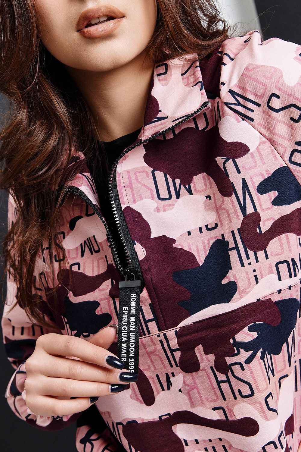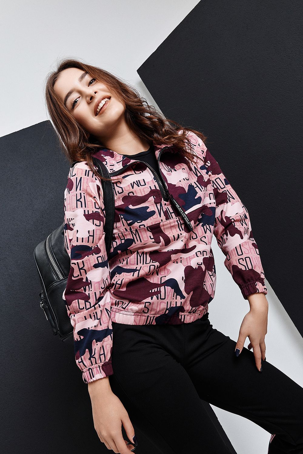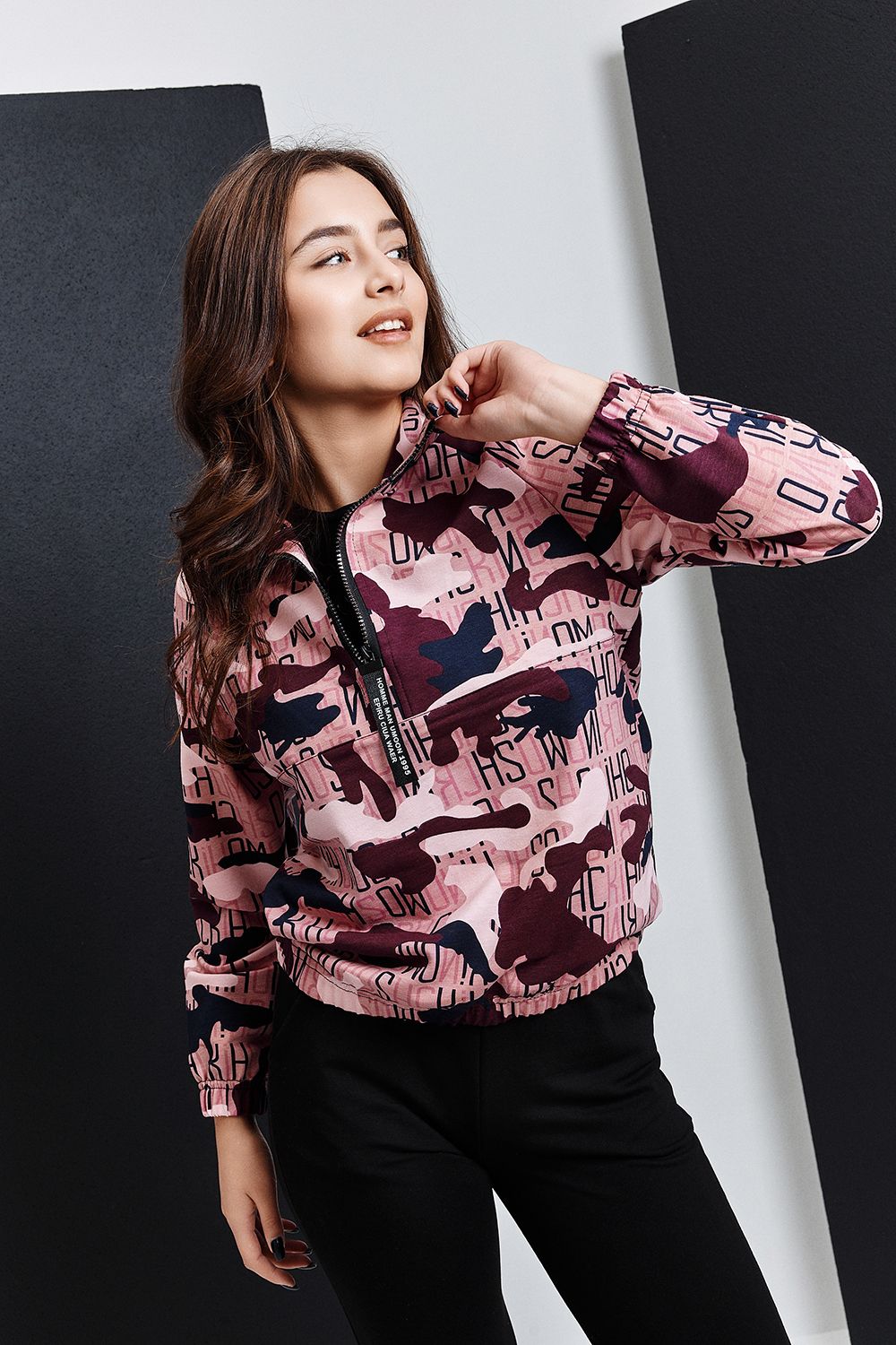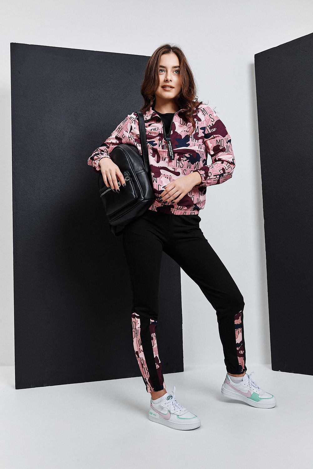Костюм состоит из толстовки и брюк. Толстовка, с воротником, с молнией до середины полочки, низ собран на резинку. Рукав реглан, длинный, низ на резинке. Брюки, на поясе, с боковыми карманами, с резинкой по низу. В нижней части брюк расположены вставки из отделочного полотна.