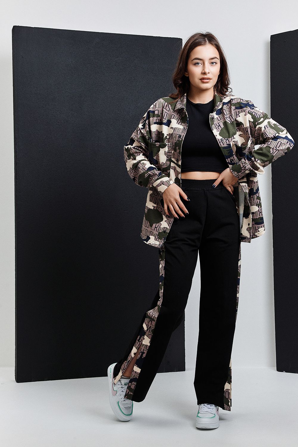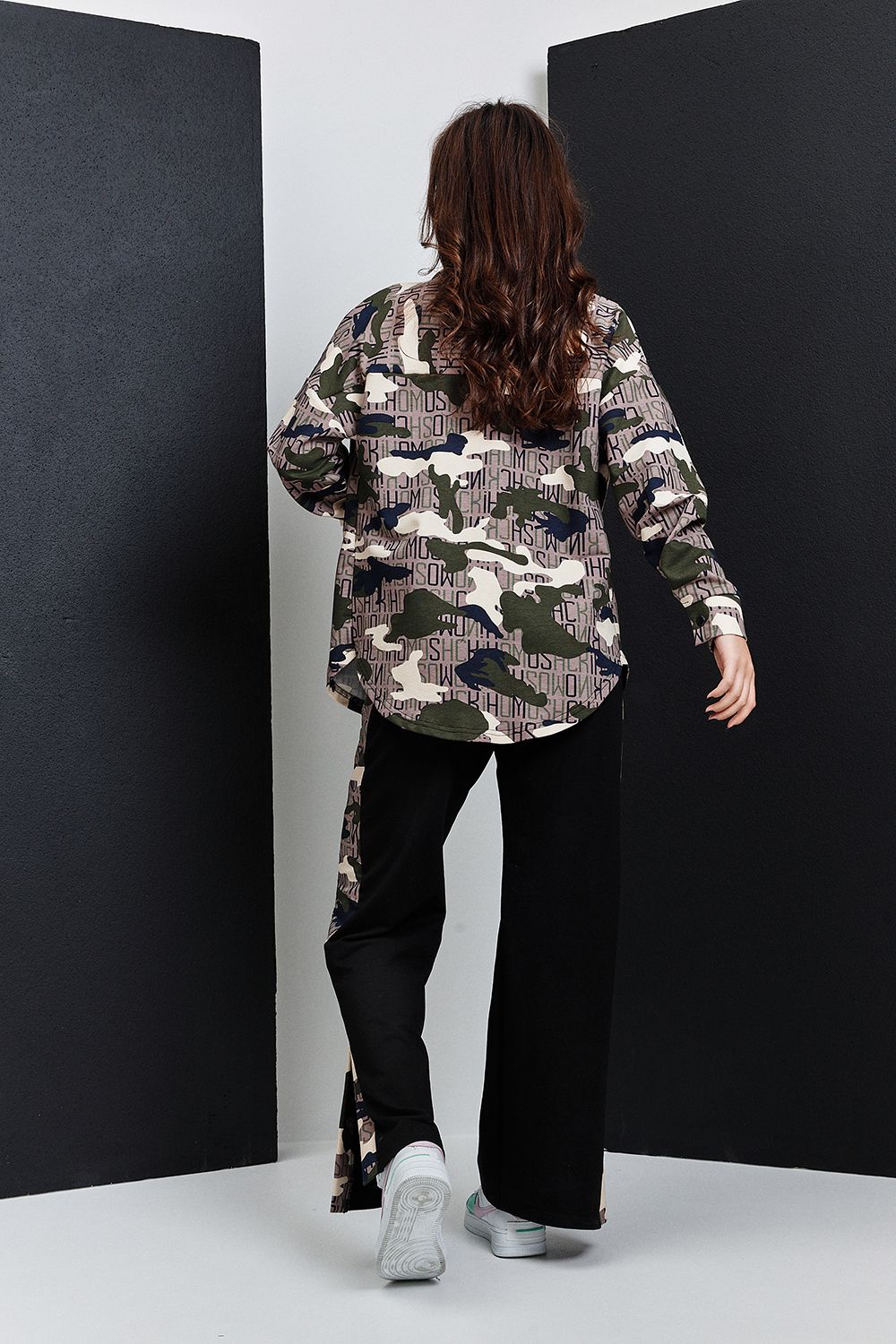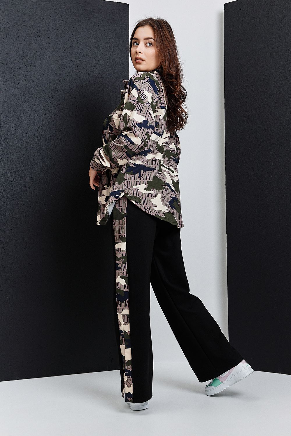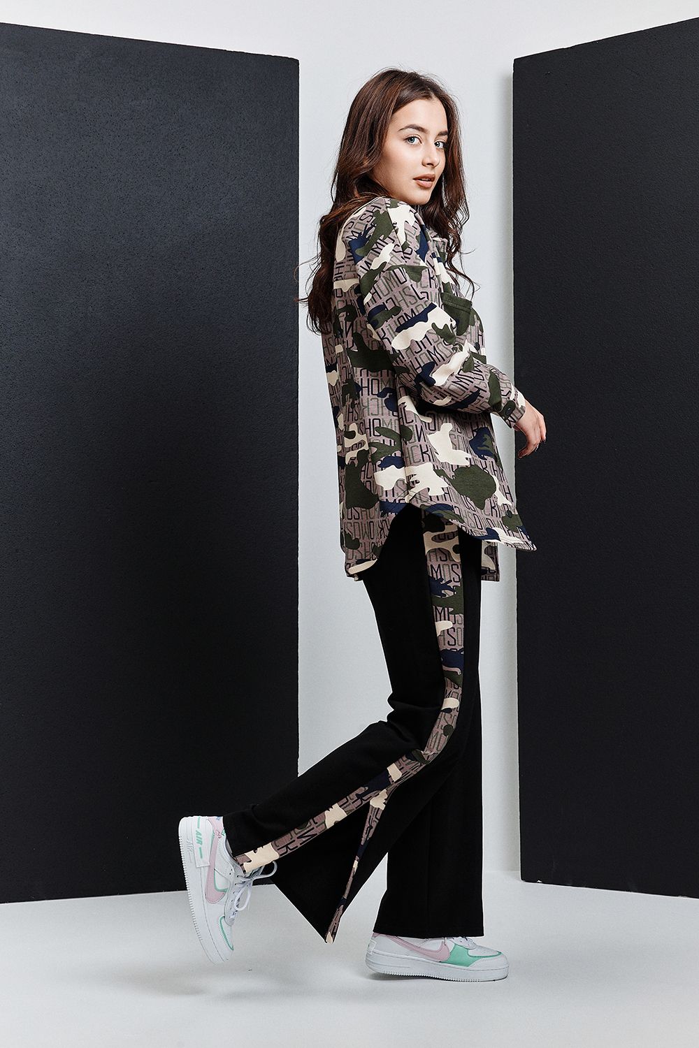 Костюм состоит из рубашки и брюк. Рубашка на кнопках, с отложным воротником, с накладными карманами, с фигурной линией низа. Рукав длинный, на манжете, с застежкой на кнопки. Спинка с кокеткой. Брюки прямые, на поясе, с боковыми карманами, с лампасами из отделочного полотна вдоль боковых швов. В нижней части лампасов обработаны разрезы.