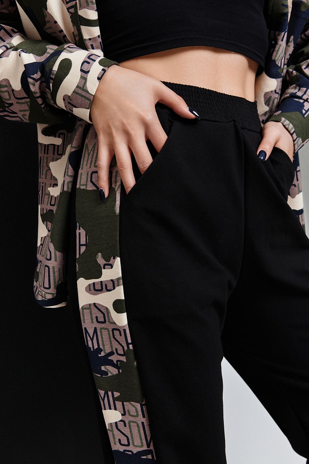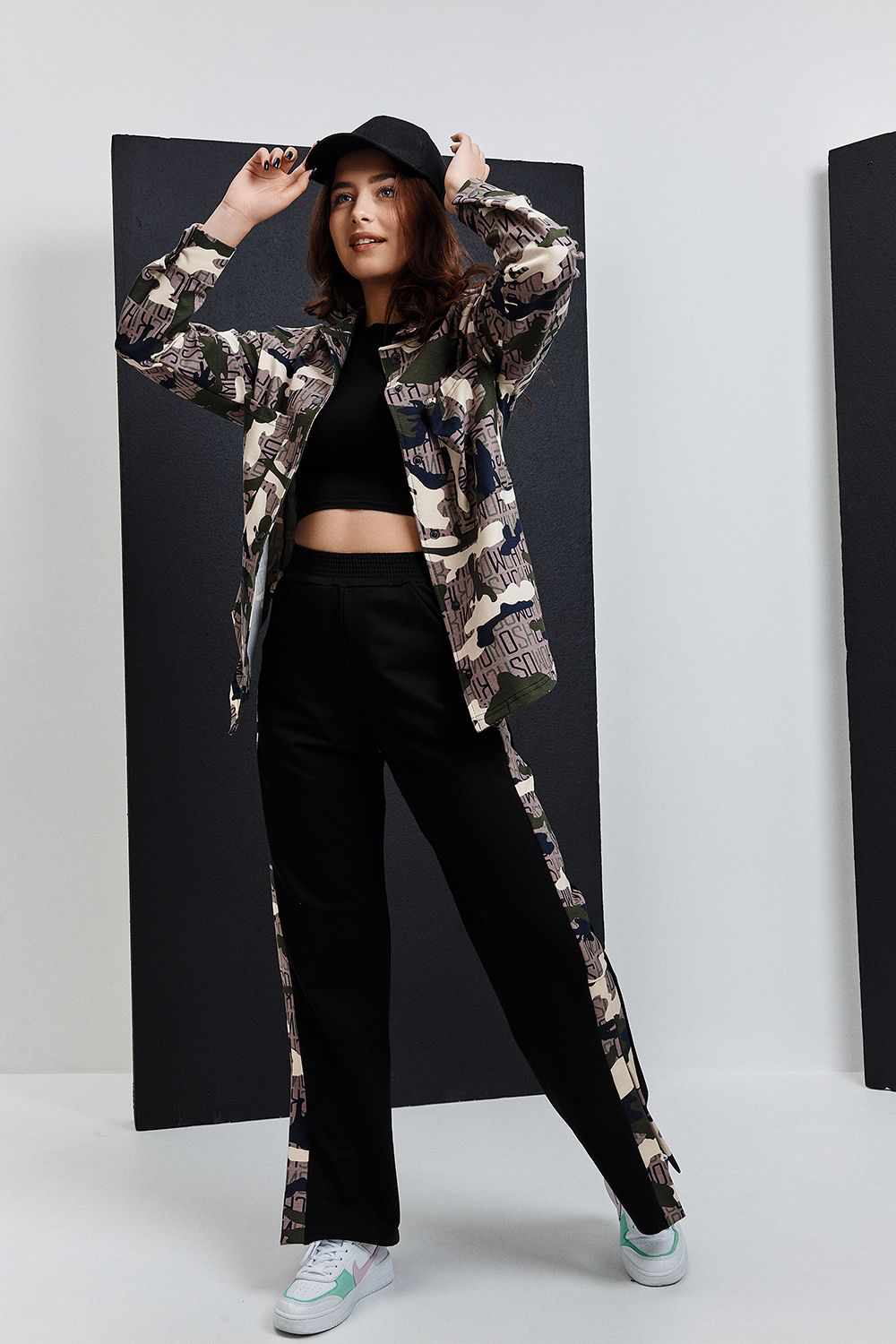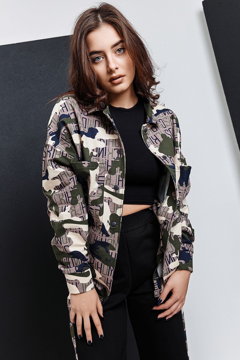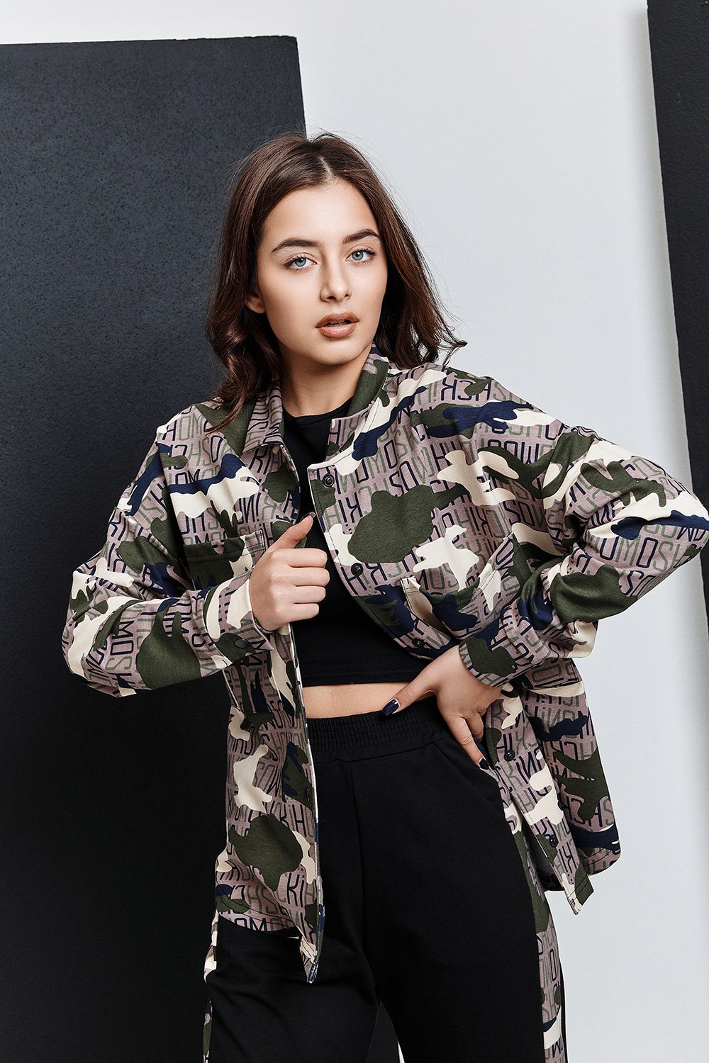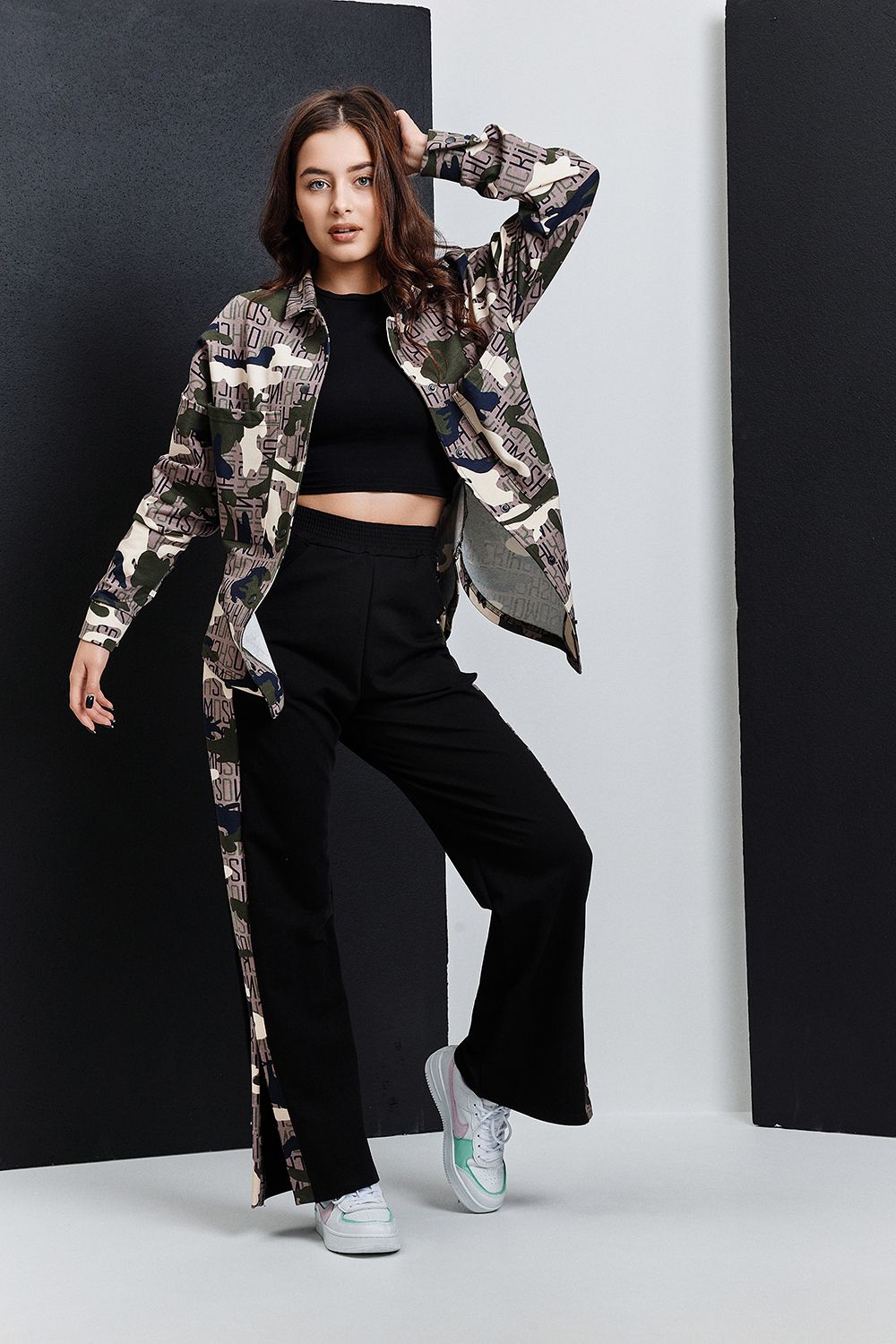 Костюм состоит из рубашки и брюк. Рубашка на кнопках, с отложным воротником, с накладными карманами, с фигурной линией низа. Рукав длинный, на манжете, с застежкой на кнопки. Спинка с кокеткой. Брюки прямые, на поясе, с боковыми карманами, с лампасами из отделочного полотна вдоль боковых швов. В нижней части лампасов обработаны разрезы.