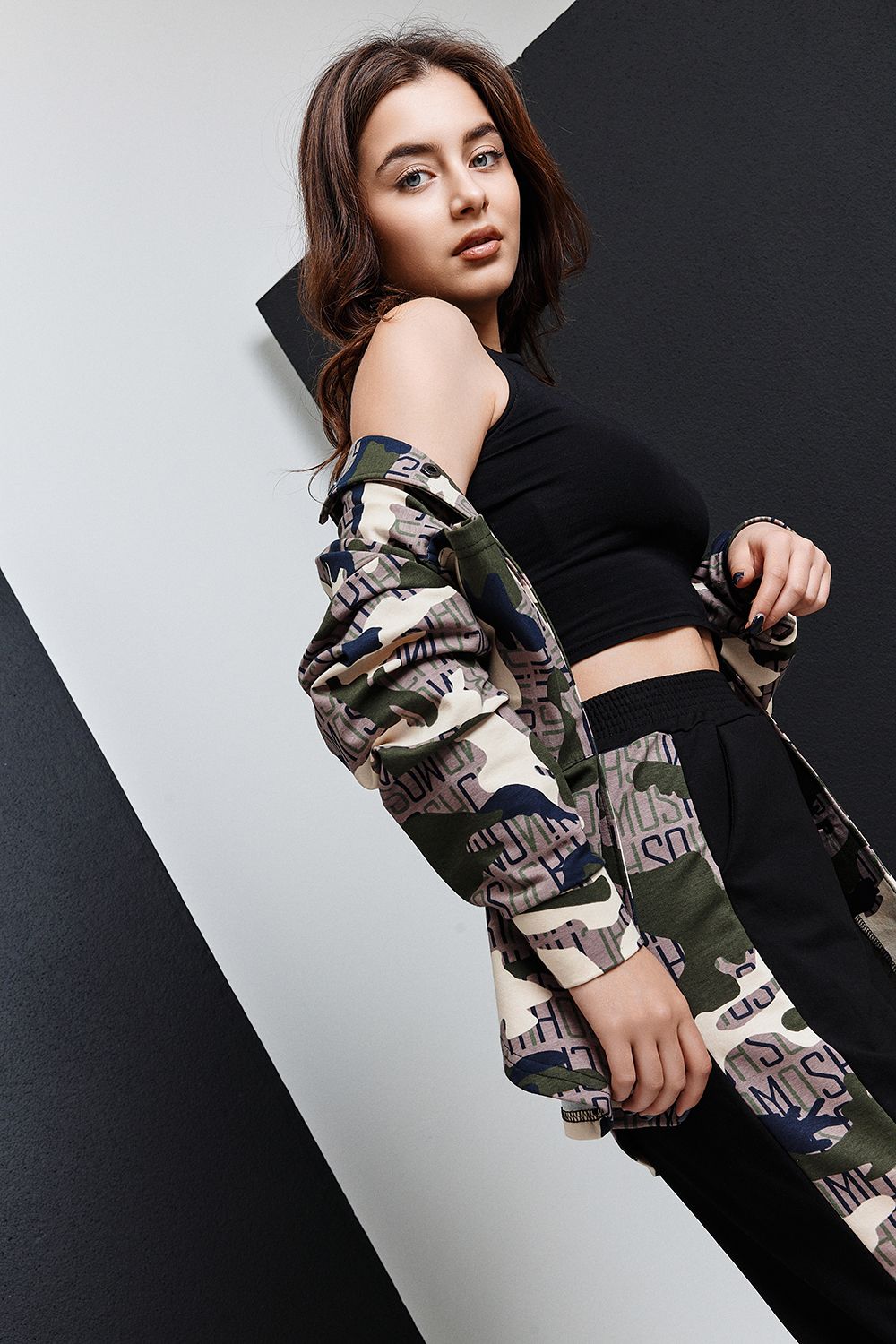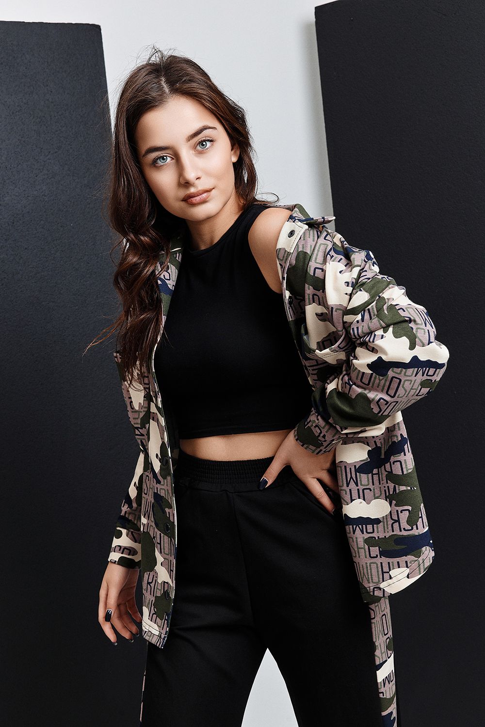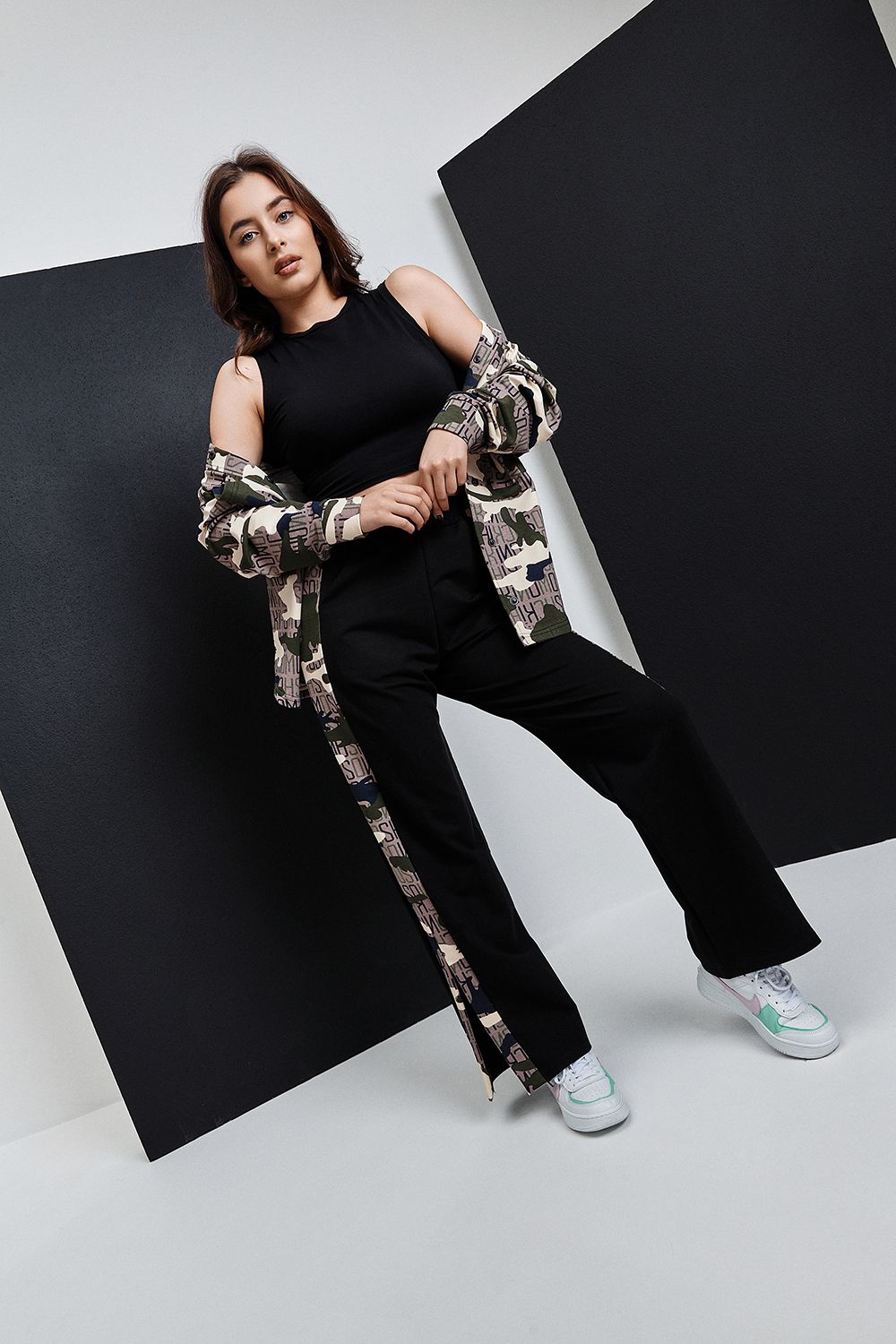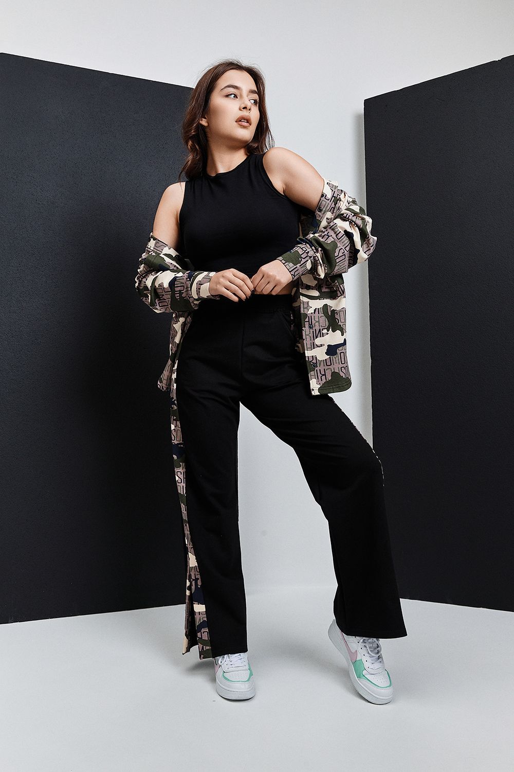 Костюм состоит из рубашки и брюк. Рубашка на кнопках, с отложным воротником, с накладными карманами, с фигурной линией низа. Рукав длинный, на манжете, с застежкой на кнопки. Спинка с кокеткой. Брюки прямые, на поясе, с боковыми карманами, с лампасами из отделочного полотна вдоль боковых швов. В нижней части лампасов обработаны разрезы.