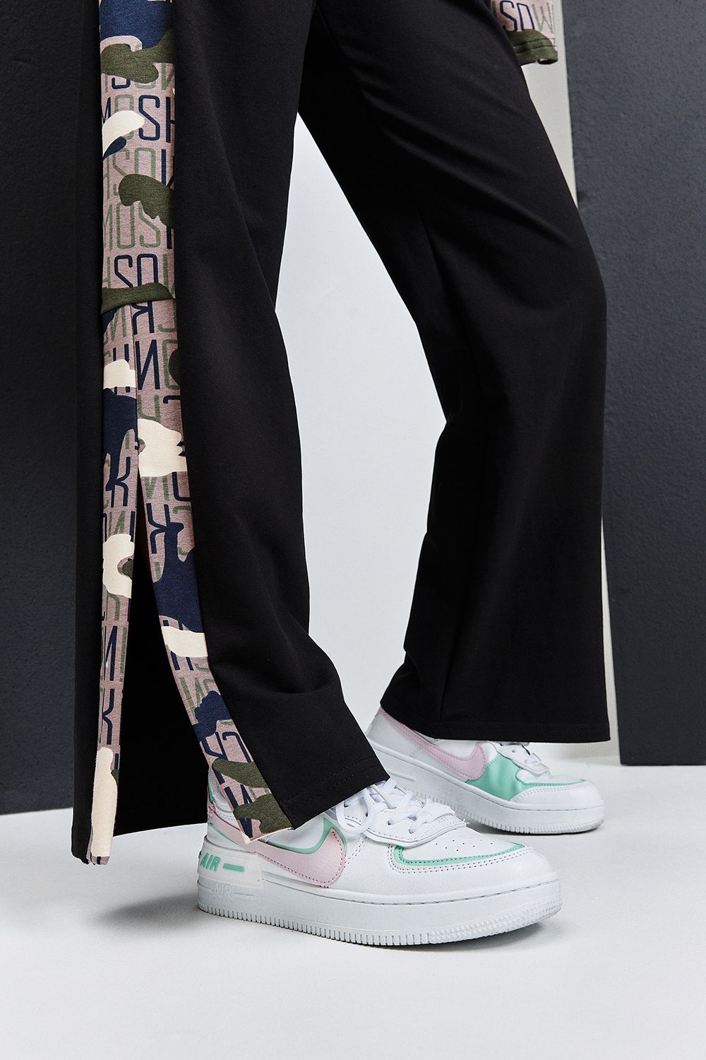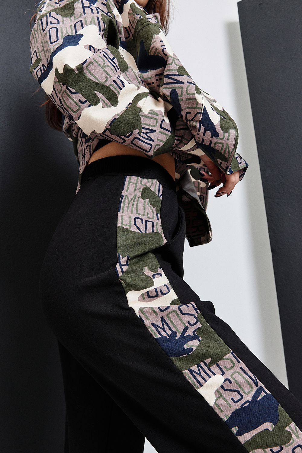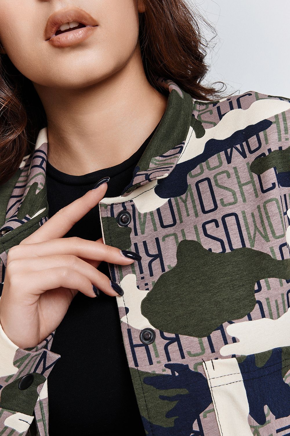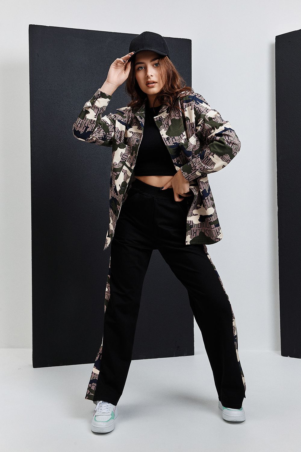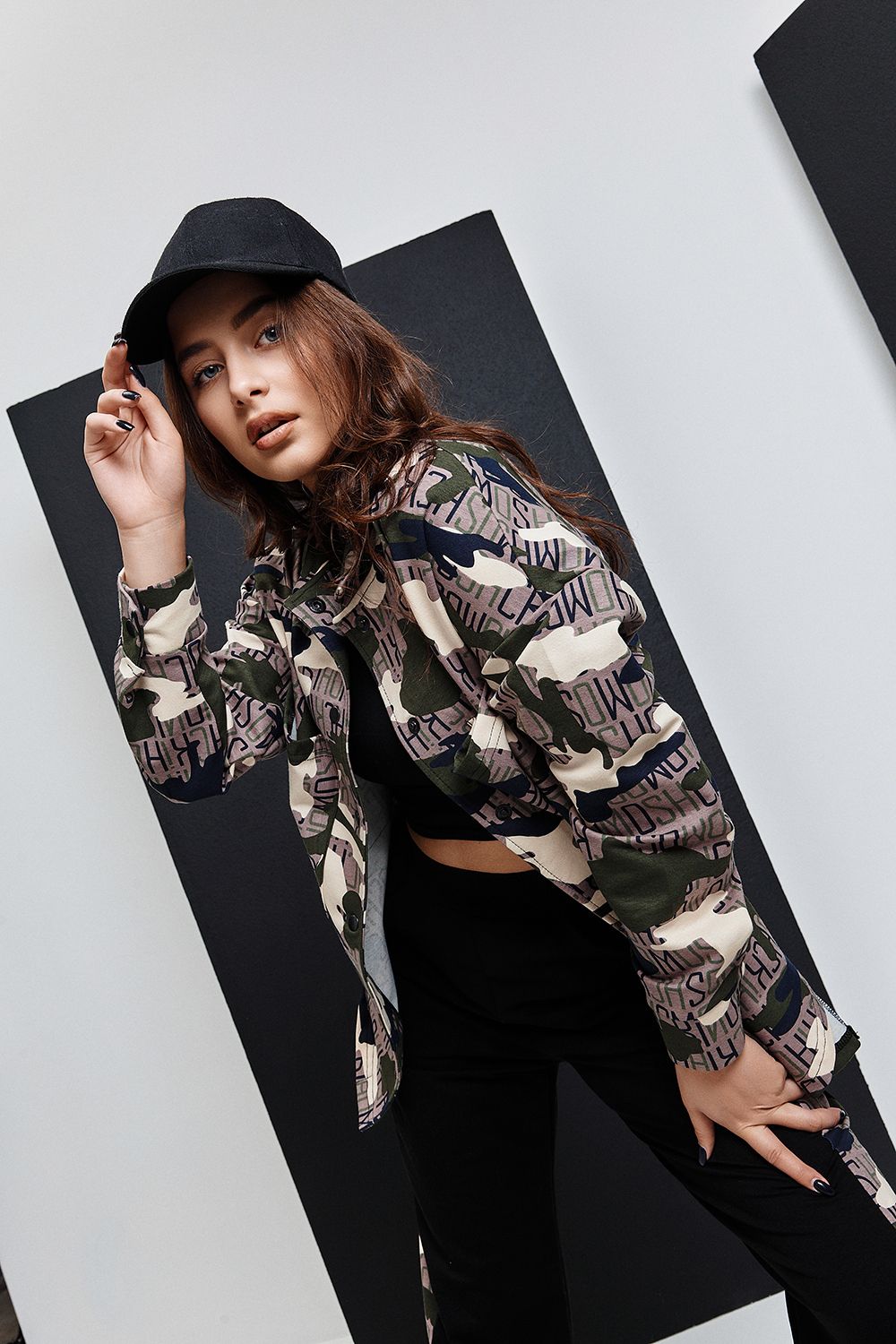 Костюм состоит из рубашки и брюк. Рубашка на кнопках, с отложным воротником, с накладными карманами, с фигурной линией низа. Рукав длинный, на манжете, с застежкой на кнопки. Спинка с кокеткой. Брюки прямые, на поясе, с боковыми карманами, с лампасами из отделочного полотна вдоль боковых швов. В нижней части лампасов обработаны разрезы.