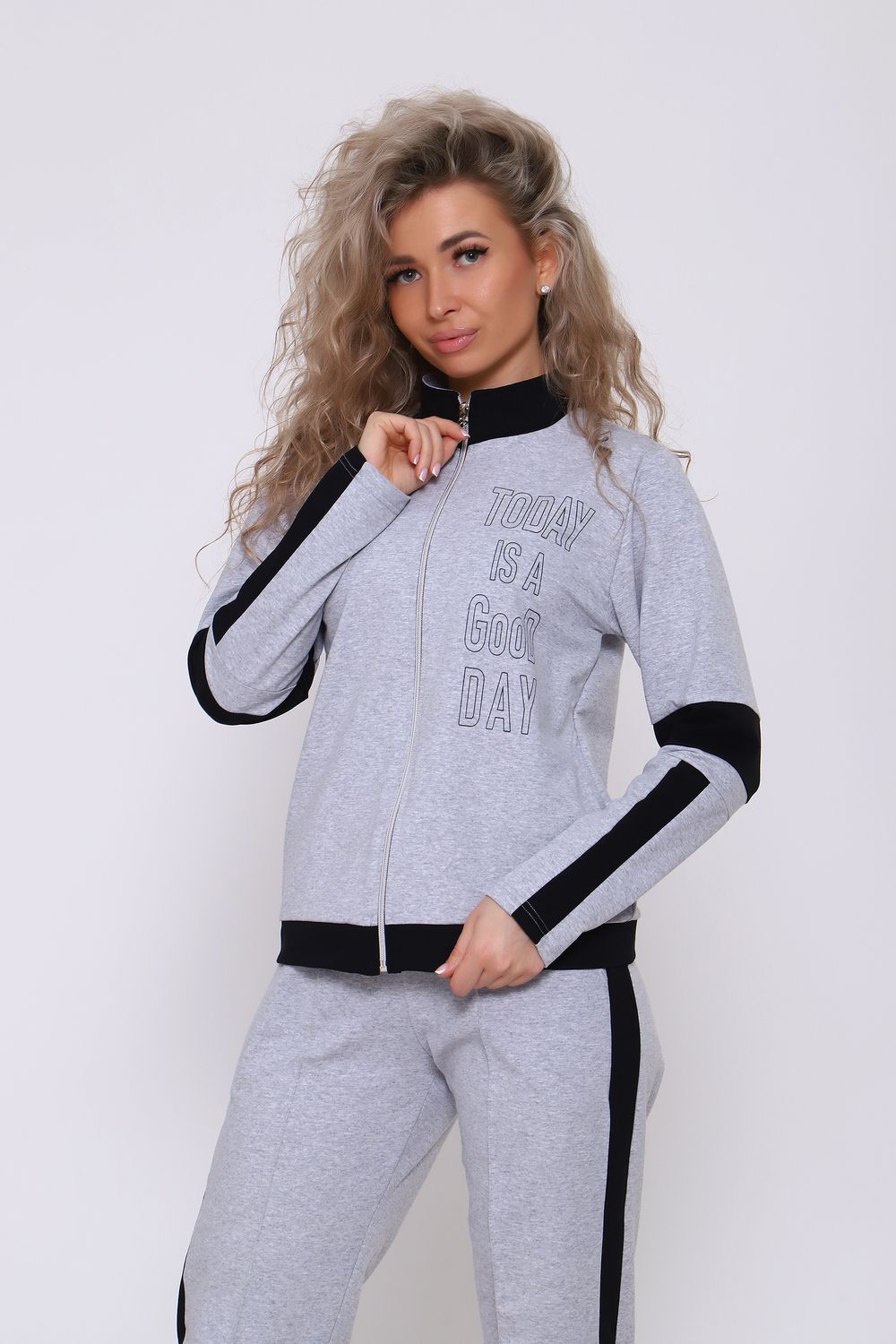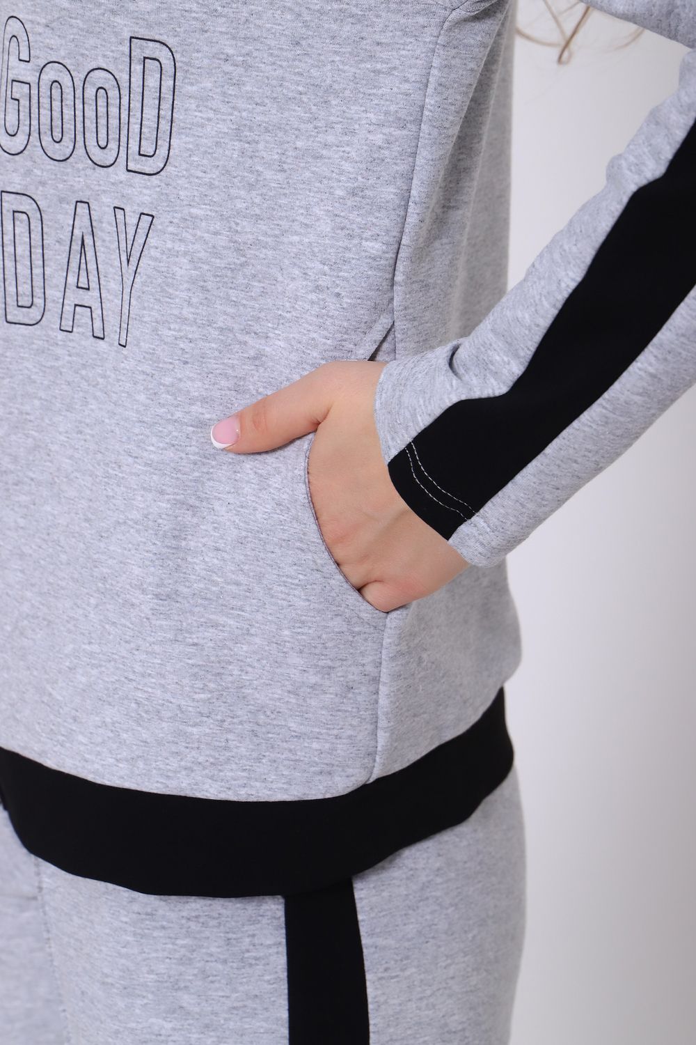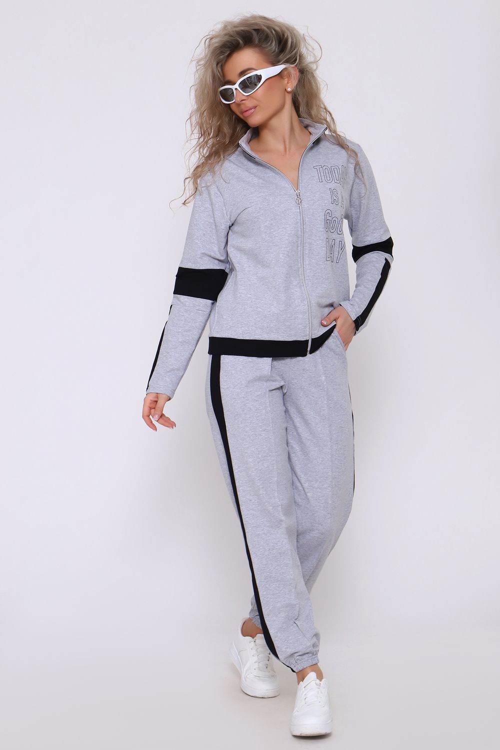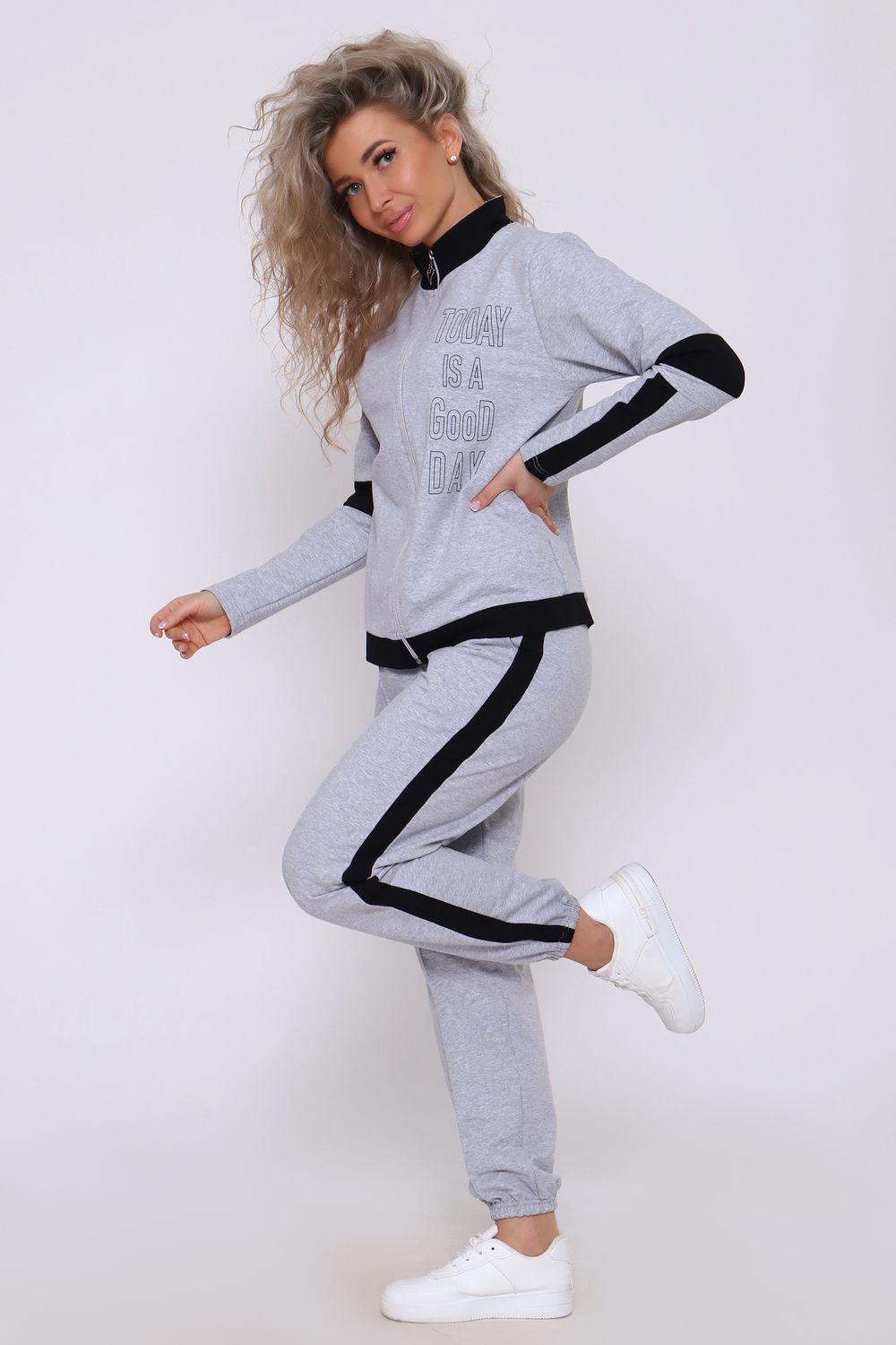 Молодежный костюм, который идеально подойдет на любой случай. Костюм состоит из кофты и брюк. Кофта на молнии, воротник стойка из отделочной ткани, пояс также из отделочной ткани. Рукав в данной модели особенно красив за счет вставок из отделочной ткани. На полочке неброская печать. Брюки с карманами и лампасами, низ на резинке, что очень удобно при носке. Пояс брюк обработан на поясной машине. Костюм отлично подойдет как для повседневной носки, так и для спорта и прогулки. В нашем модном костюме вы будете самой красивой!