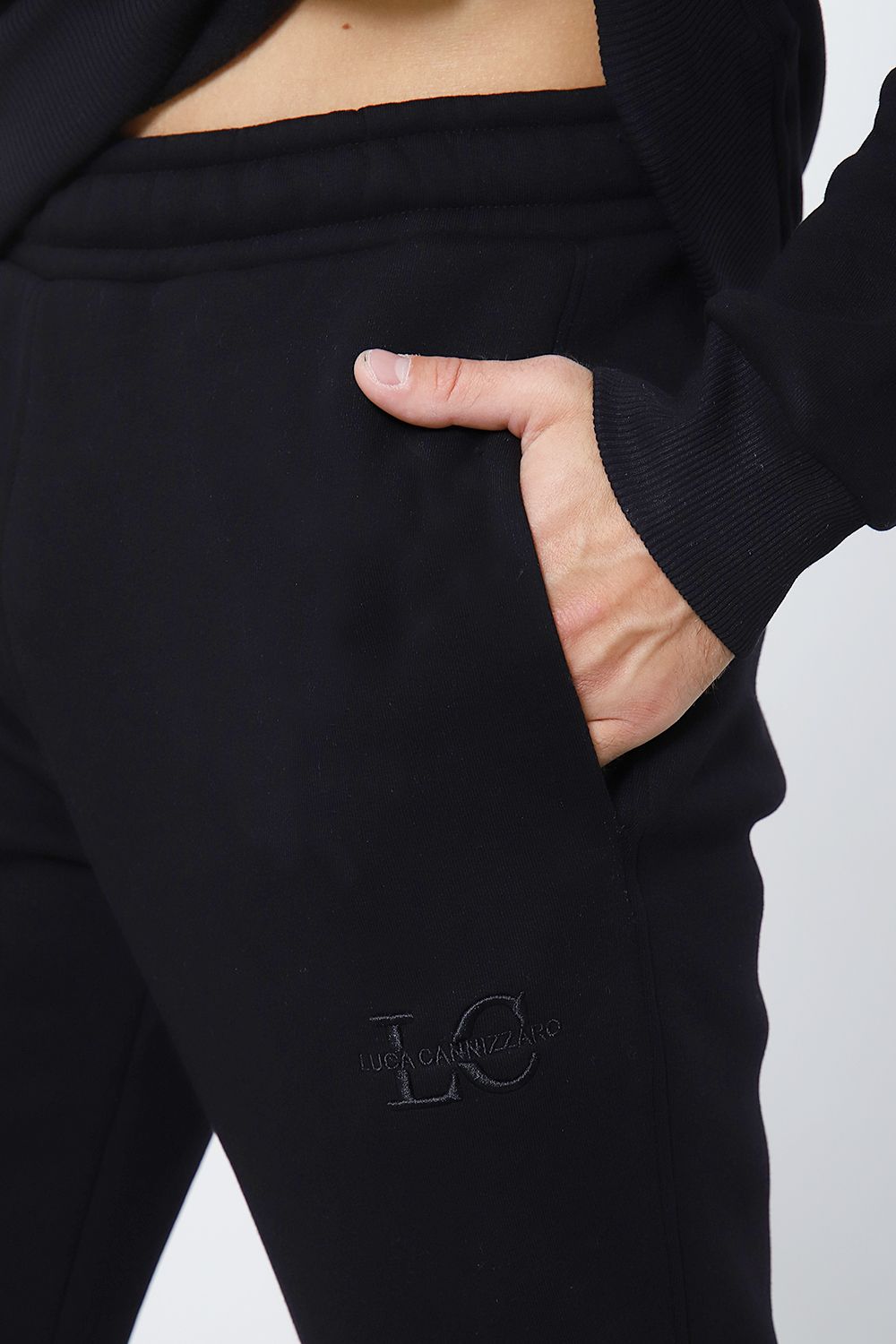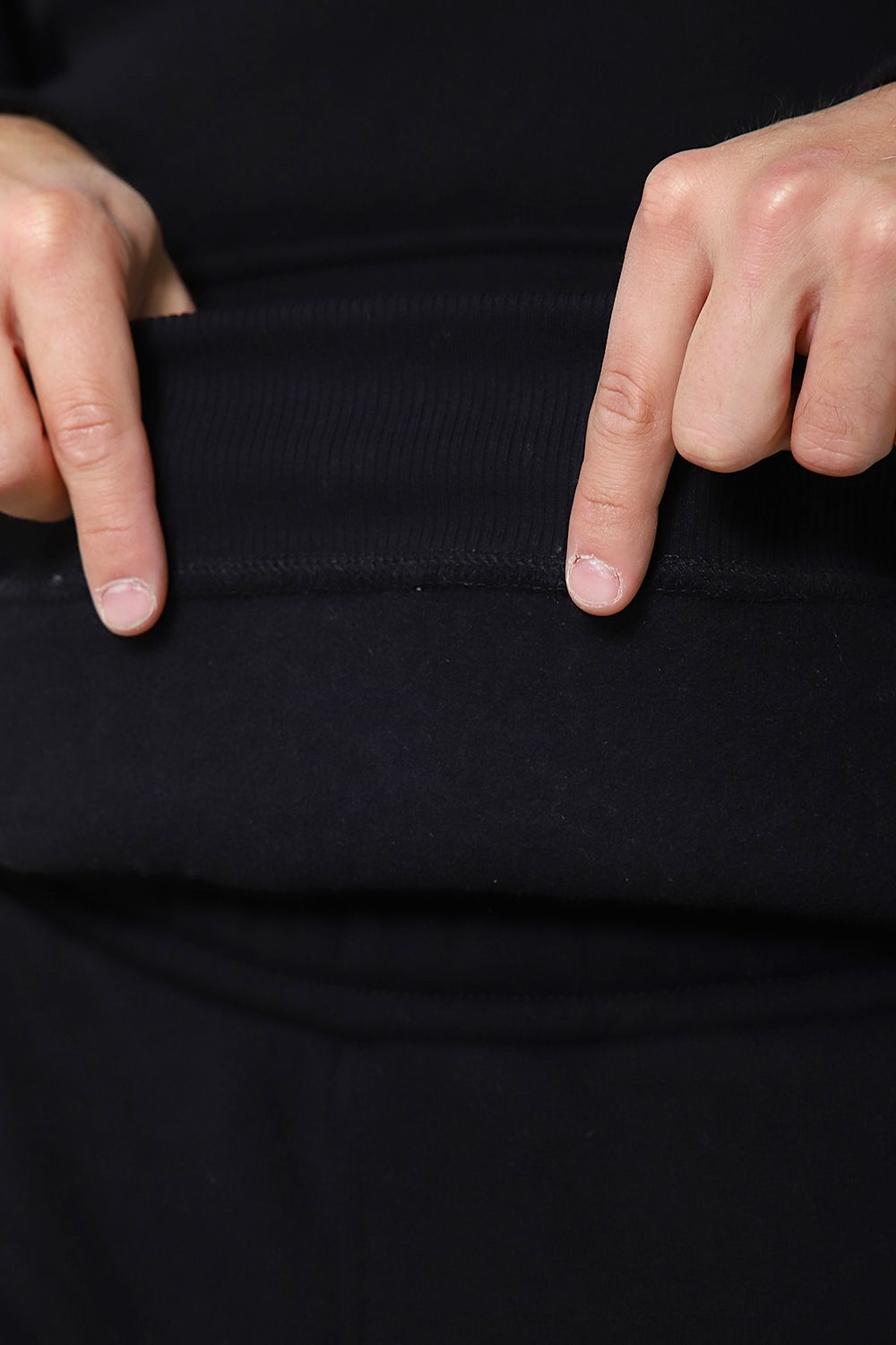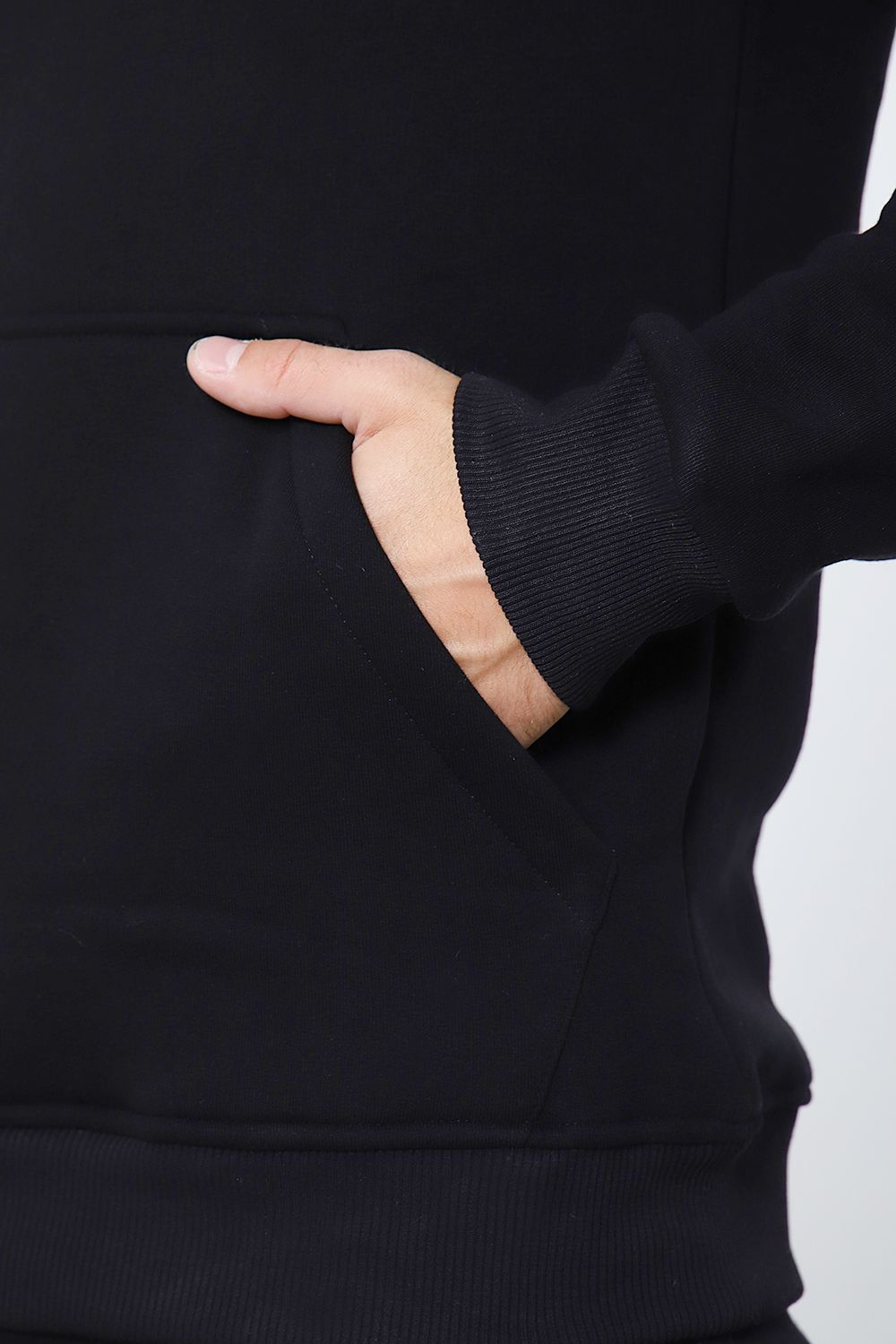 Костюм мужской изготовлен из качественного футера трехнитки с начесом, идеальный вариант для холодных зимних дней. Толстовка с капюшоном, дополненным шнуром и карманом-кенгуру. На груди изделия выполнена текстовая вышивка-логотип. Брюки на резинке, для дополнительного регулирования объема талии имеется шнурок. Два боковых кармана без молнии. Брюки так же украшены вышивкой.