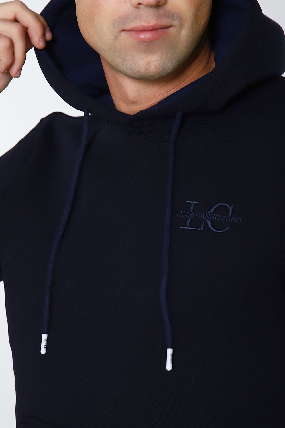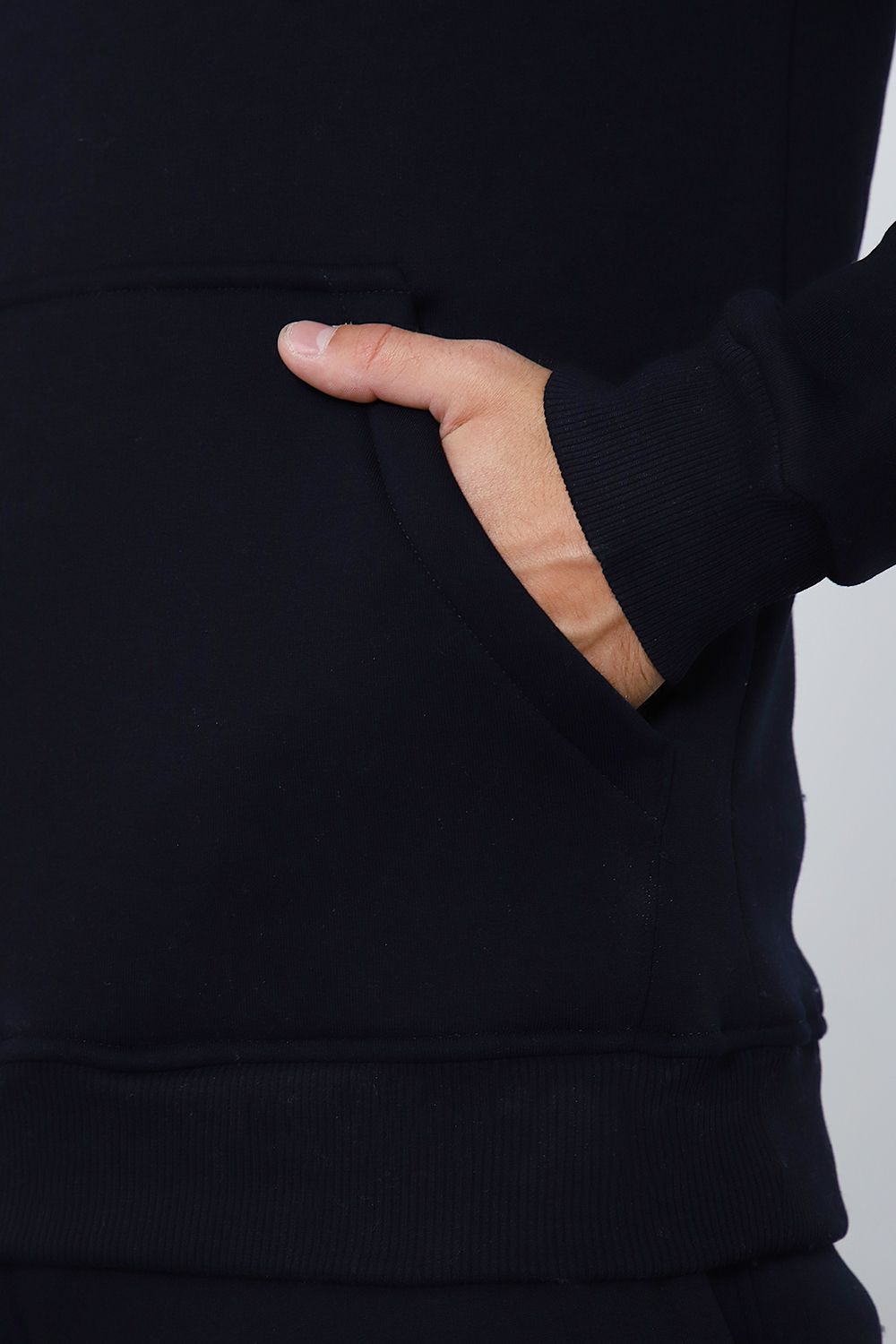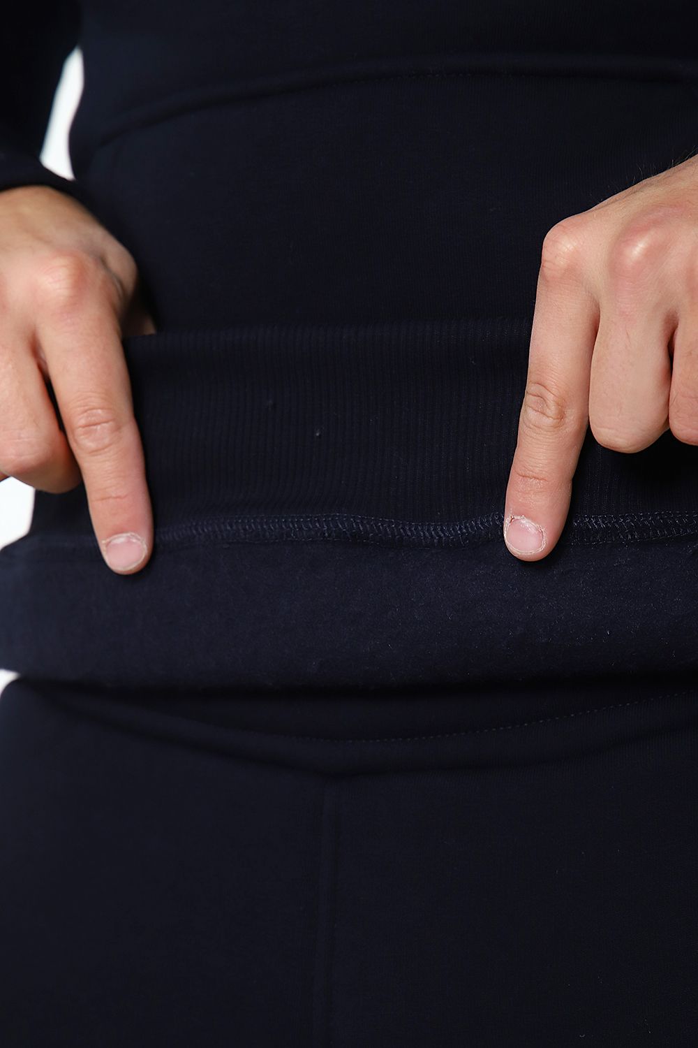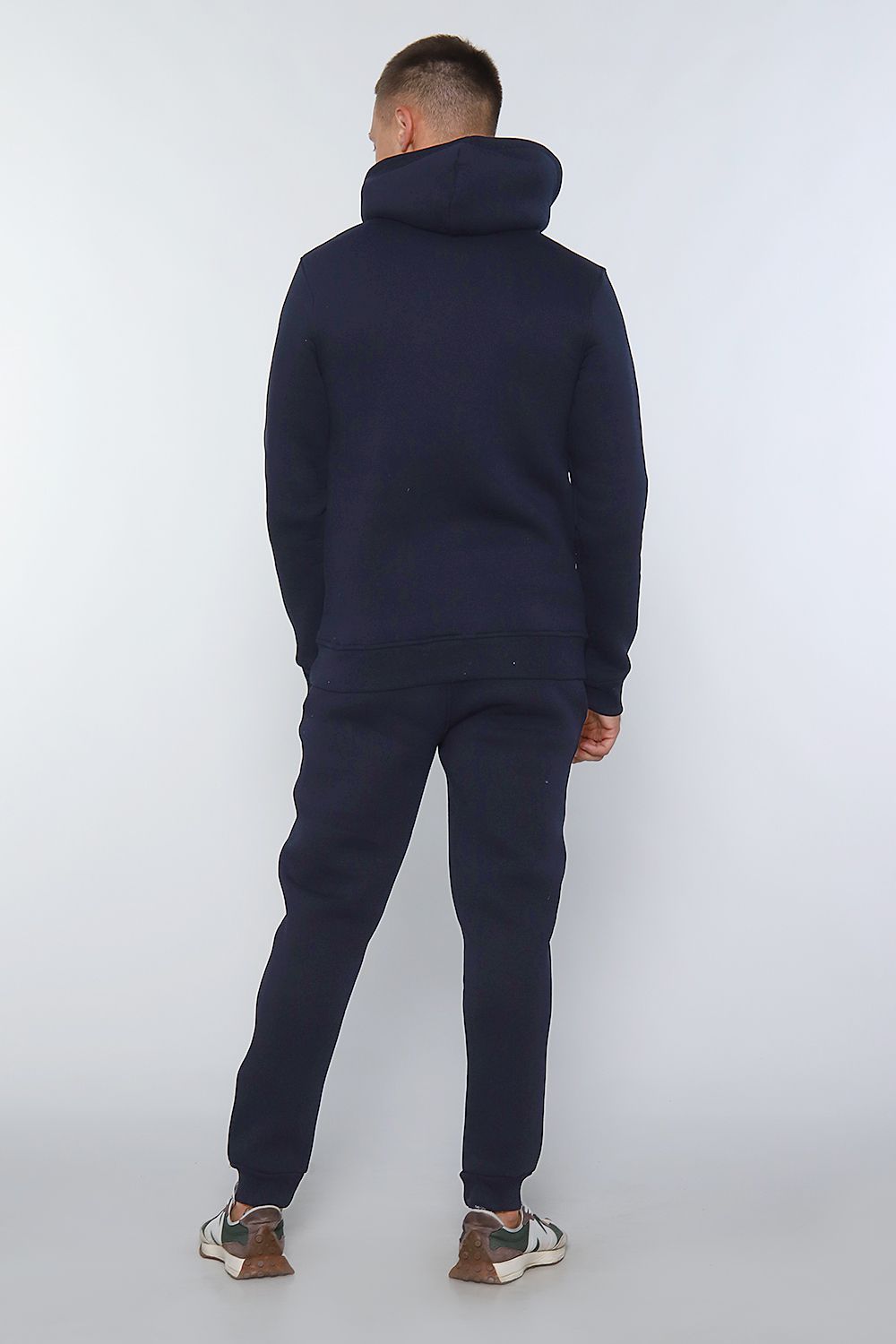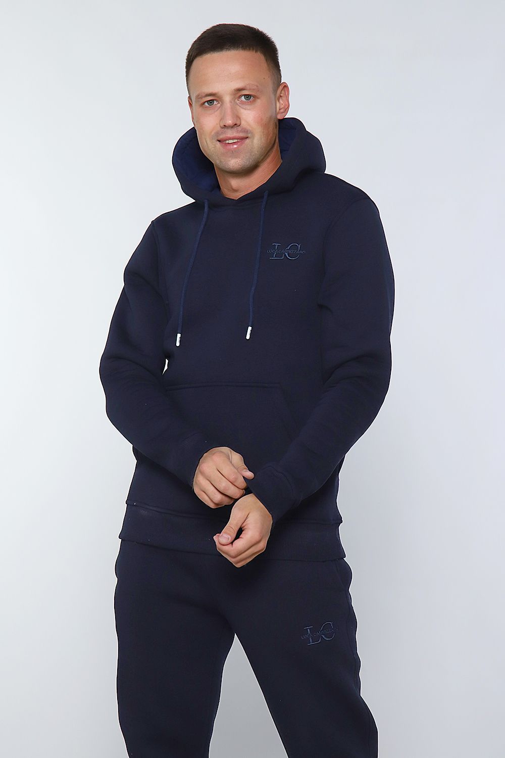 Костюм мужской изготовлен из качественного футера трехнитки с начесом, идеальный вариант для холодных зимних дней. Толстовка с капюшоном, дополненным шнуром и карманом-кенгуру. На груди изделия выполнена текстовая вышивка-логотип. Брюки на резинке, для дополнительного регулирования объема талии имеется шнурок. Два боковых кармана без молнии. Брюки так же украшены вышивкой.