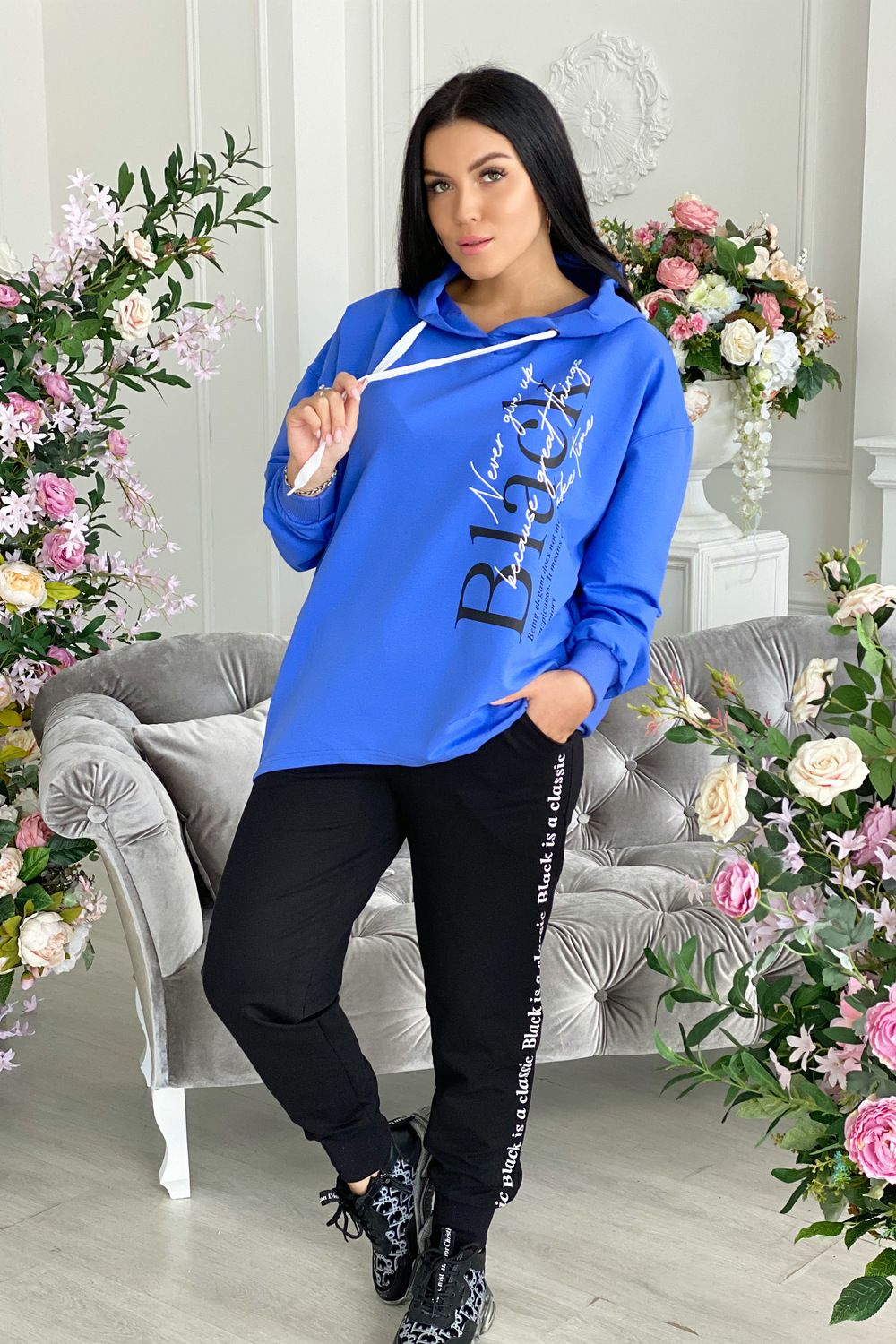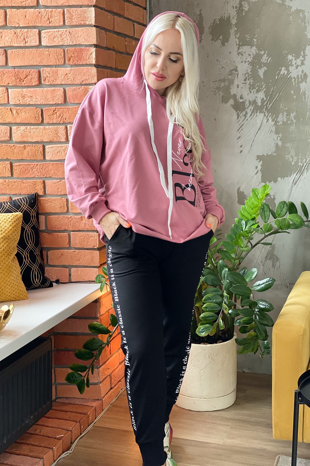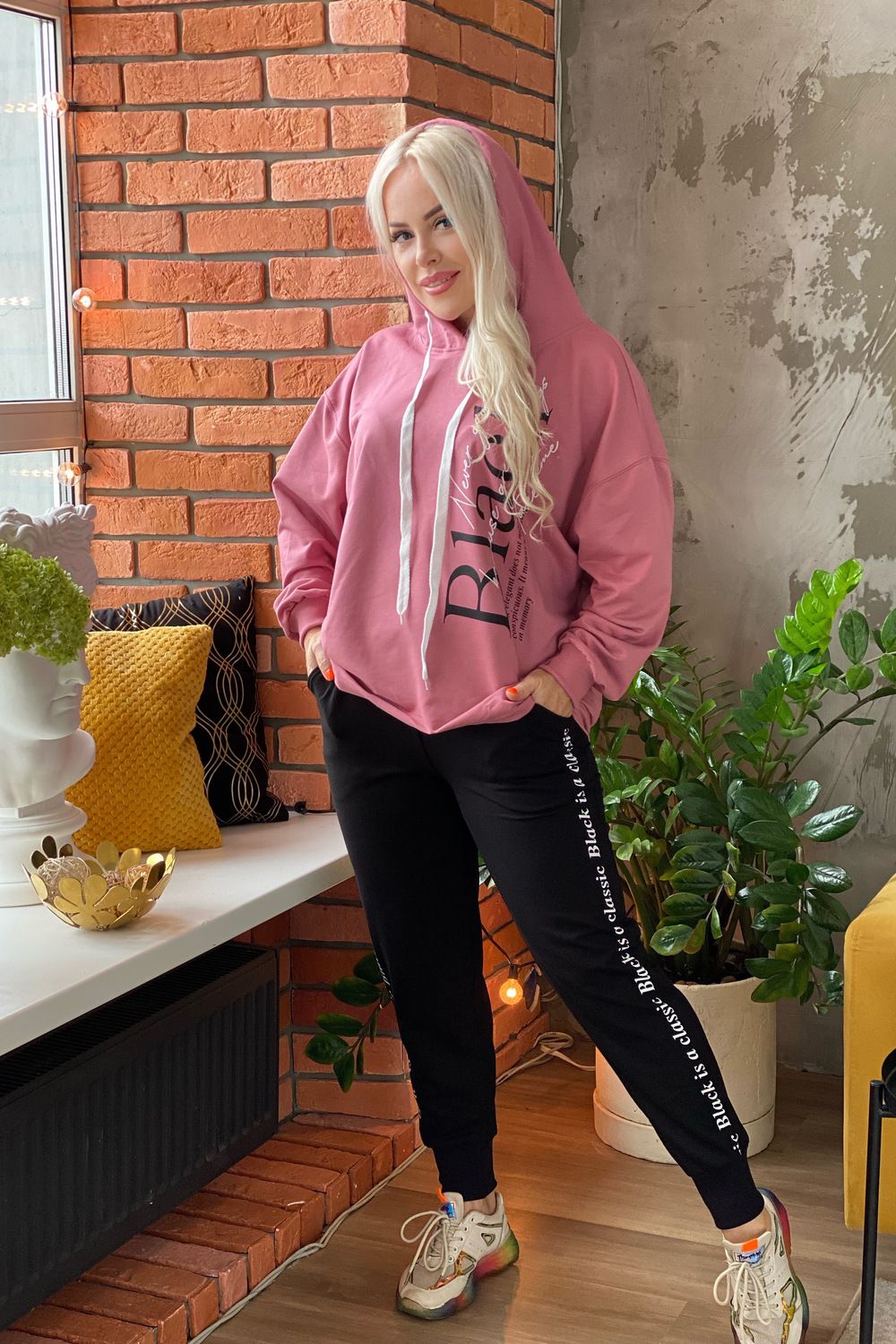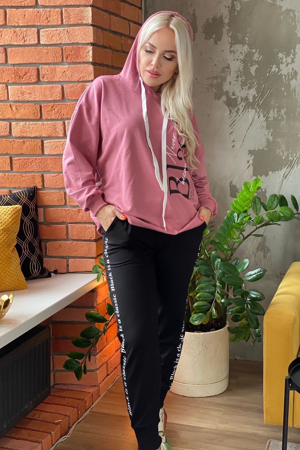 Костюм женский прямого силуэта, оверсайз. Толстовка и брюки. Толстовка с капюшоном, линия низа на полочке выше, чем на спинке. Брюки свободные, с внутренними карманами на передней части брюк и один накладной карман на задней половинке, низ брюк на манжете. На полочке и брюках модный принт.