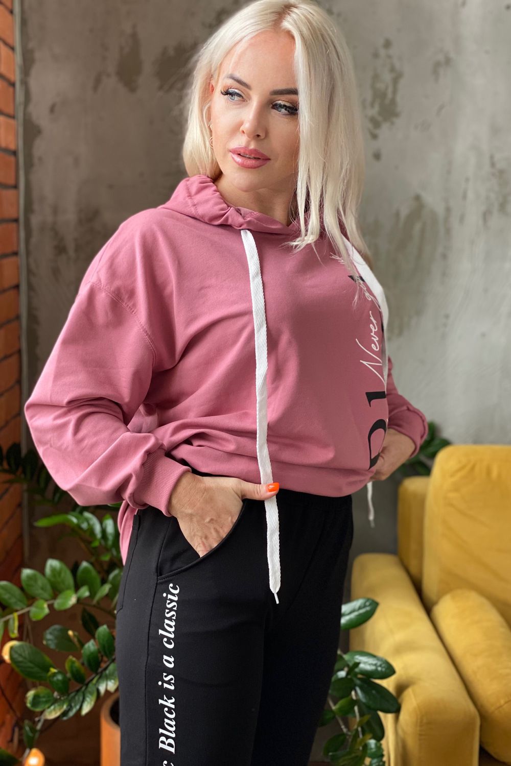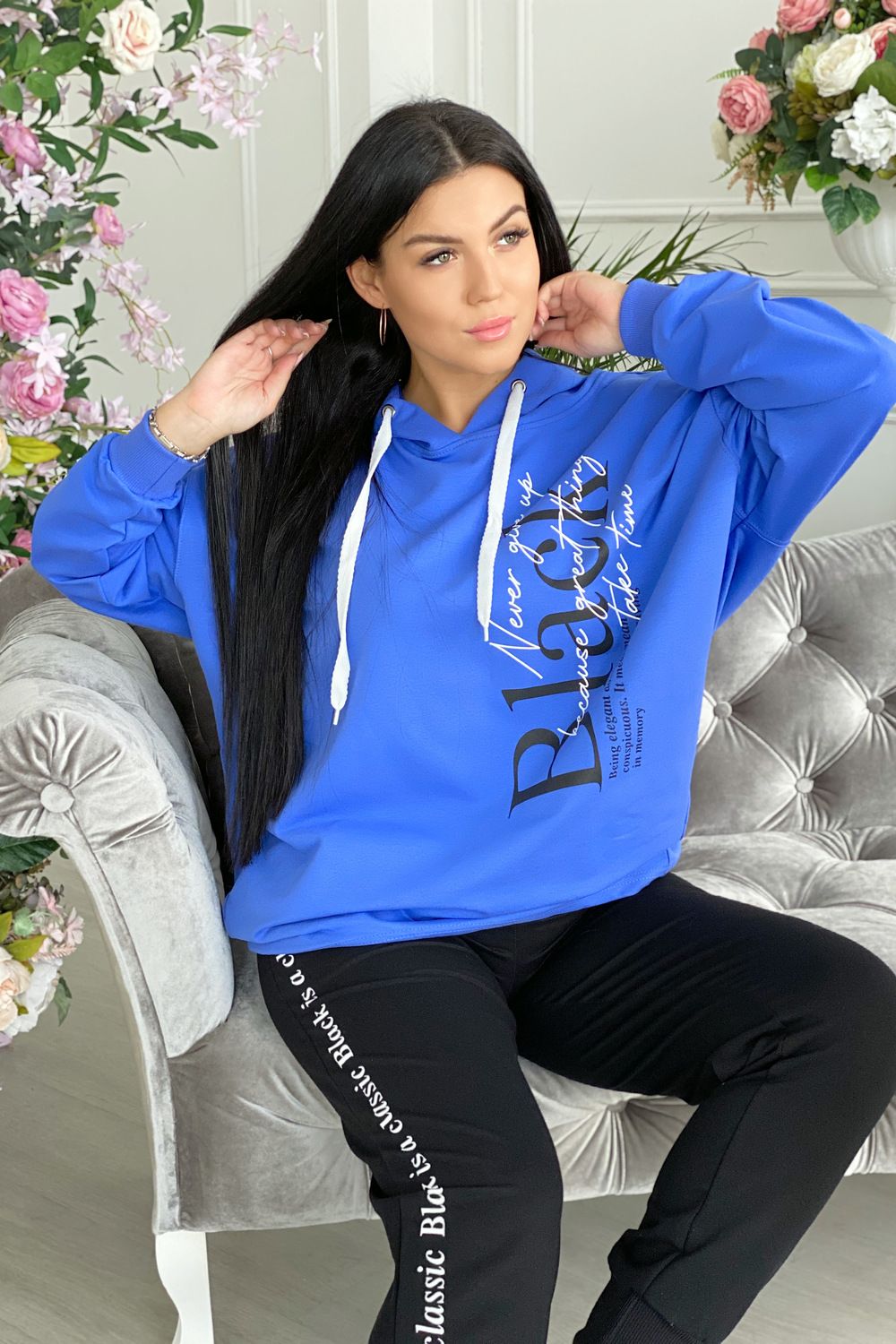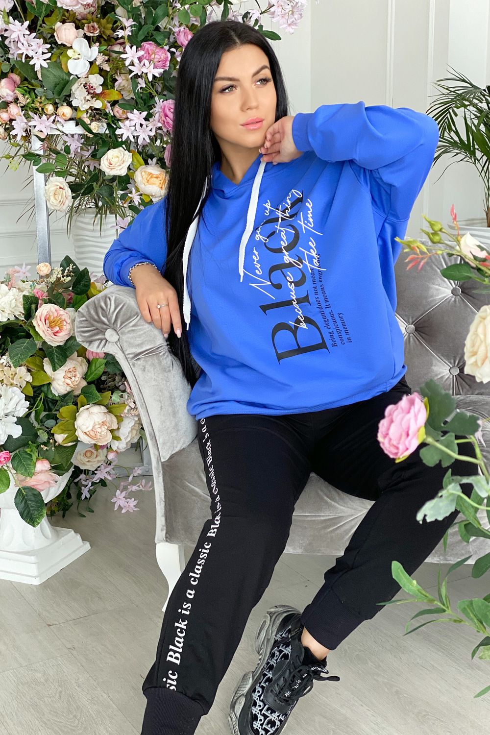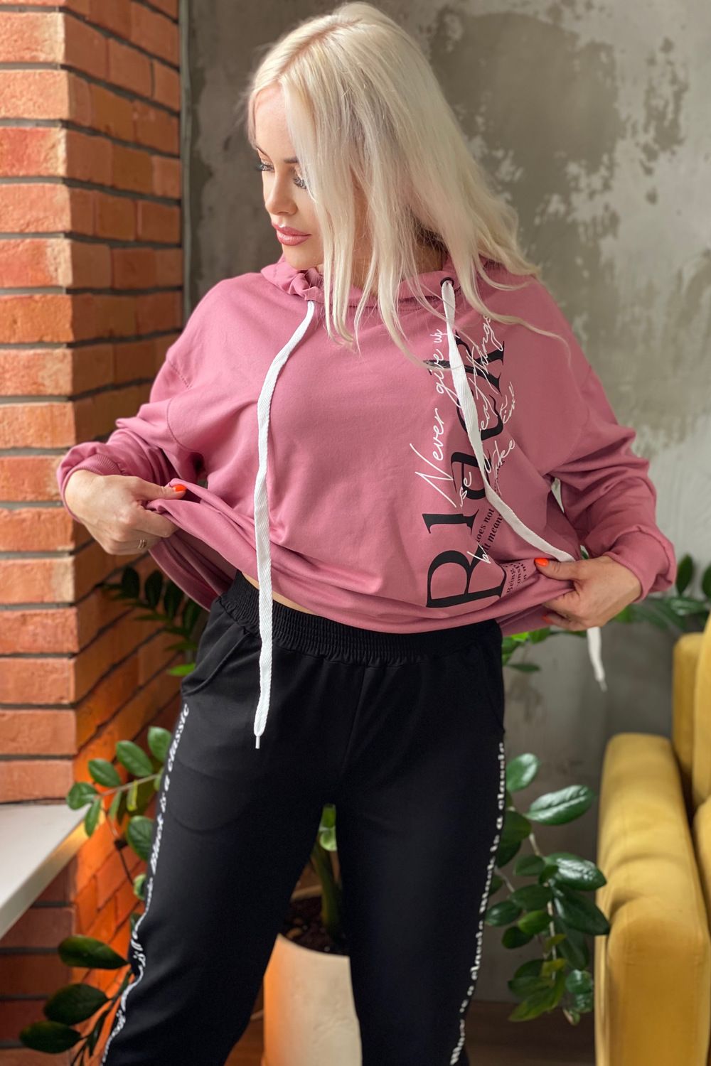 Костюм женский прямого силуэта, оверсайз. Толстовка и брюки. Толстовка с капюшоном, линия низа на полочке выше, чем на спинке. Брюки свободные, с внутренними карманами на передней части брюк и один накладной карман на задней половинке, низ брюк на манжете. На полочке и брюках модный принт.