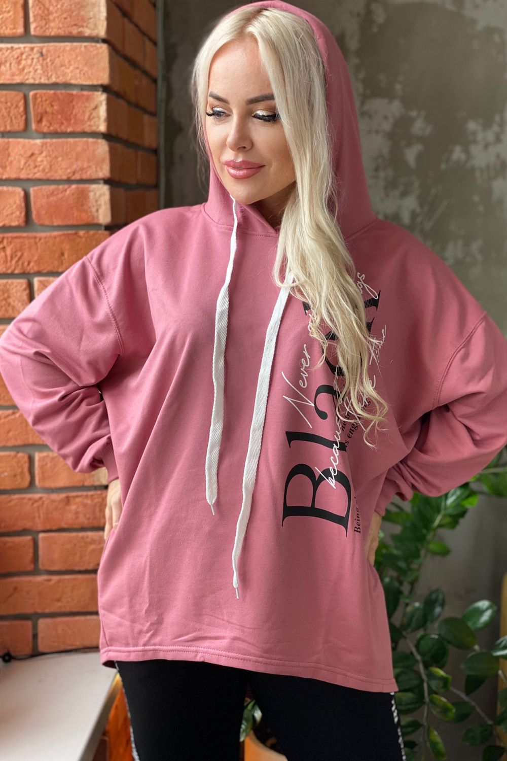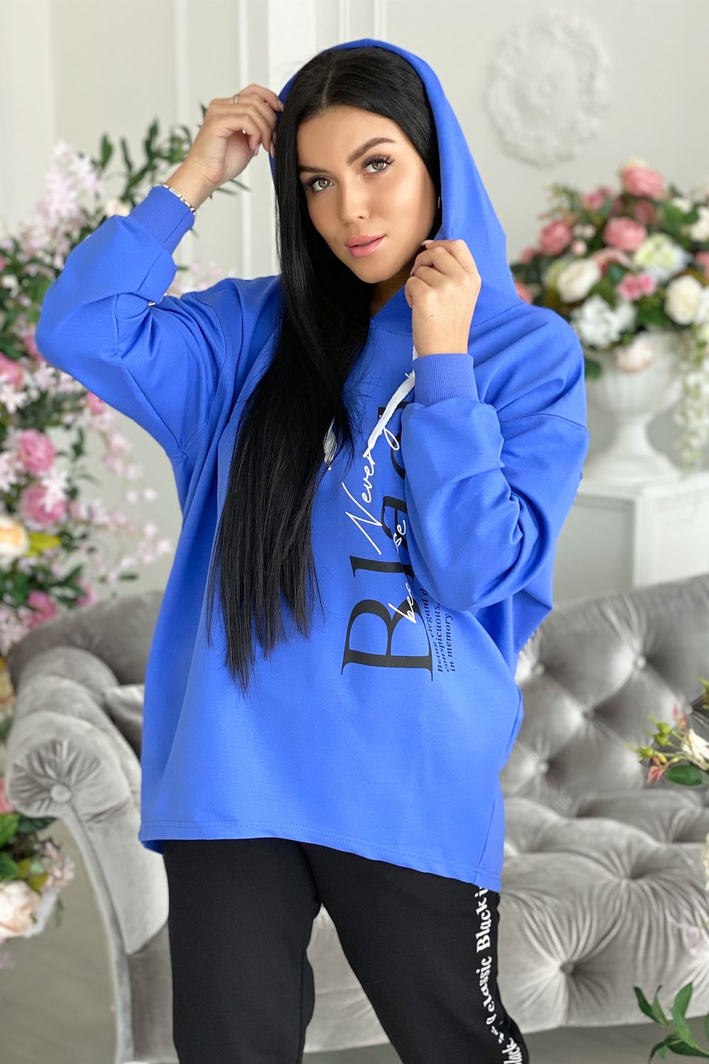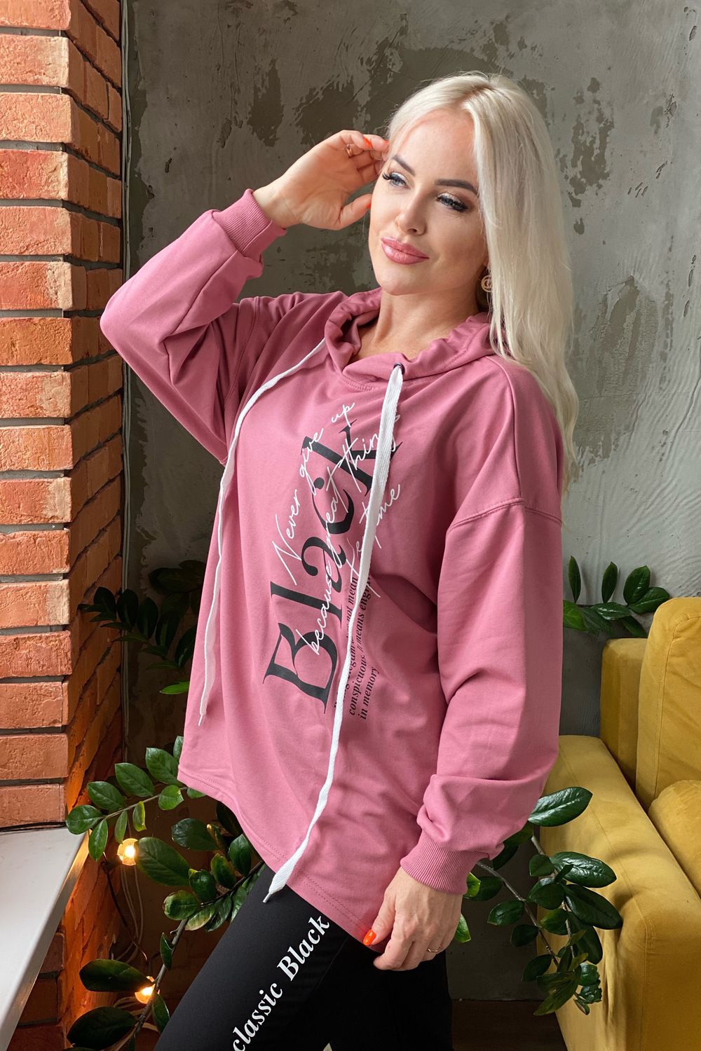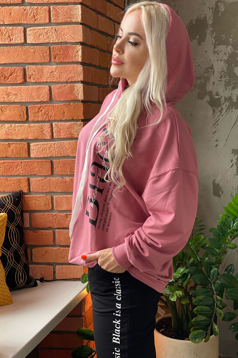 Костюм женский прямого силуэта, оверсайз. Толстовка и брюки. Толстовка с капюшоном, линия низа на полочке выше, чем на спинке. Брюки свободные, с внутренними карманами на передней части брюк и один накладной карман на задней половинке, низ брюк на манжете. На полочке и брюках модный принт.
