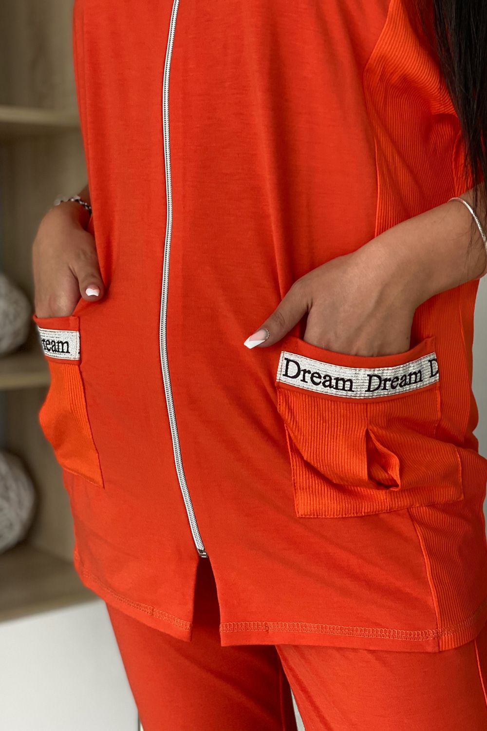 Костюм женский полуприлегающего силуэта - жакет и брюки. Застежка жакета на тесьму-молнию. Капюшон, накладные карманы, боковые части полочки, спинки, лампасы брюк из кашкорсе. Низ брюк с притачными манжетами.