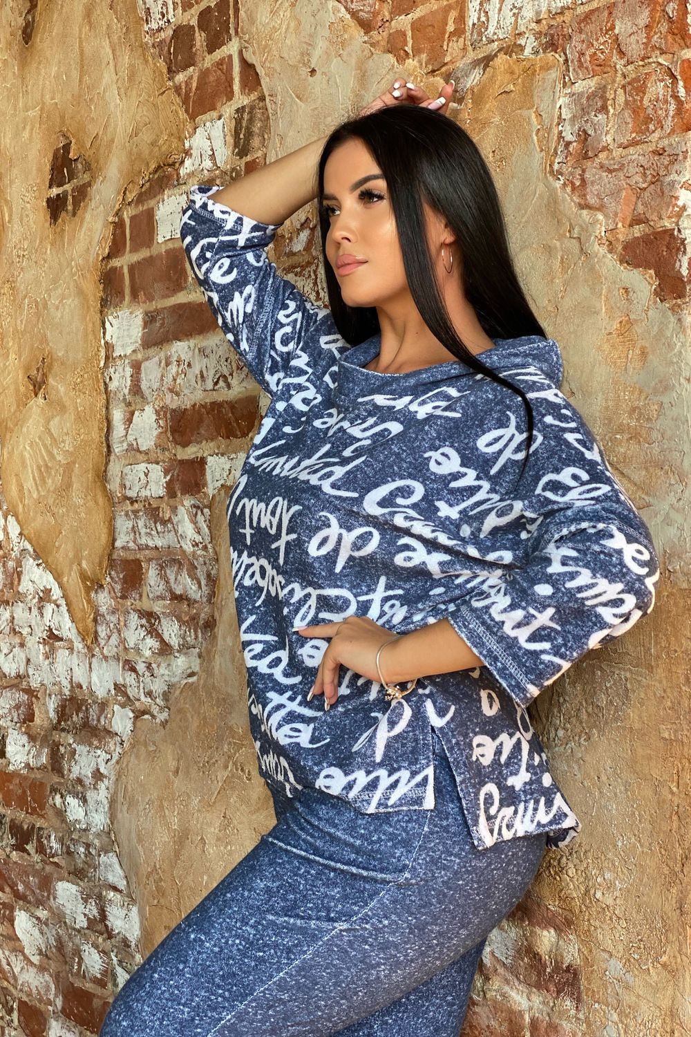 Костюм женский: туника и брюки. Туника прямого силуэта с цельнокроенным рукавом 3/4, со швом. Воротник отложной, спереди переходит в стойку. Полочка короче спинки, по боковым швам разрезы. Брюки полуприлегающие, с манжетами. На передней половинке внутренние карманы.