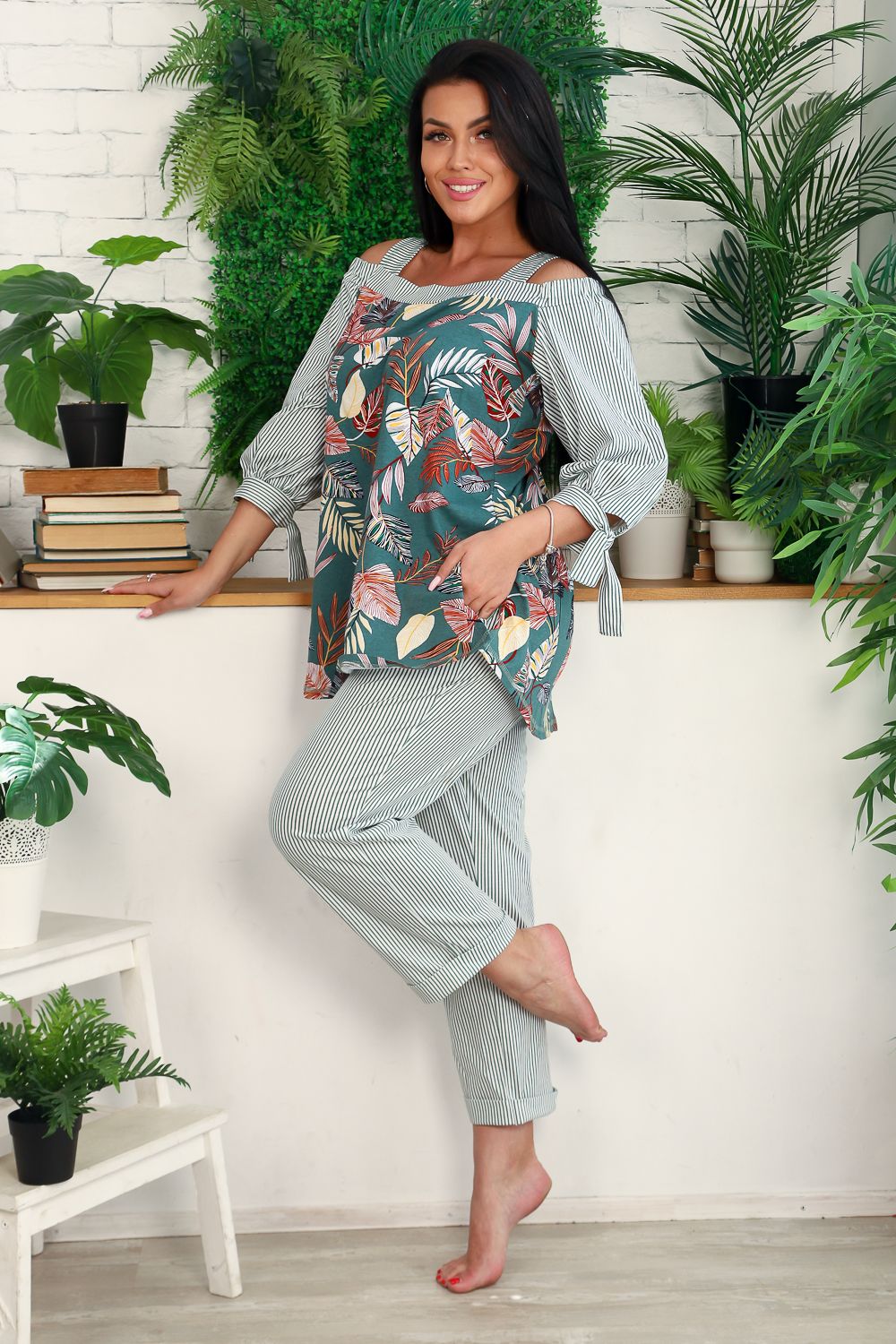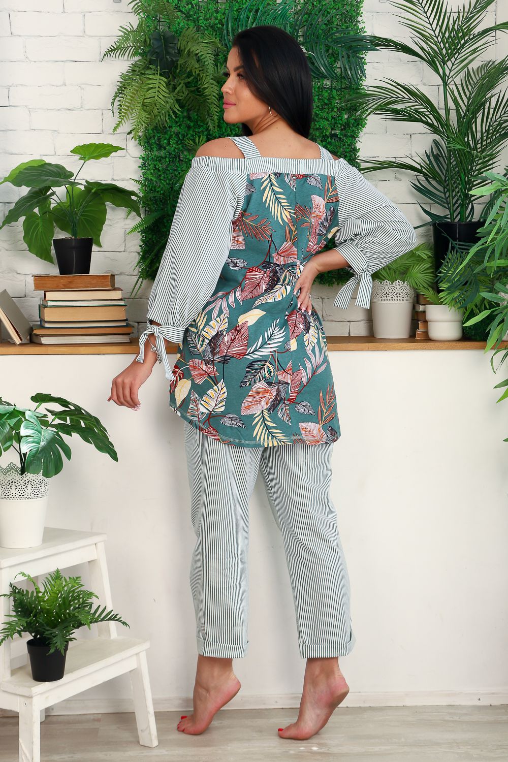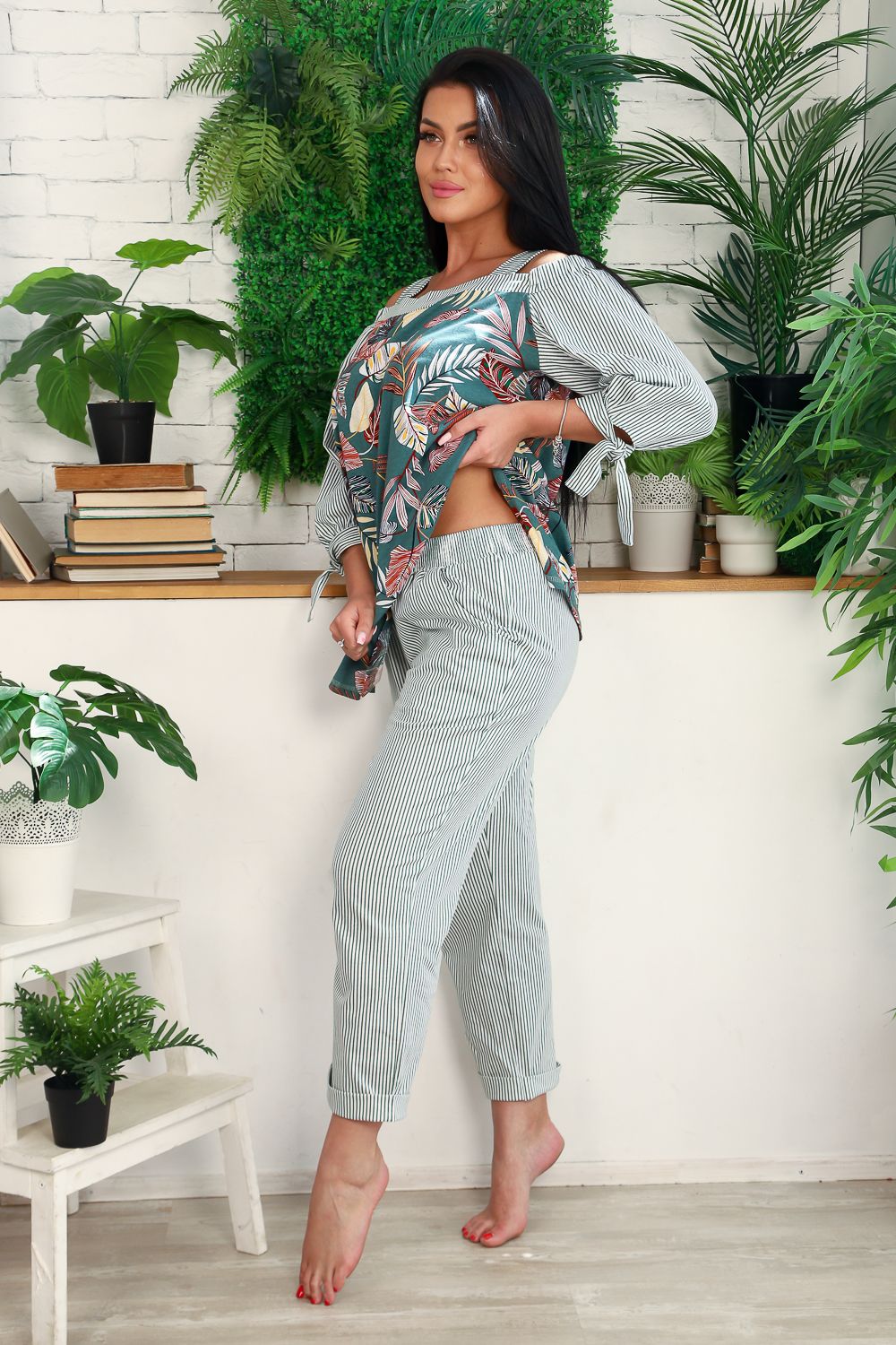 Костюм женский - туника и брюки. Брюки полуприлегающие, длина 7/8, с цельнокроеной манжетой. Пояс прострочен на многоигольной машине, на передней части брюк два внутренних кармана. Туника с открытыми плечами на широких бретелях, расширенная к низу, в боковых швах разрезы, рукав ниже локтя, по низу рукава сборка, манжета с завязками. На модели 48 размер