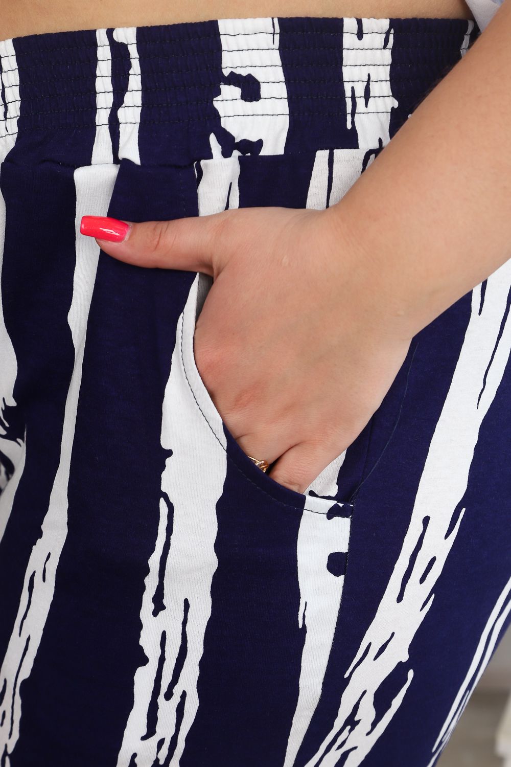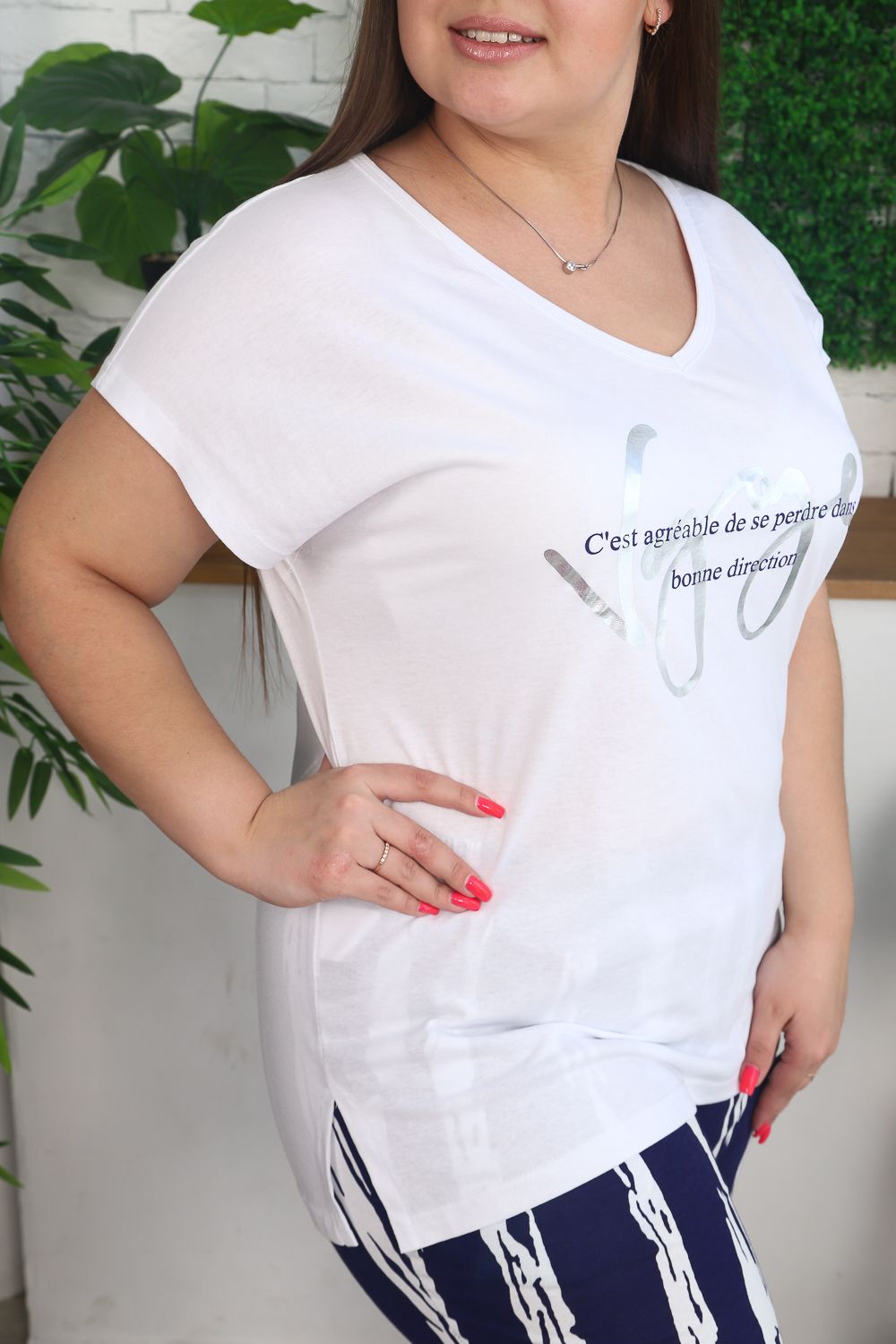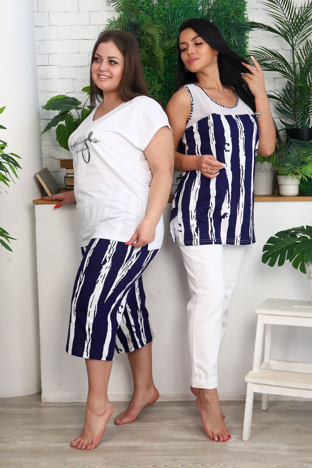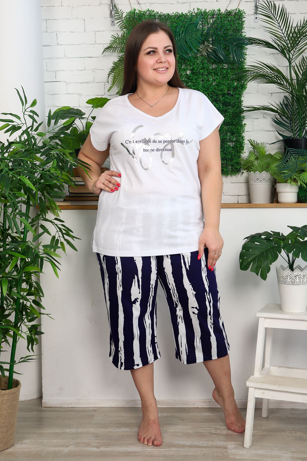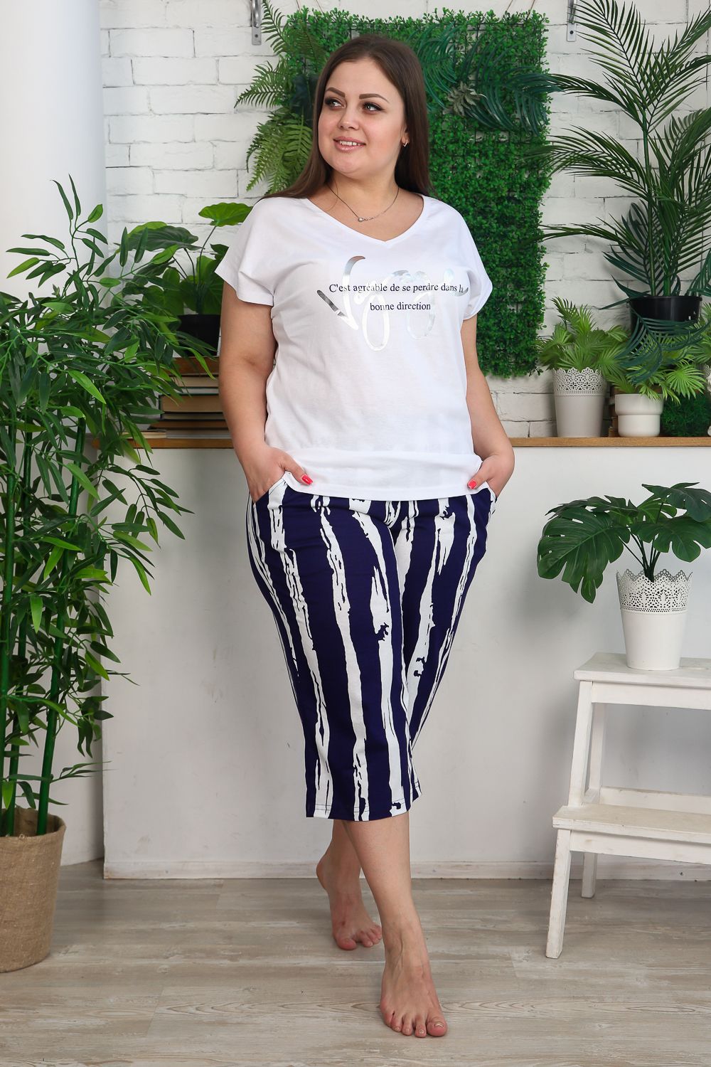 Костюм женский: футболка и бриджи. Футболка прямого силуэта, рукав цельнокроенный короткий, вырез V-образный, в боковом шве разрезы. На полочке модный принт. Бриджи полуприлегающие, длина ниже колена, с хорошей прибавкой на свободу движений. На передней части брюк внутренние карманы. На модели 52 размер. На фото майка из той же коллекции 9126