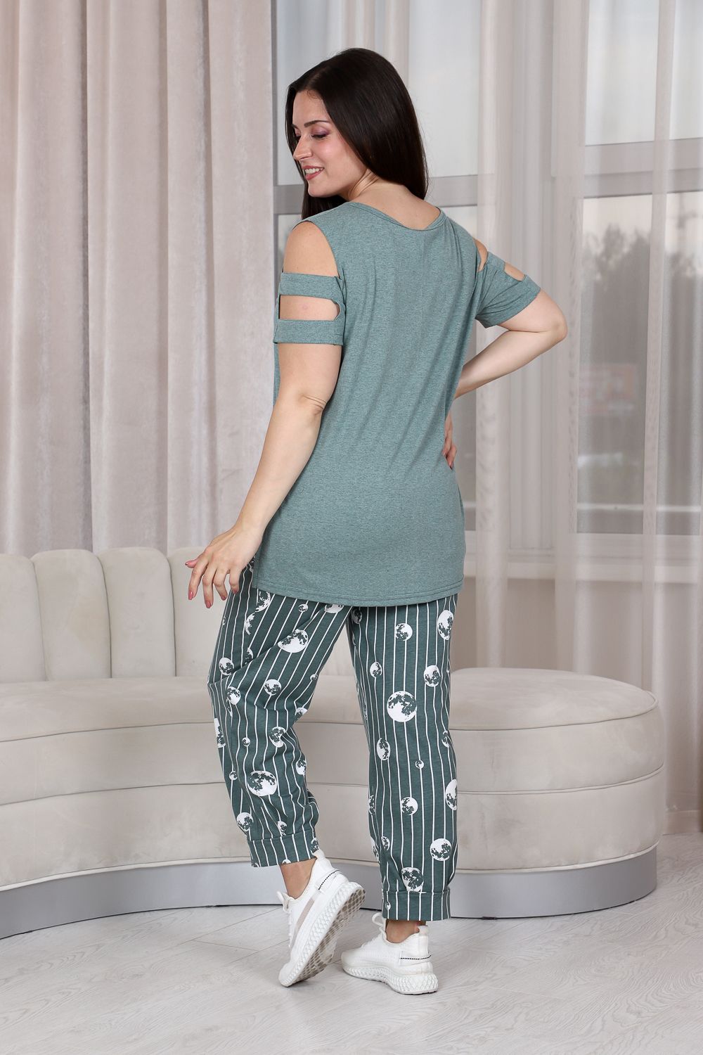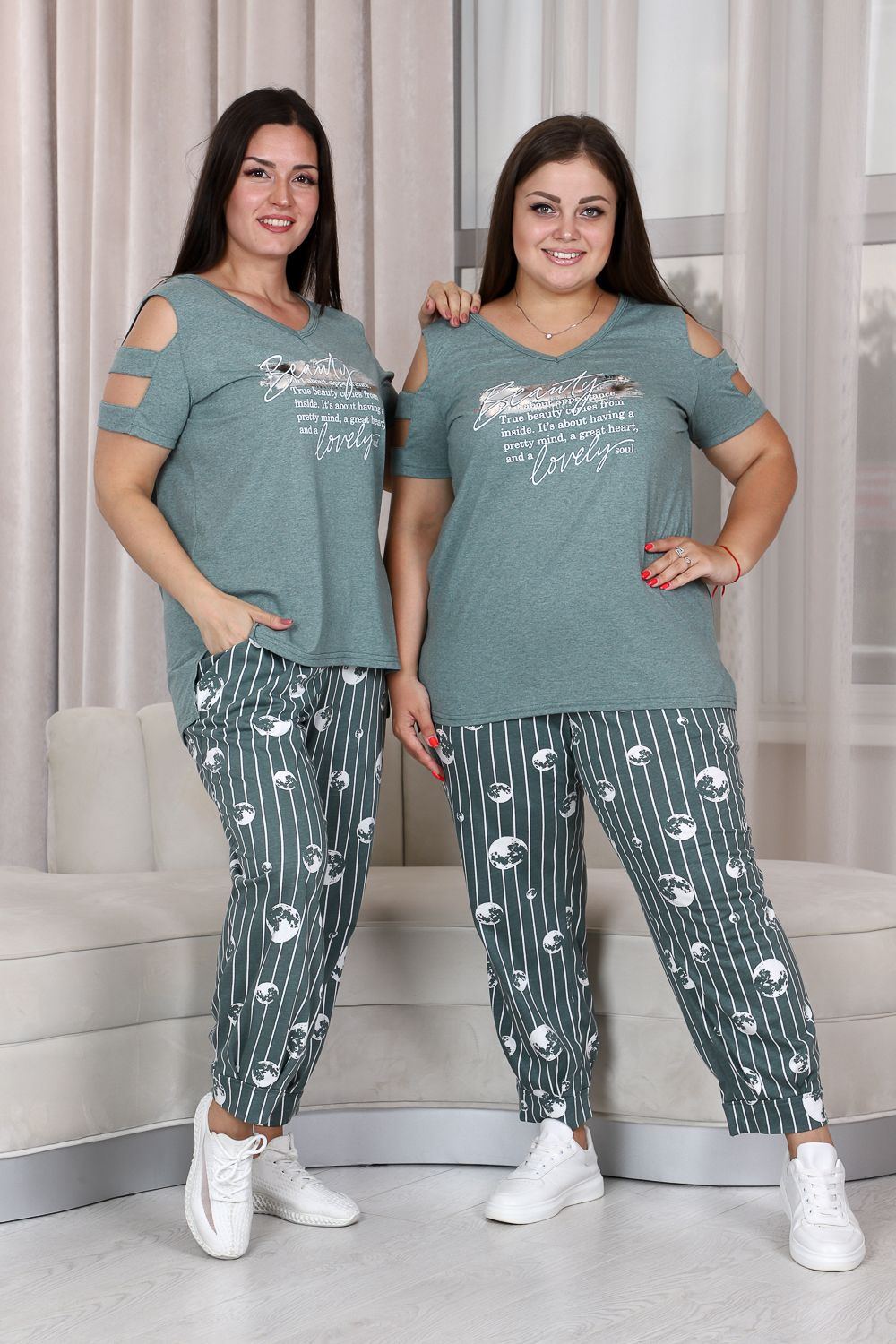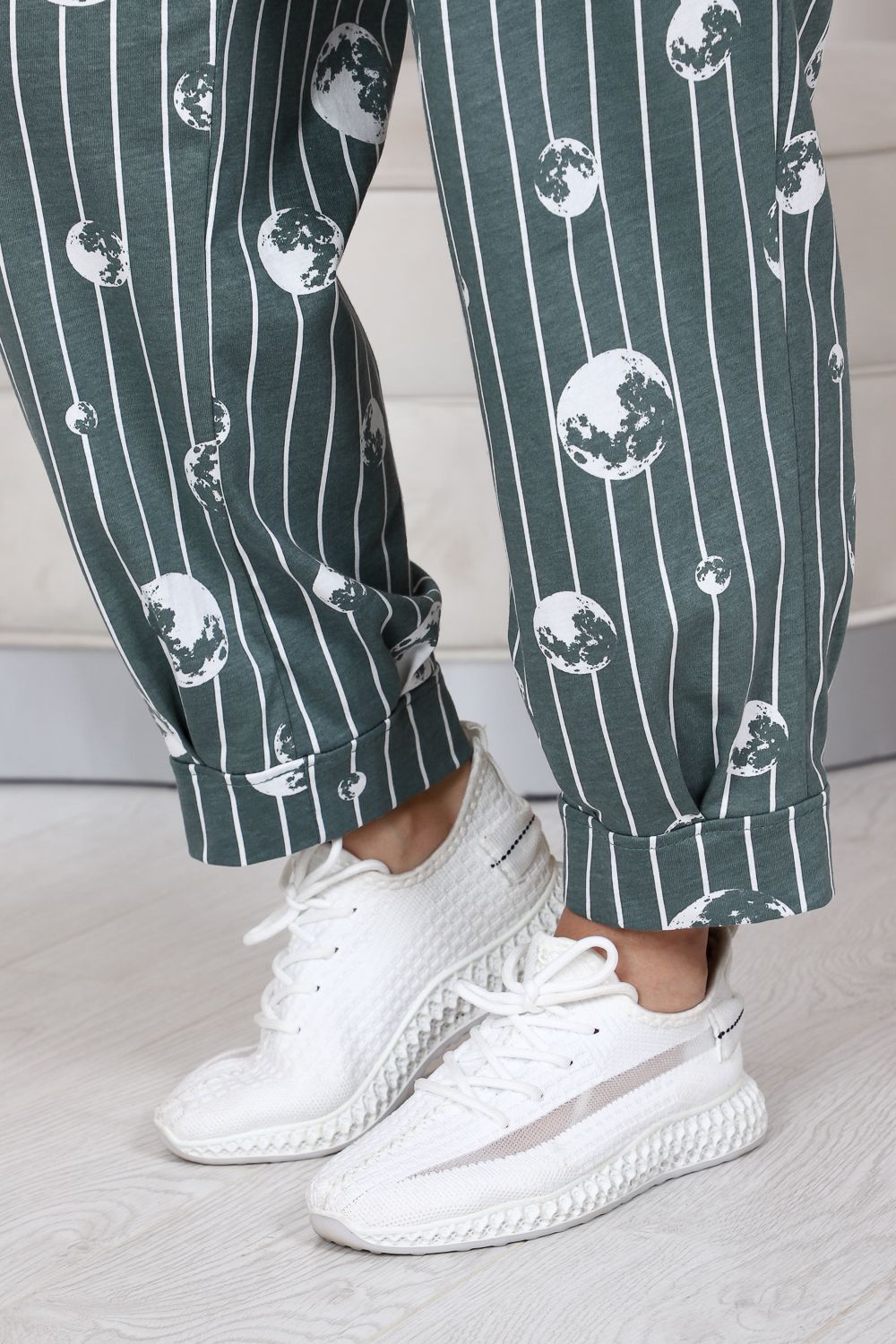 Костюм женский: туника и брюки. Туника прямого силуэта, вырез Y-образный. Полочка несколько короче спинки, сбоку разрезы. На полочке принт. Рукав не цельный, два хляста, расположенные через расстояние друг от друга, втачаны в боковые части рукава. Брюки свободные, "бананы", внизу передней и задней части по две встречные складки, манжеты. В брюках удобные внутренние карманы, пояс выполнен на многоигольной машине.