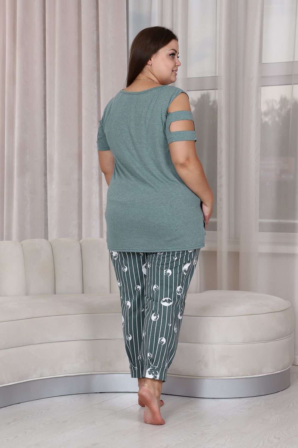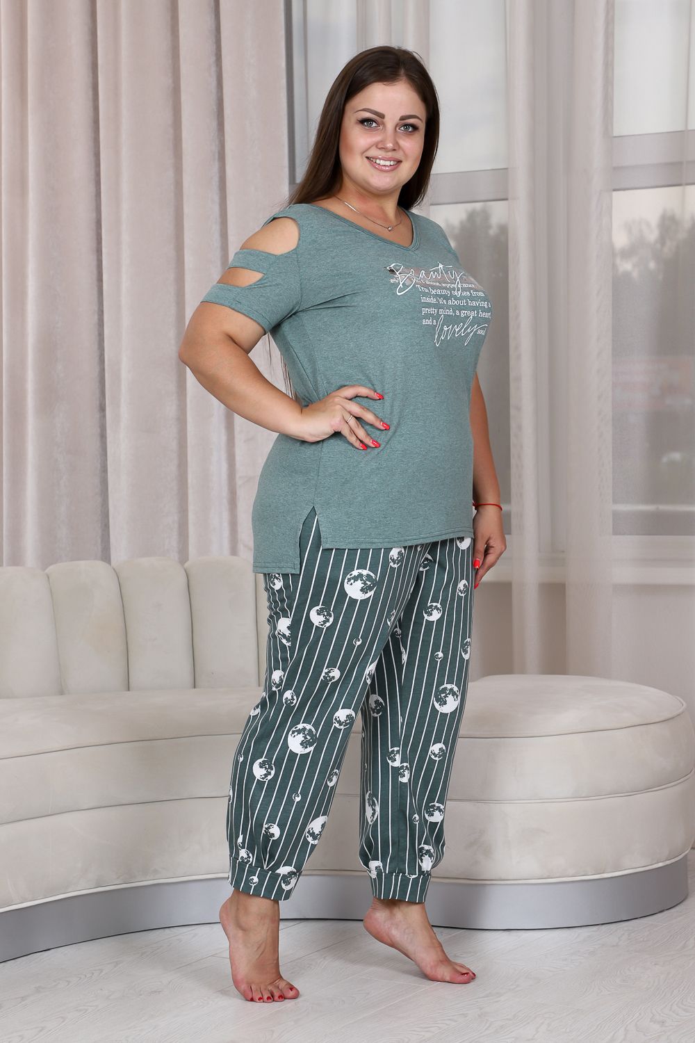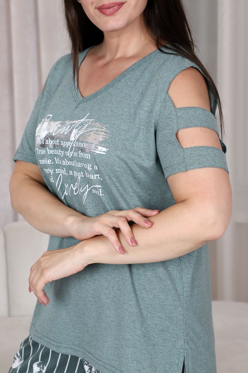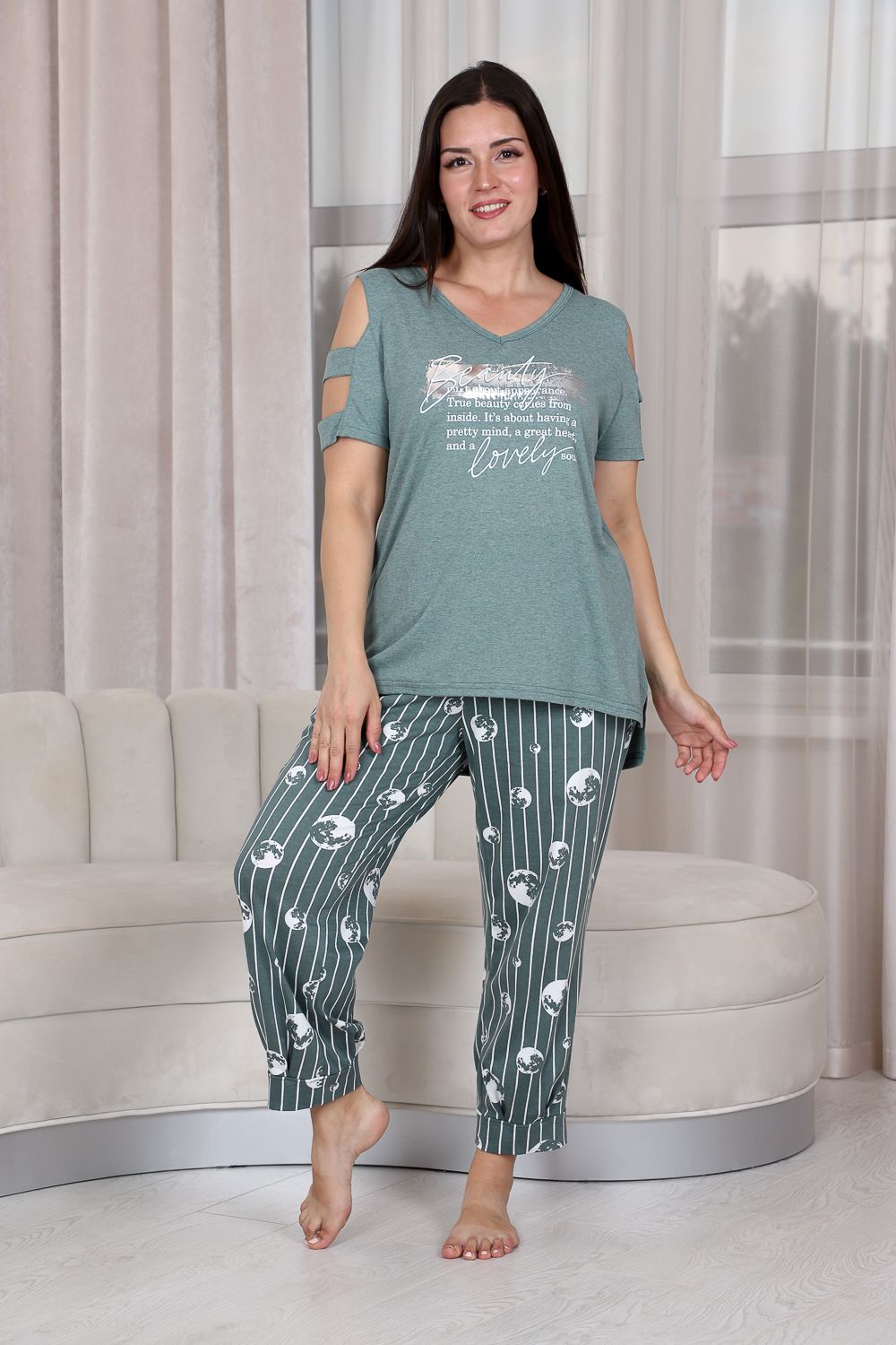 Костюм женский: туника и брюки. Туника прямого силуэта, вырез Y-образный. Полочка несколько короче спинки, сбоку разрезы. На полочке принт. Рукав не цельный, два хляста, расположенные через расстояние друг от друга, втачаны в боковые части рукава. Брюки свободные, "бананы", внизу передней и задней части по две встречные складки, манжеты. В брюках удобные внутренние карманы, пояс выполнен на многоигольной машине.