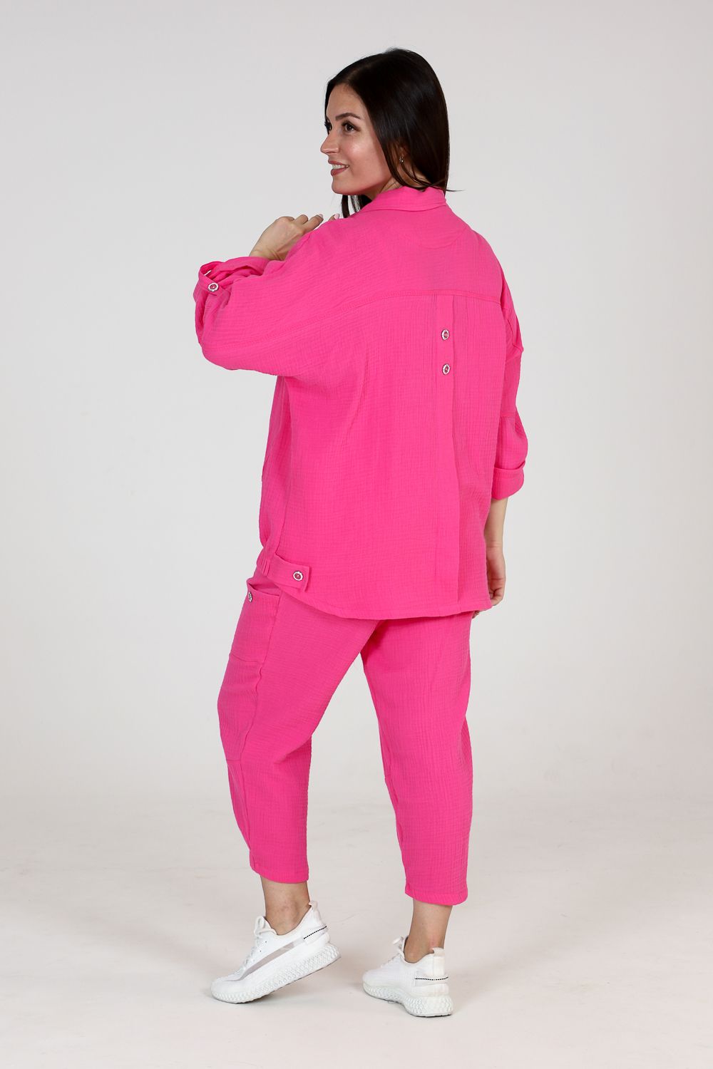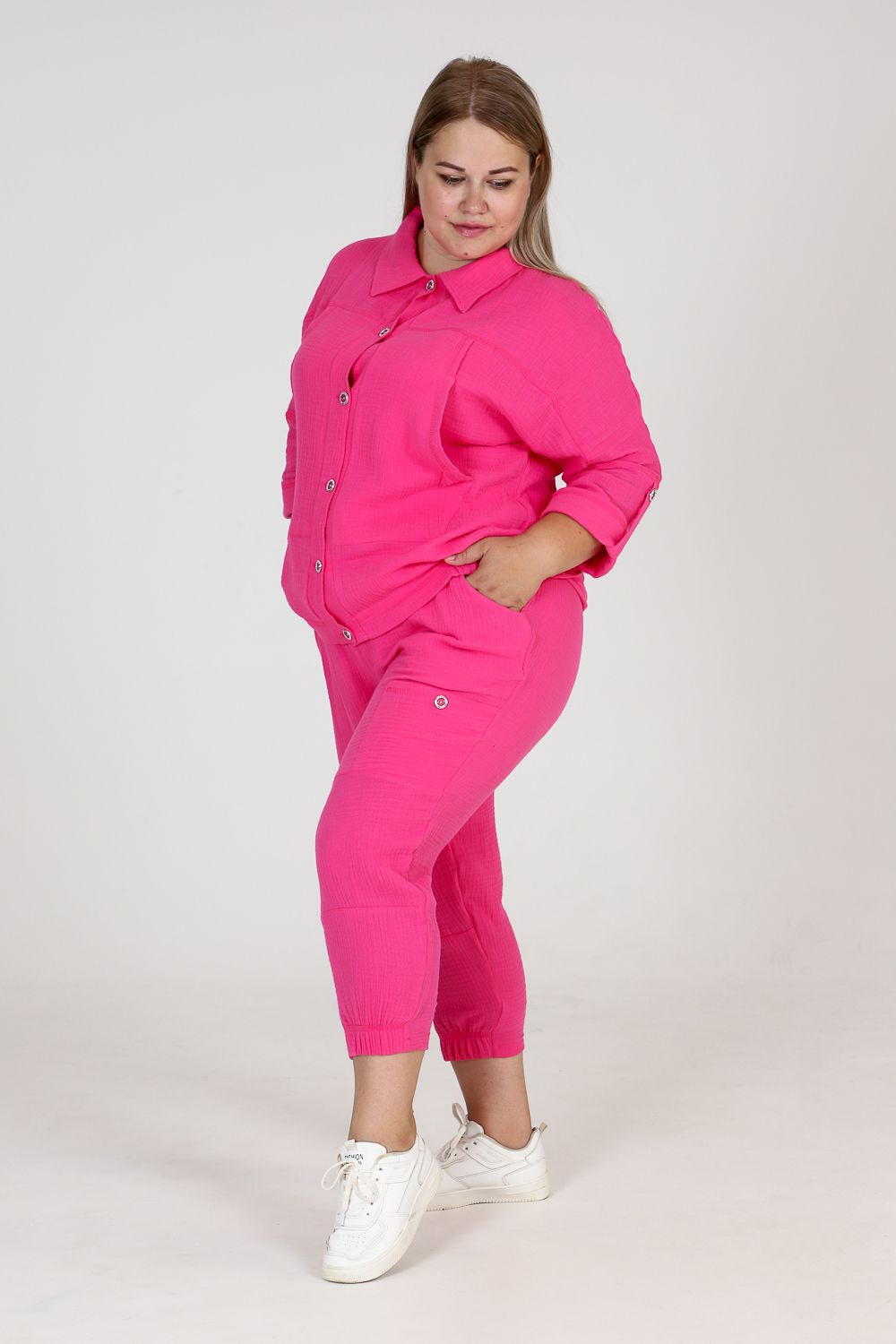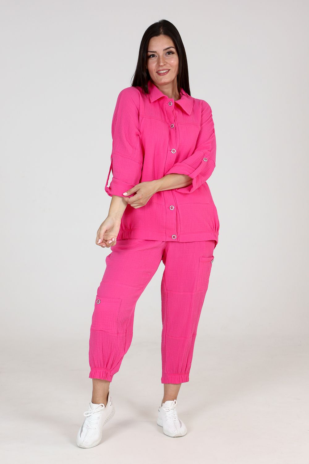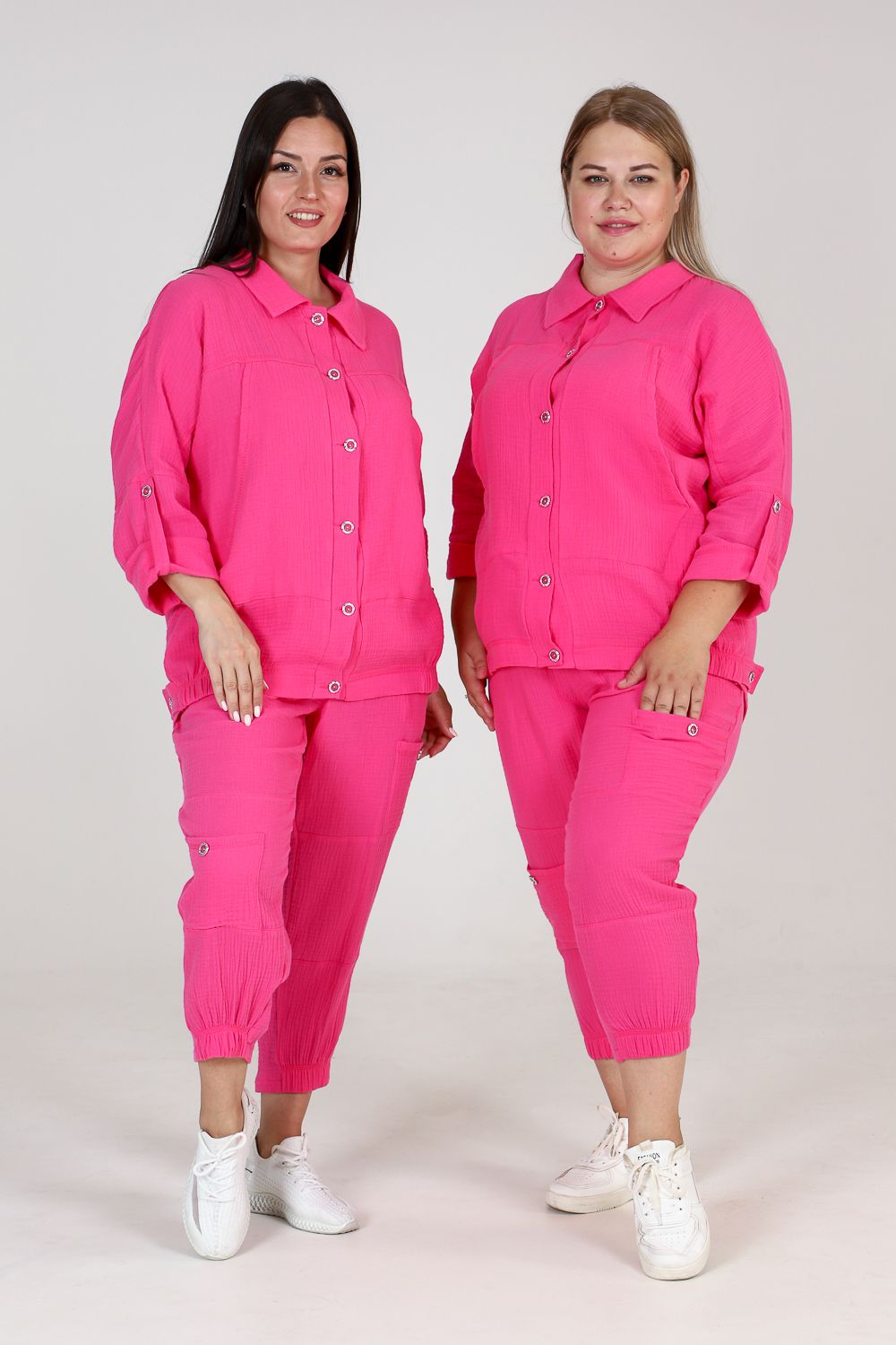 Костюм женский: Куртка и брюки. Куртка прямого силуэта, воротник втачной, на полочке кокетка и накладной карман типа "кенгуру", застежка на планке на петли - пуговицы (петли с глазком). Рукав цельнокроенный со швом с манжетой и хлястом. Внизу полочки пояс, сбоку пояса резинка. На спинке кокетка, по центру декоративная складка с двумя пуговицами. Внизу бокового две декоративные паты с пуговицами. Брюки свободные по бедрам, внизу передние половинки брюк собраны на резинку. Передняя часть брюк состоит из трех частей. В верхней части внутренние накладные карманы. Накладной карман на верхней левой и средней правой частях брюк. Пояс выполнен на многоигольной машине.